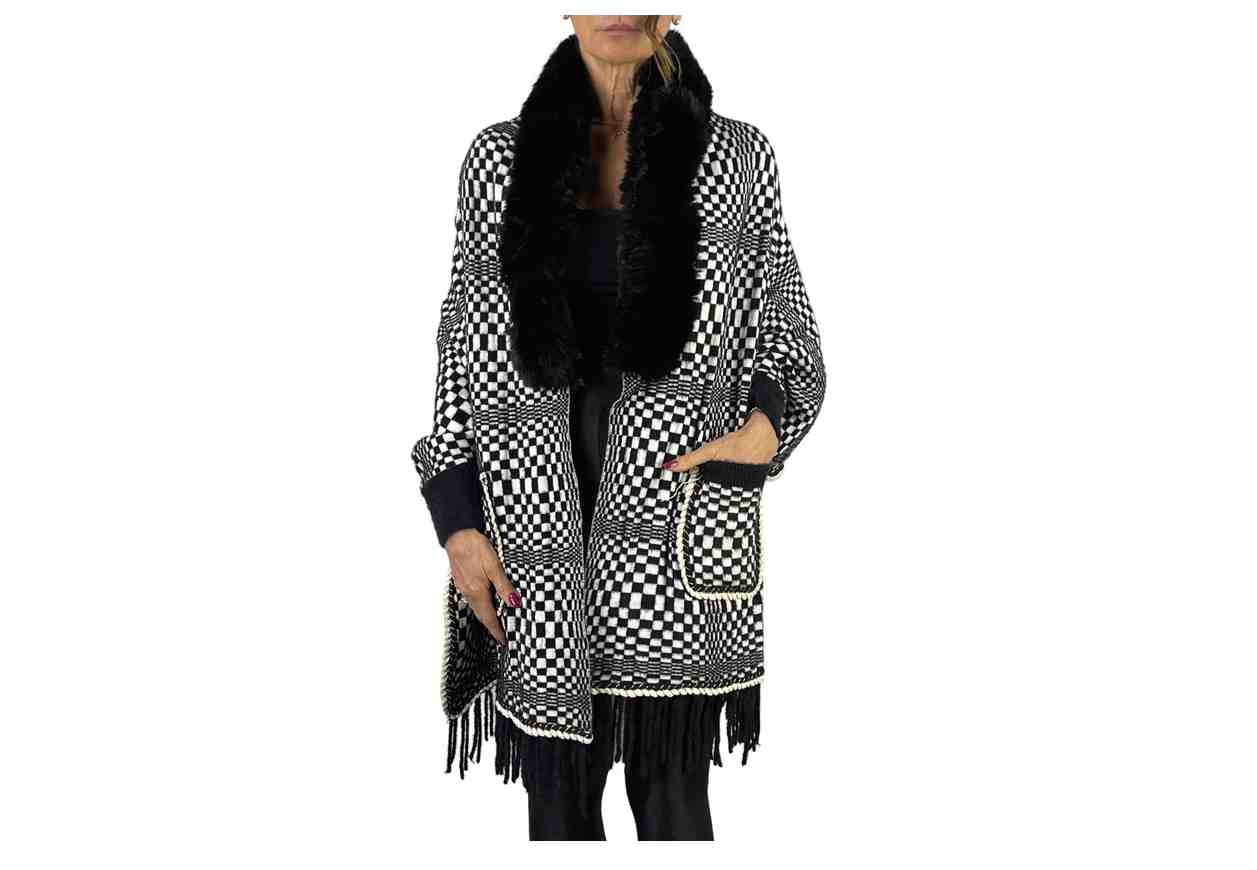 *PL Mantella in fantasia quadri, collo in ecopelliccia, tasche frontali.