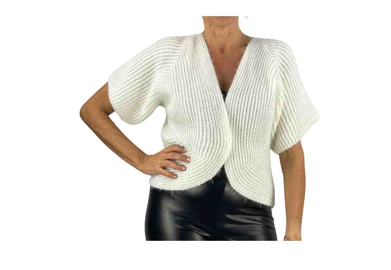 RENE’ BORDEN Cardigan corto, effetto ‘peluche’ in tinta unita, lavorazione a costine e maniche corte.