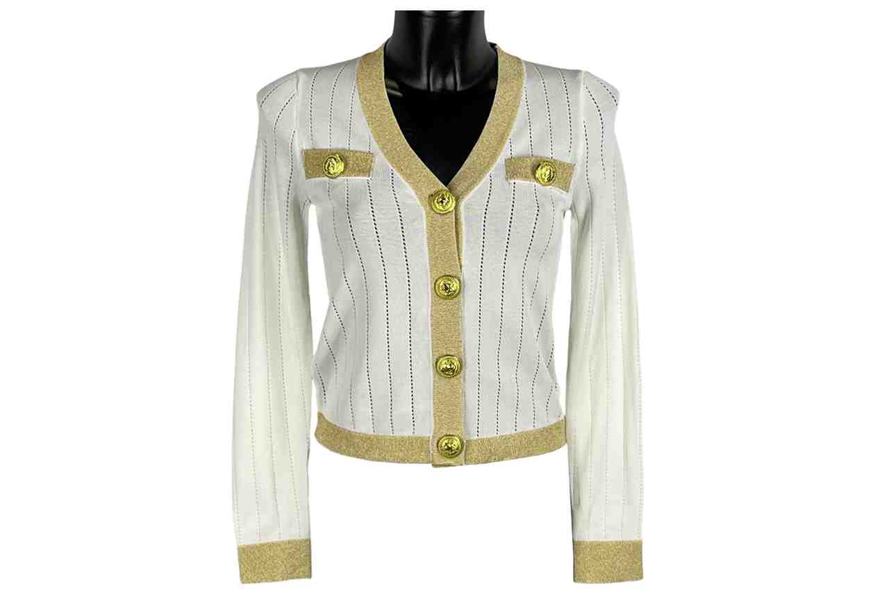 VR Cardigan bicolore traforato, dettaglio bottoni.