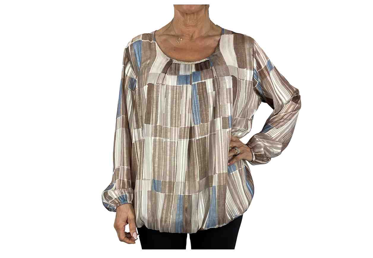 BU Blusa in voile in fantasia con filo lurex, dettaglio in strass su scollo.