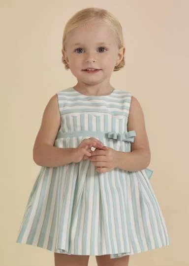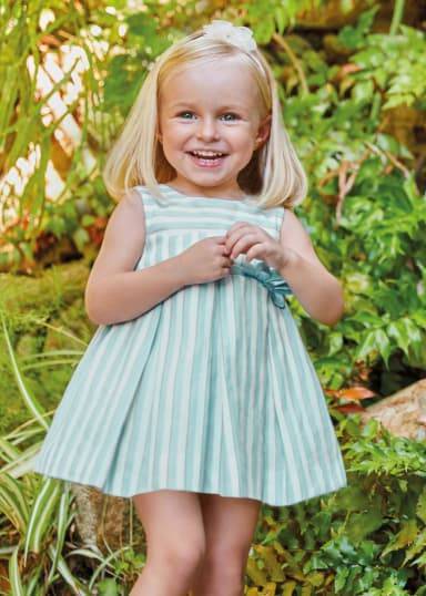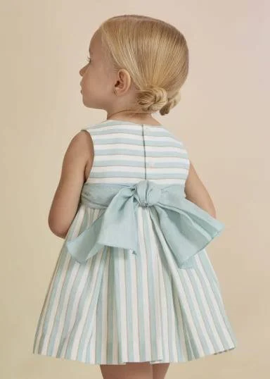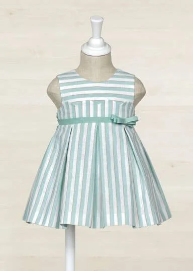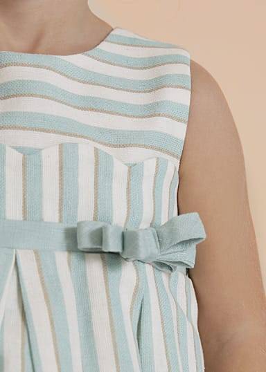Abito in lino a righe per neonata. Ondine sul petto. Cintura con fiocco. Tulle nel sottogonna per maggiore volume. Apertura con bottoni posteriori.
