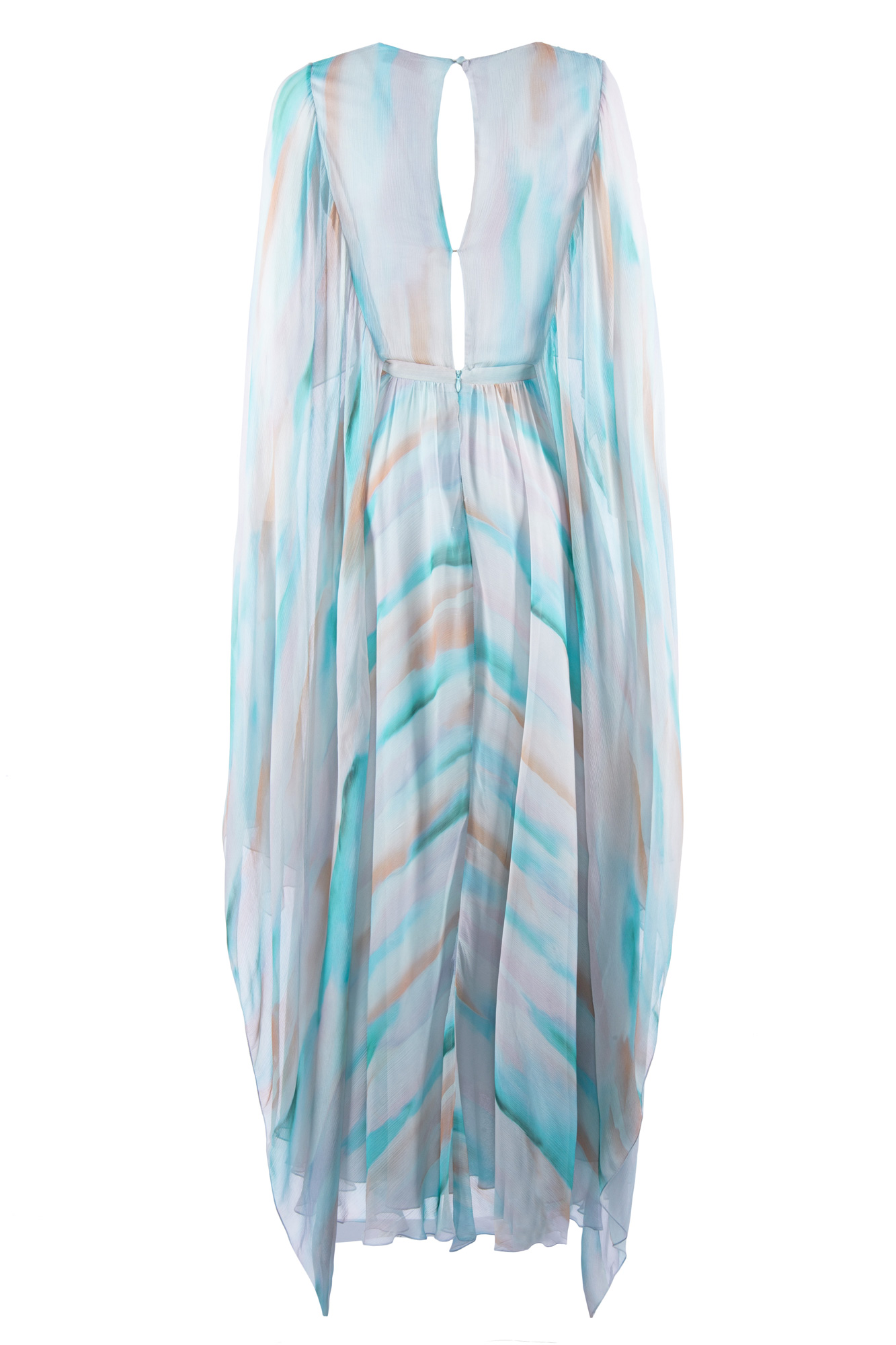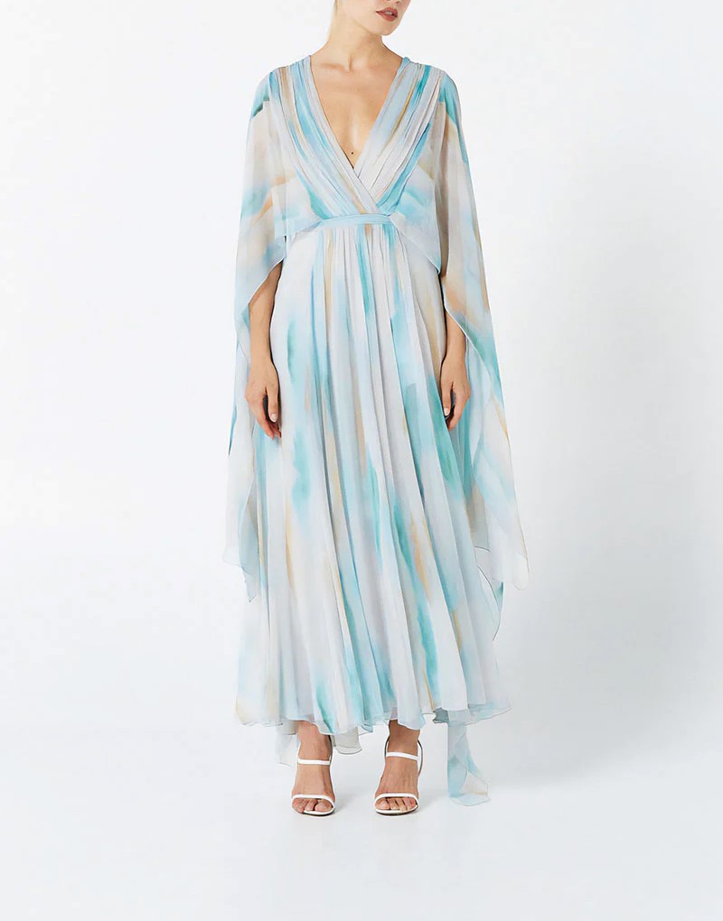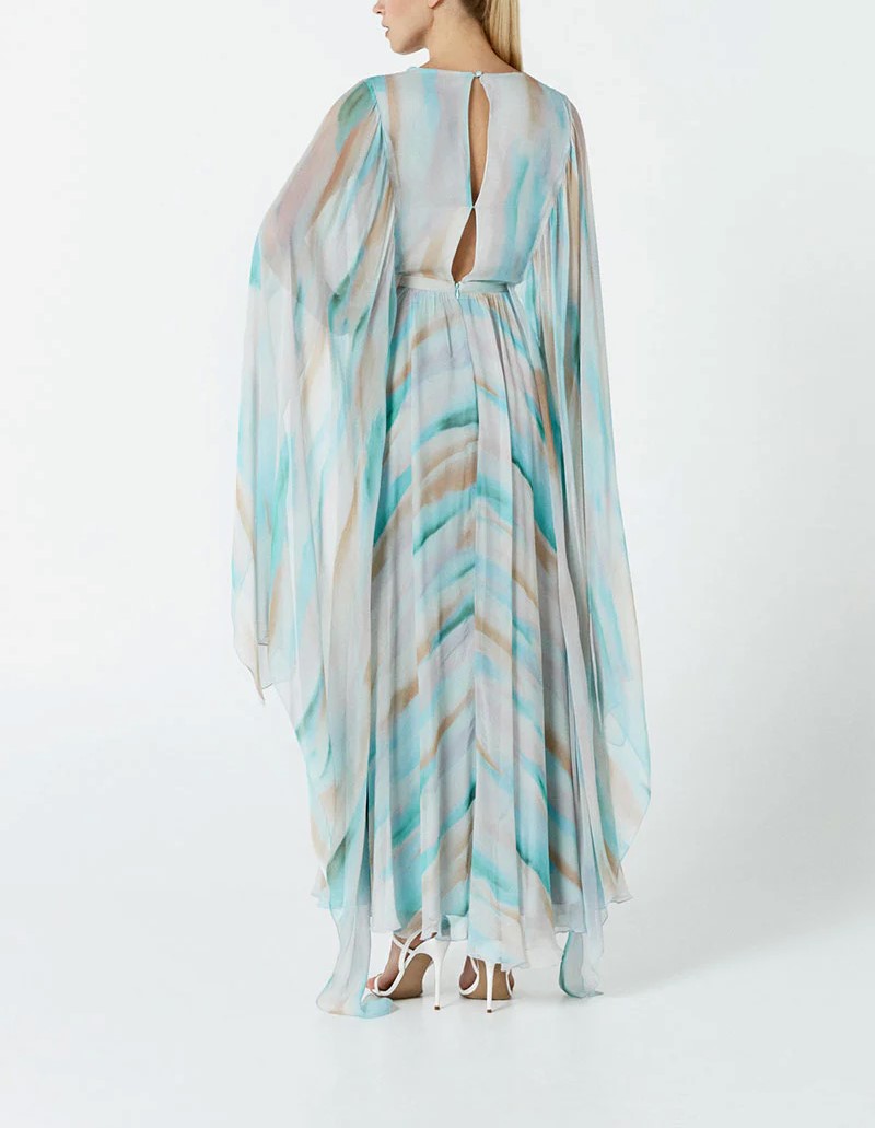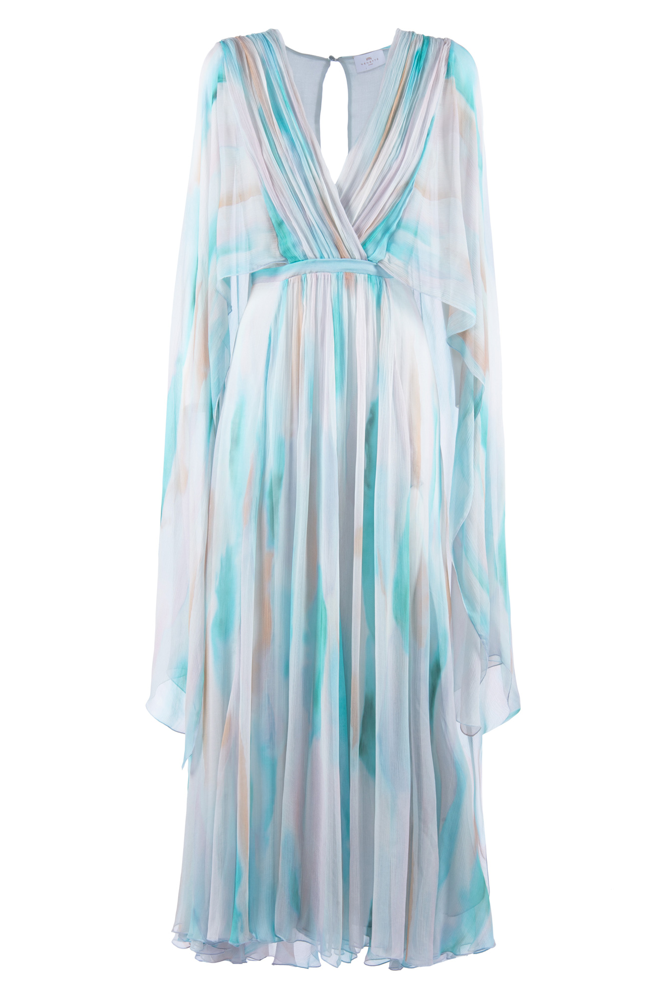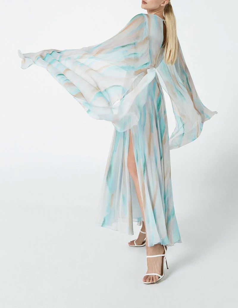 L ‘Abito Abisso NENETTE, รจ un abito lungo con maniche ampie in creponne stampato, scollatura a V, spacchi laterali e chiusura posteriore.