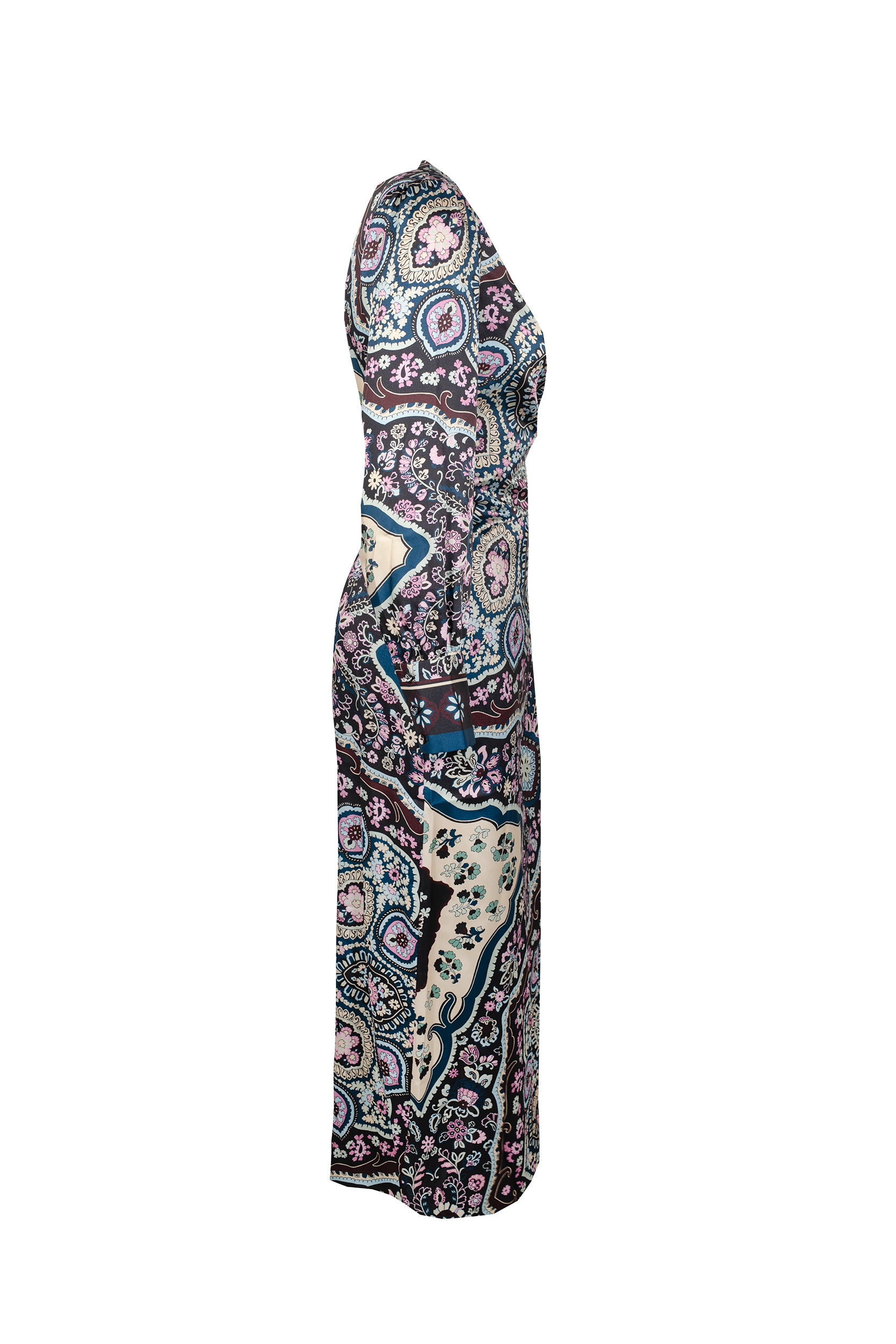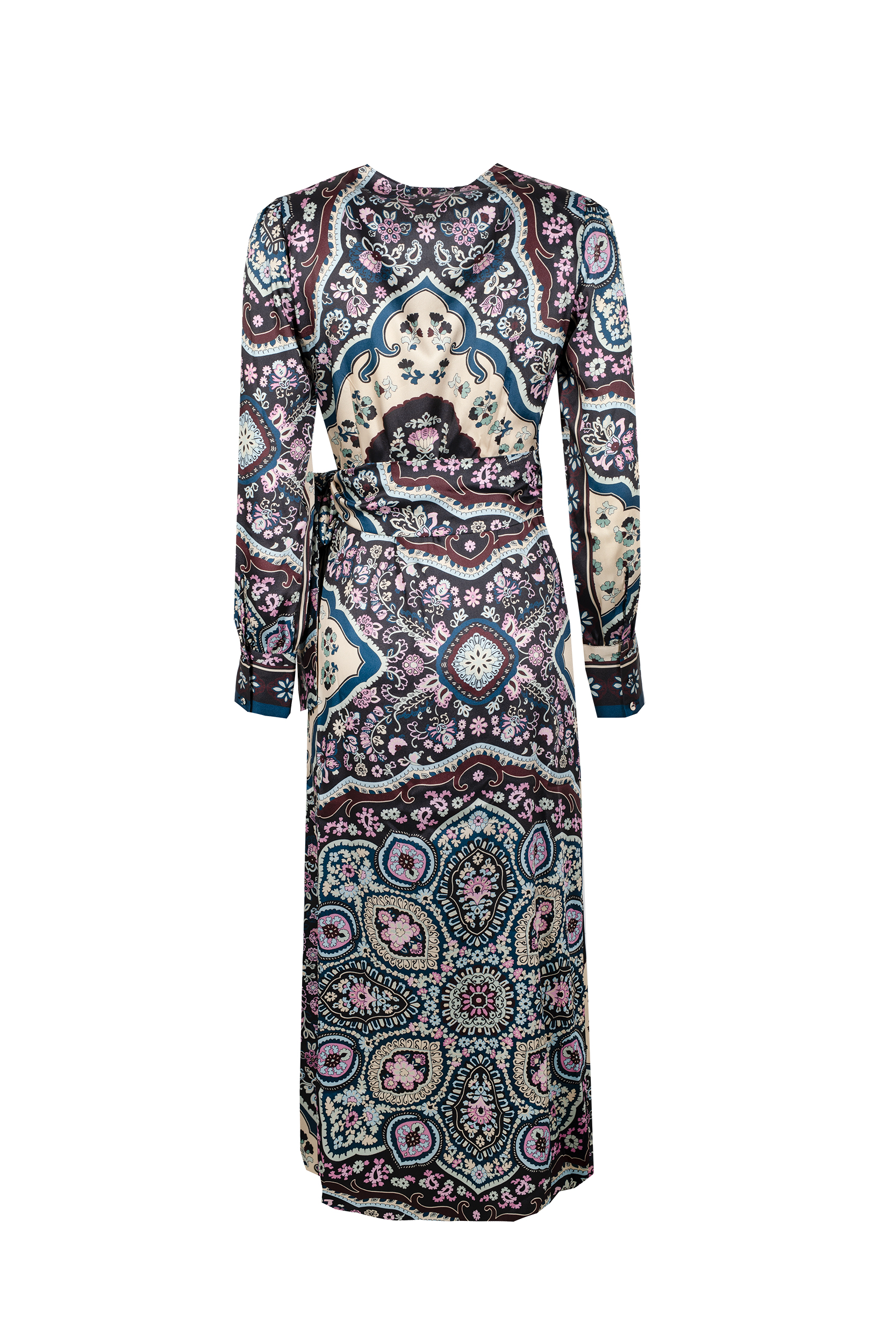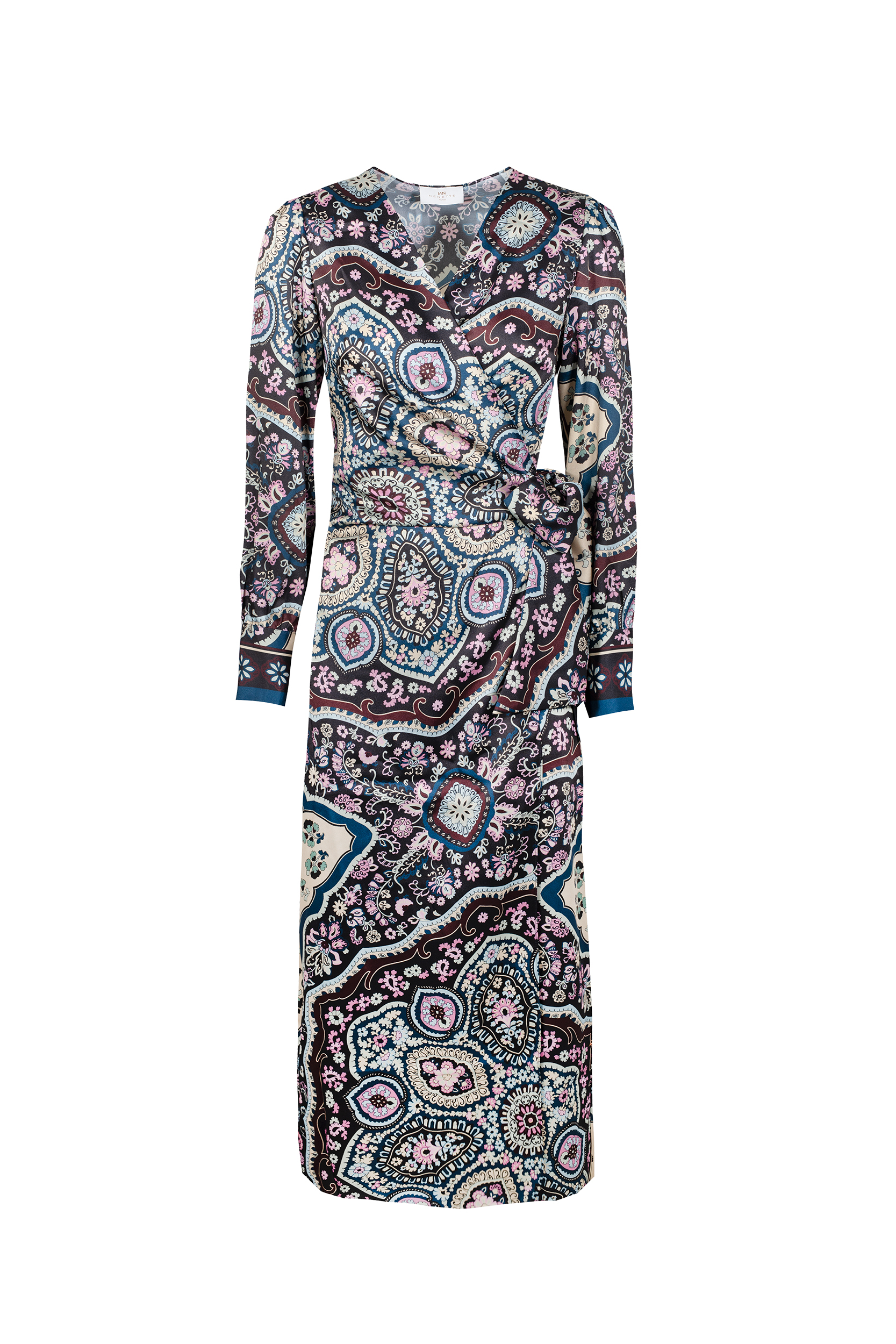 L’ Abito Amelia NENETTE, รจ una abito lungo incrociato in twill, con stampa folk, manica lunga con bottoni, scollatura a V.