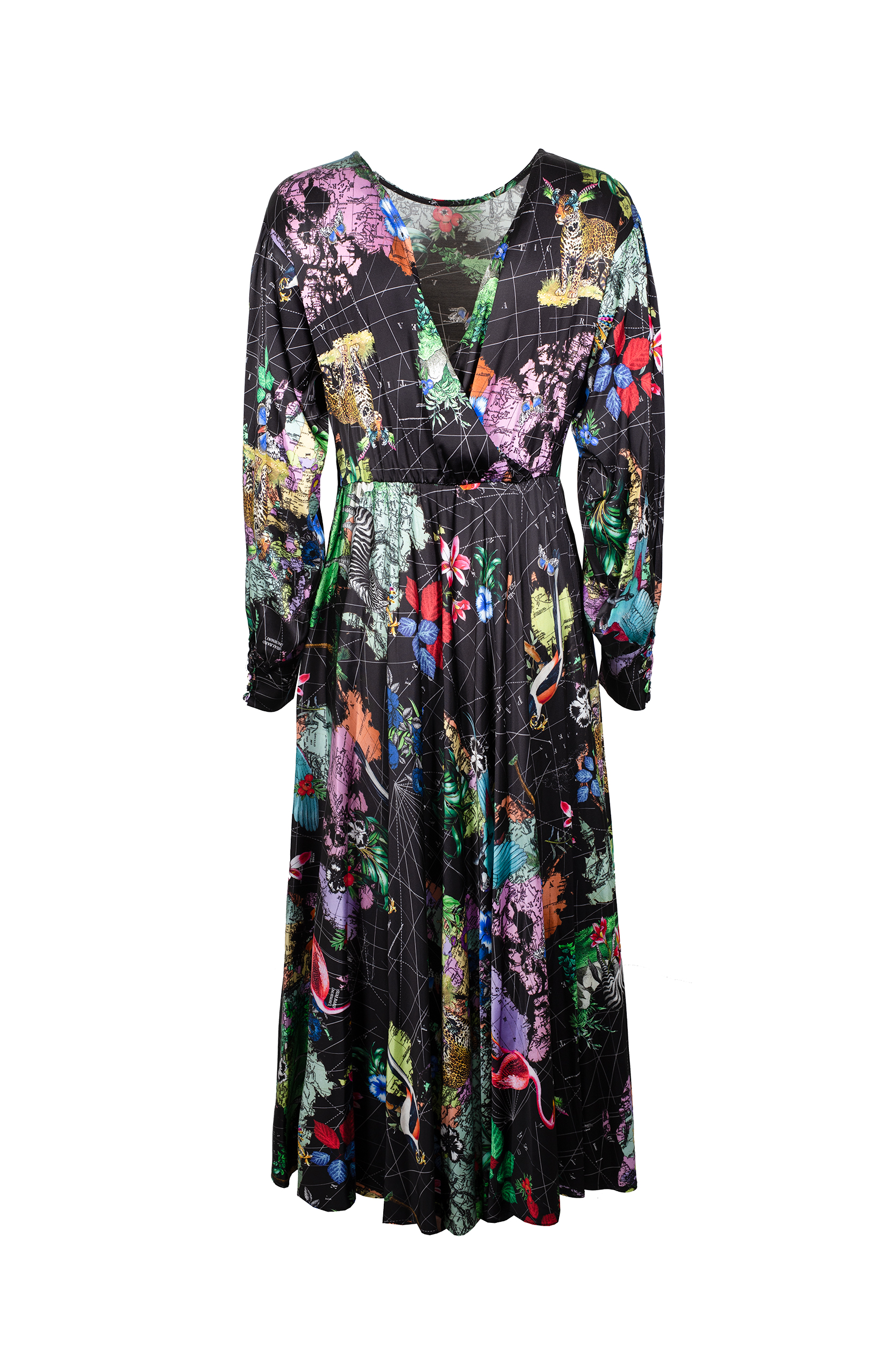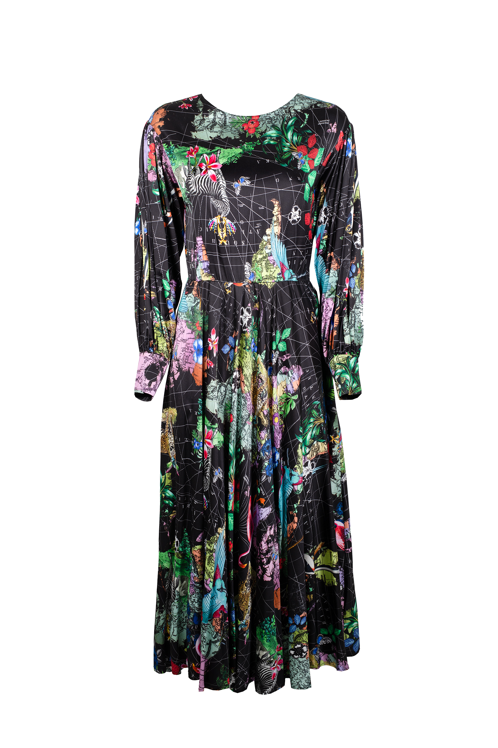 Abito lungo stampa animalworld in viscosa elasticizzata Manica lunga Accollato sul davanti Aperto sulla schiena con chiusura a bottoncino Composizione: 97% Viscosa 3% Elastan Made in Italy