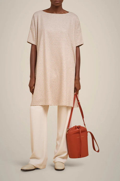 Abito girocollo in panno cashmere Spalla bassa Manica corta Tasche inserite lungo il taglio dei fianchi frontali Composizione: 55% KASHMIR 40% SETA 5% ALTRE FIBRE Made in ITALY Vestibilitร Relax