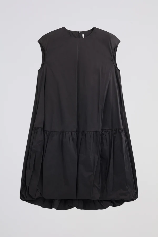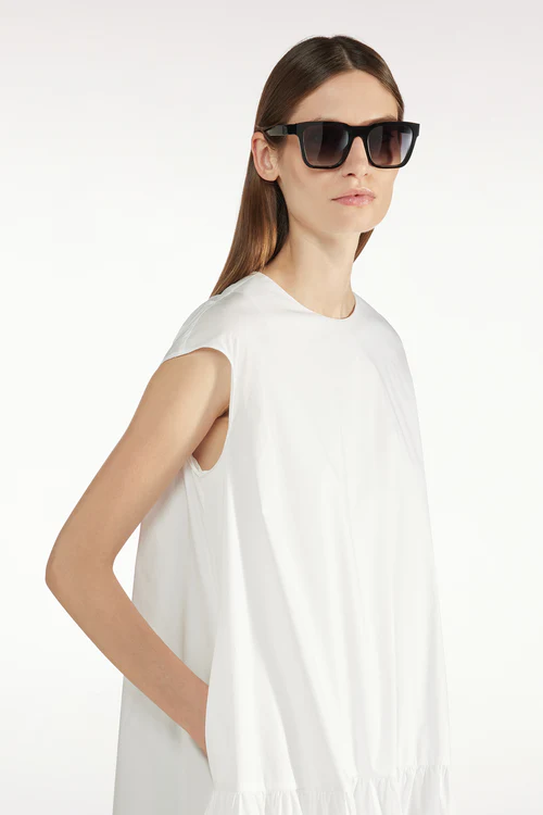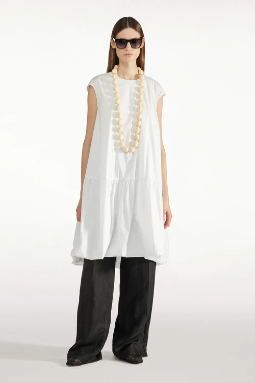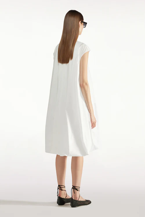 L’ Abito Cleo LIVIANA CONTI, รจ un abito midi in popeline stretch, spalla scesa, tasche sui fianchi, ampio a palloncino sul fondo.