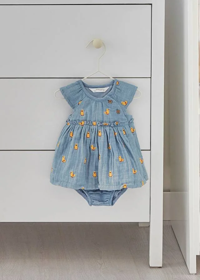 Abito ABITO COPRI PANNOLINO MAYORAL CON FASCIA ABBINATA DENIM CON PULCINI in cotone a fantasia ricamata, chiusura laterale con clips e bottoncini, foderato in cotone, in coordinato fascia con finto nodo ed elastico sul retro. In dotazione coulotte copri pannolino in cotone.