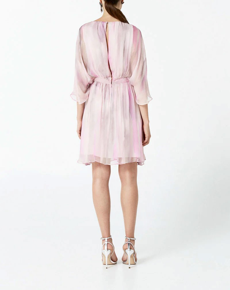 L’ Abito corto Aries NENETTE, รจ un abito corto in creponne stampato, manica 3/4 ampia, chiusura posteriore.