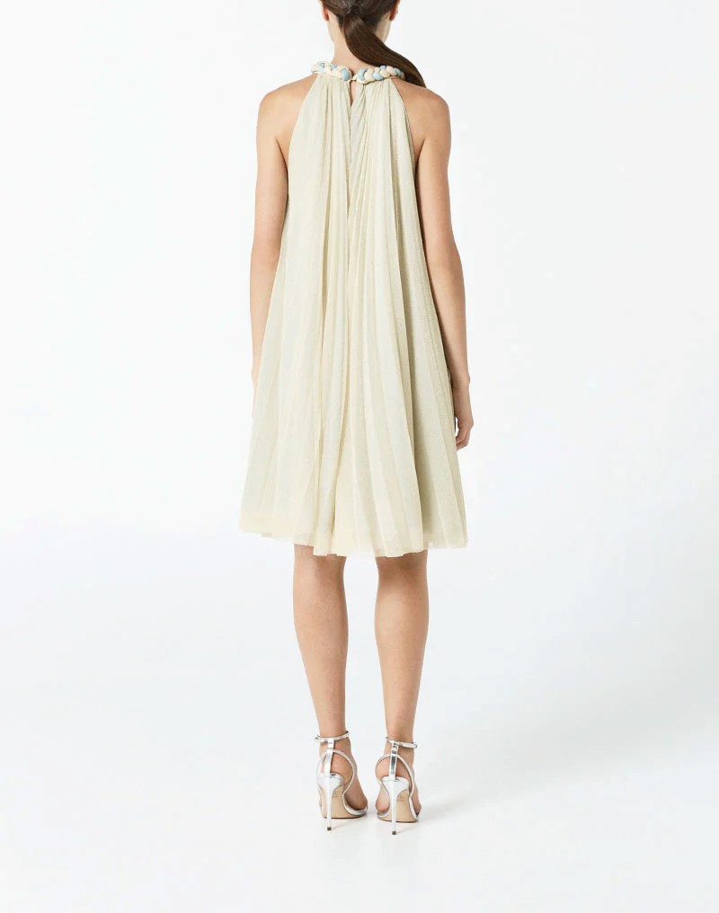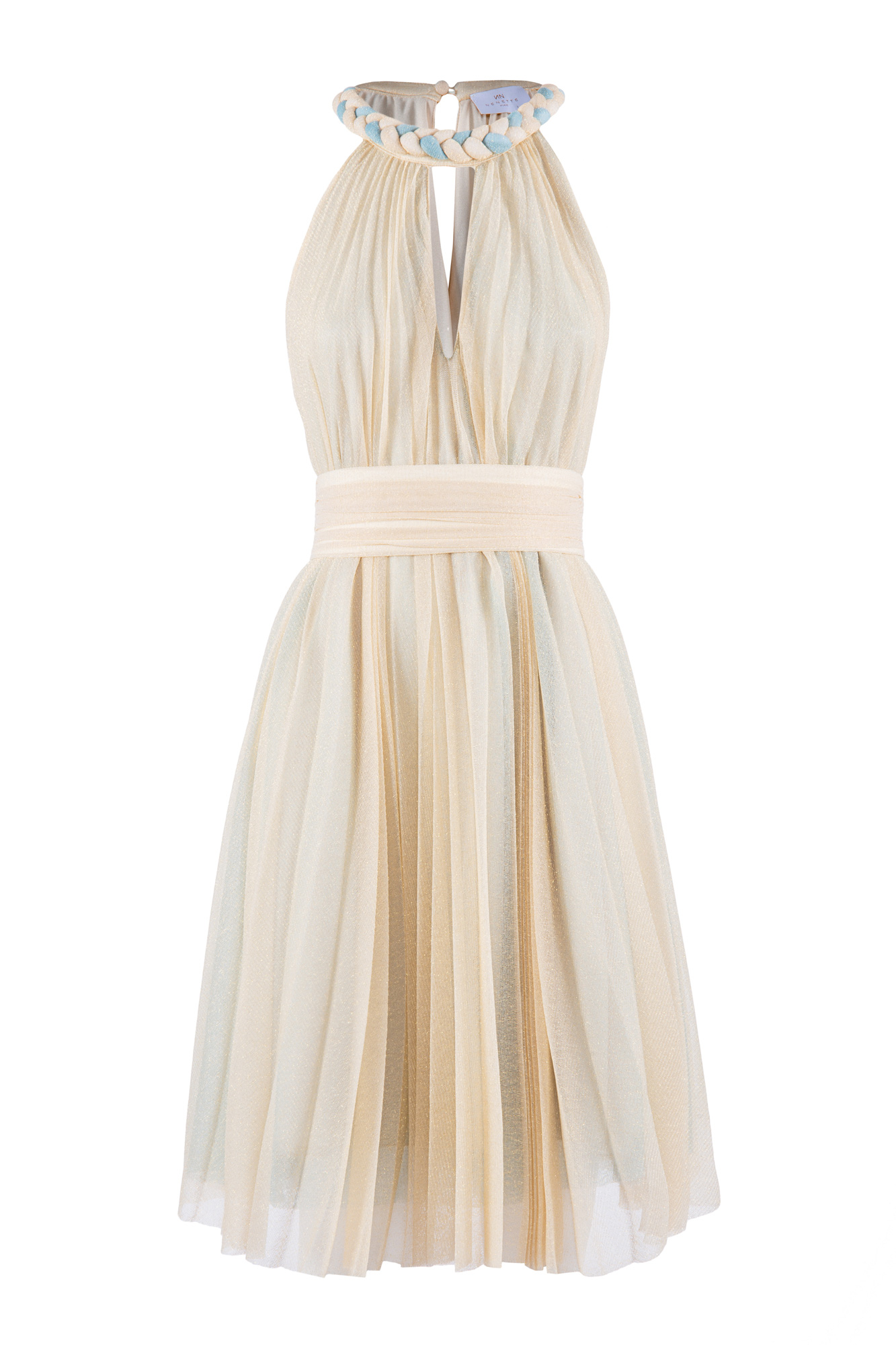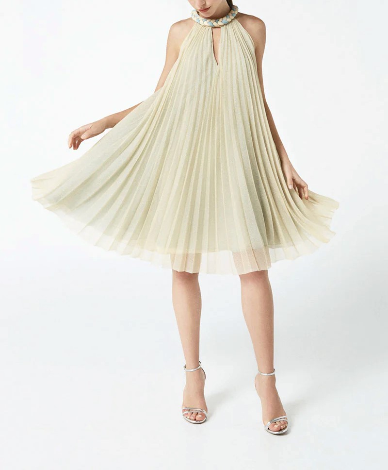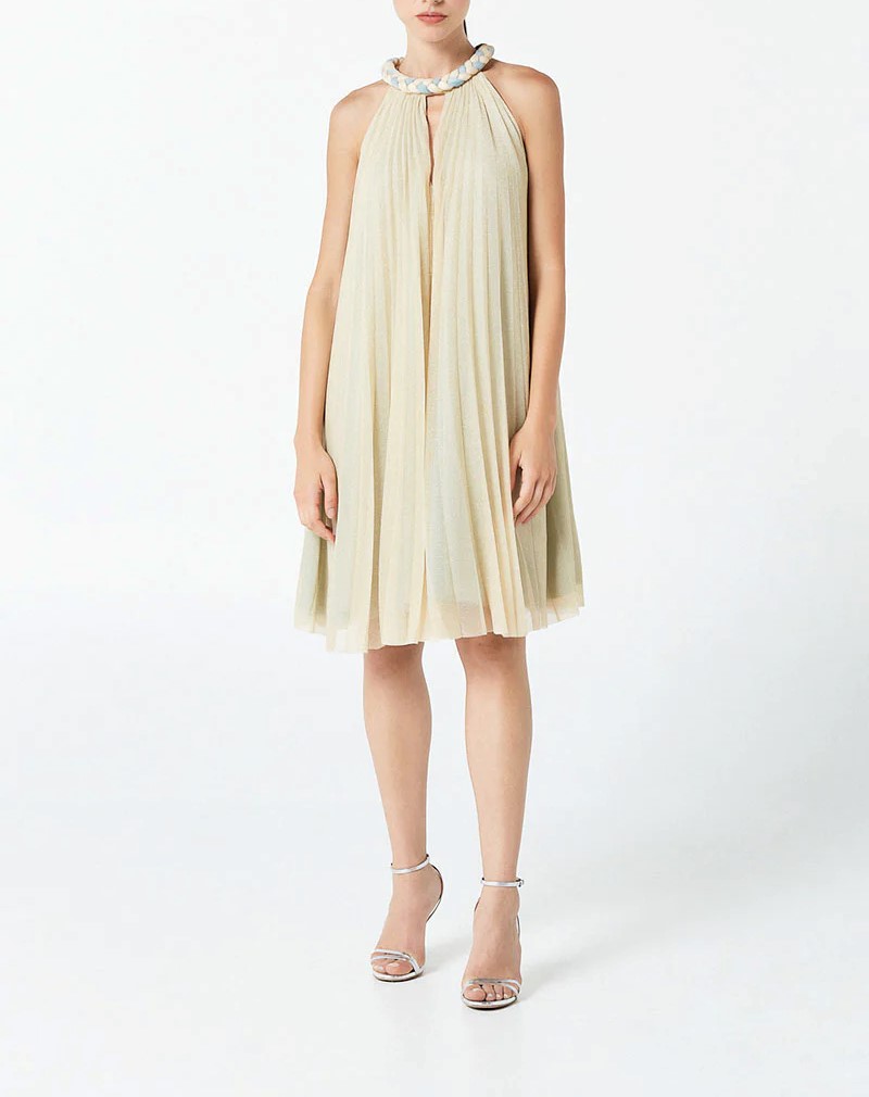 L’ Abito corto Asia NENETTE, รจ un abito corto bicolorecon scollo all’americana, plissettato con cintura in jersey lurex.