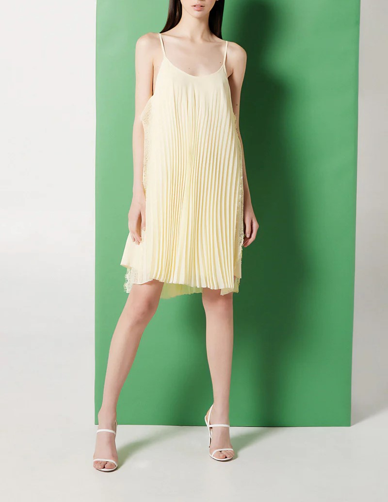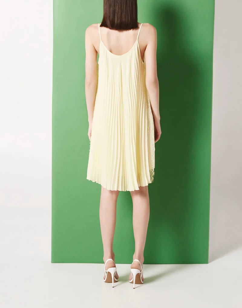 L ‘Abito corto Autumn NENETTE, รจ un abito corto in georgette aperto con dettagli in pizzo laterale e cintina.