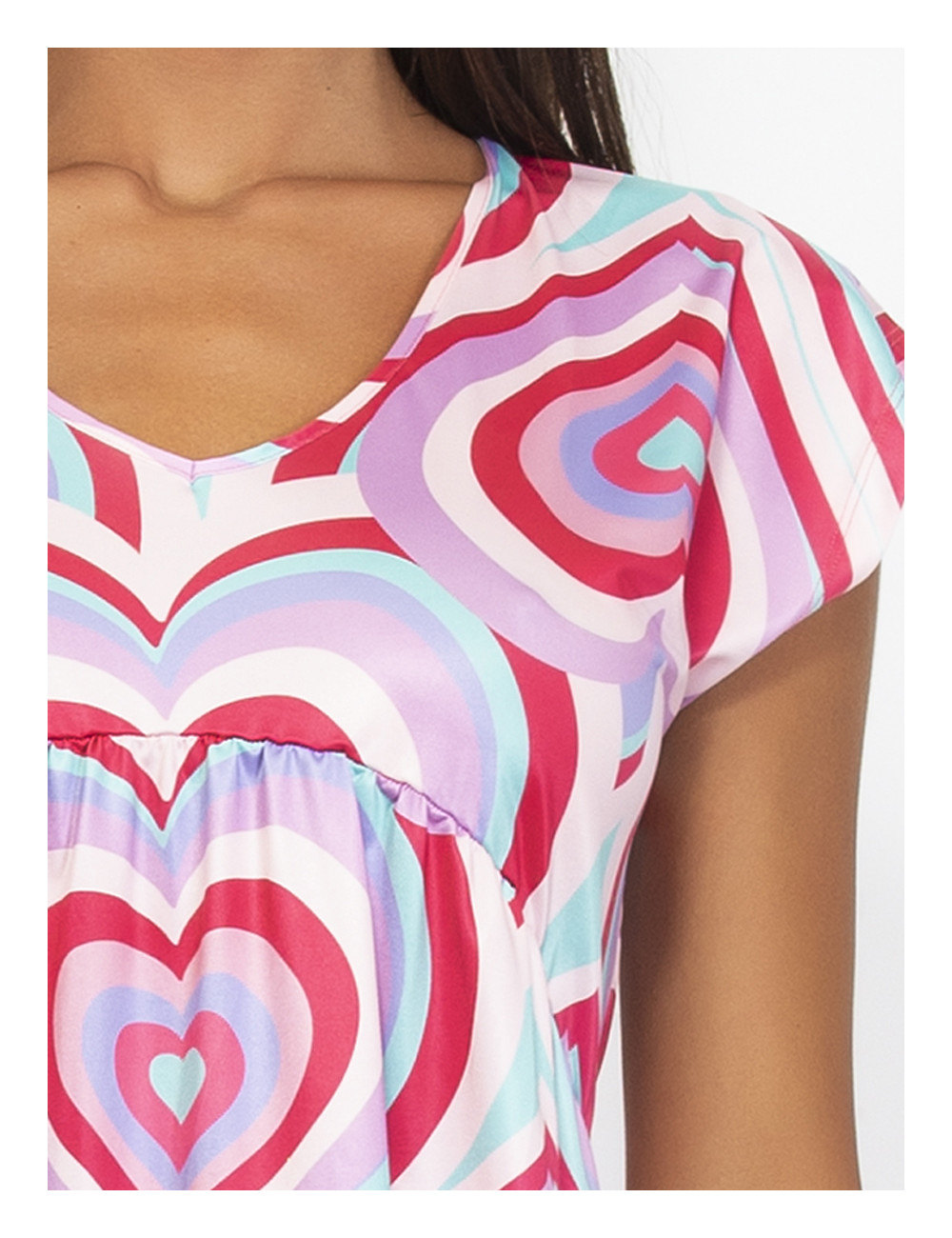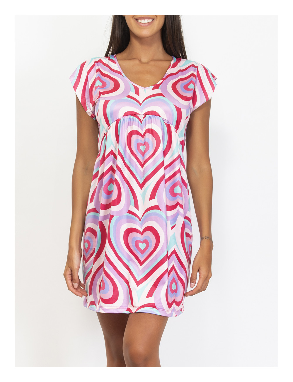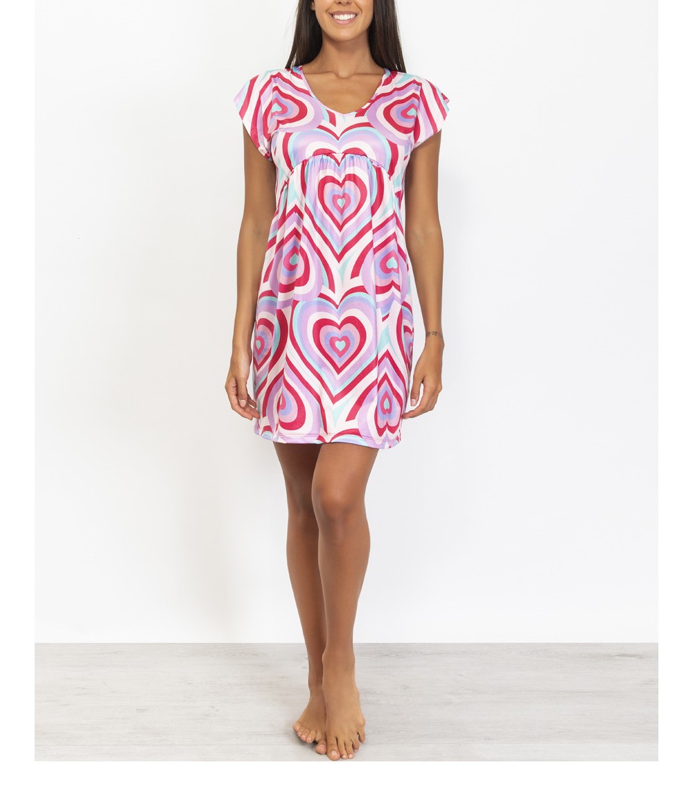 L’ Abito corto cuore optical VERDISSIMA, รจ un abito corto stampa cuore optical, scollatura a V, manica corta. Ideale come fuori acqua in abbinamento ai costumi della stessa fantasia.