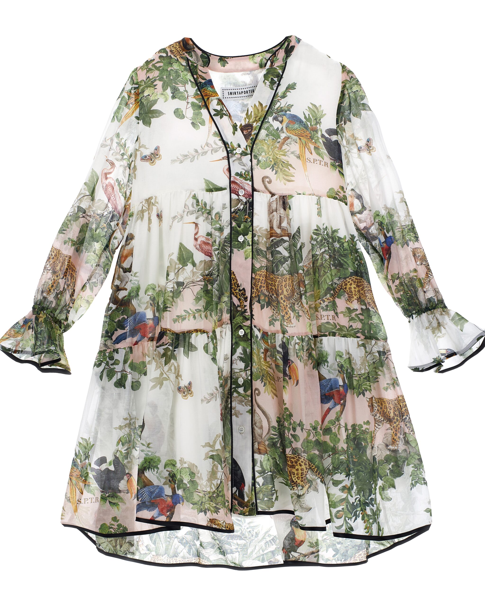 L’ abito corto fantasia SHIRTAPORTER, รจ un abito corto a fantasia giungla in misto seta a balze con piping.
