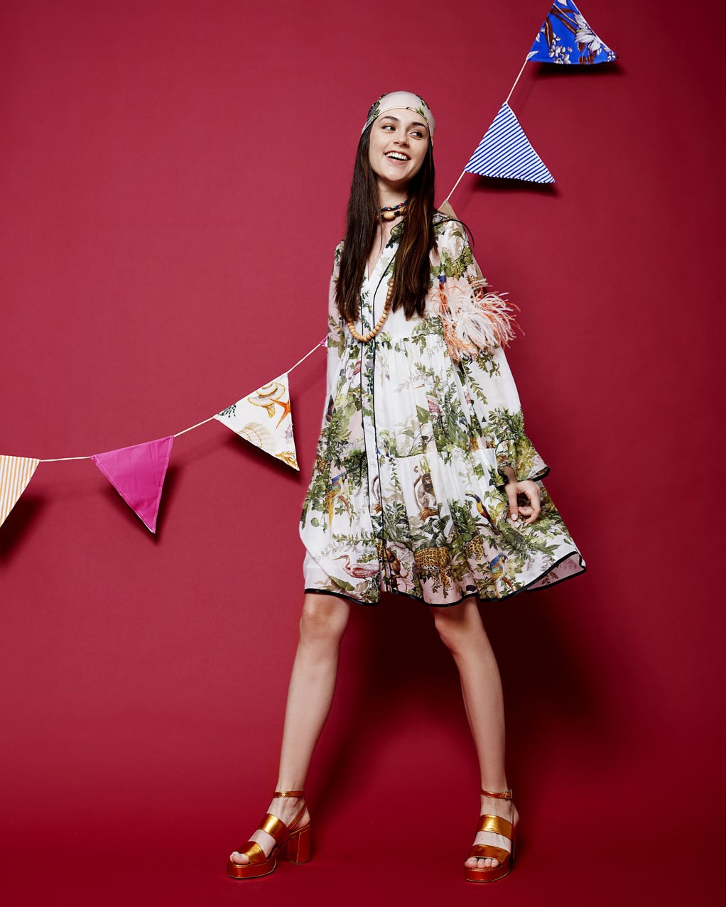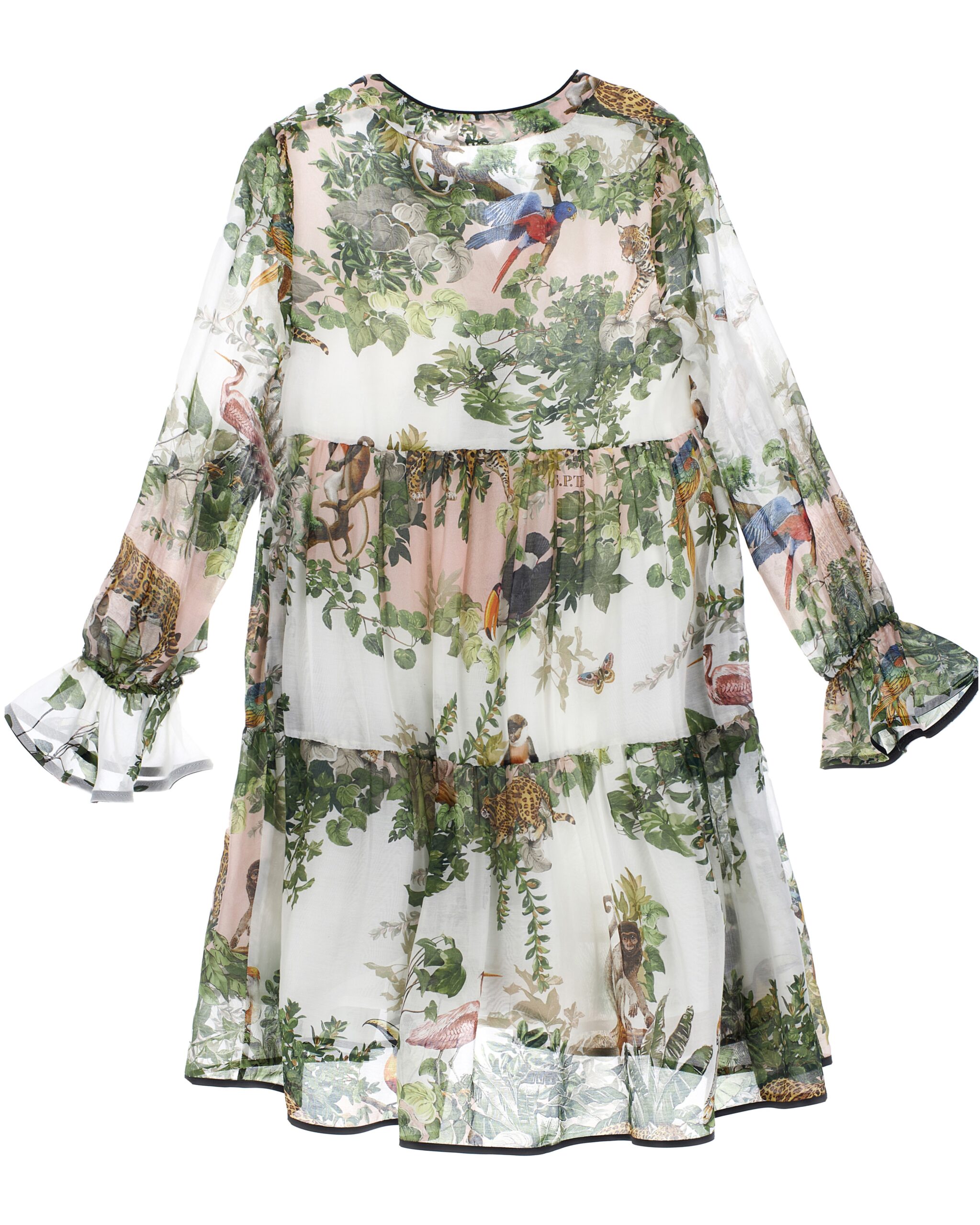 Abito corto a fantasia giungla Scollatura ampia Rifiniture in raso a contrasto di colore Apertura con bottoni Manica lunga Balze con piping Composizione: 70% Cotone 30% Seta Made in Italy