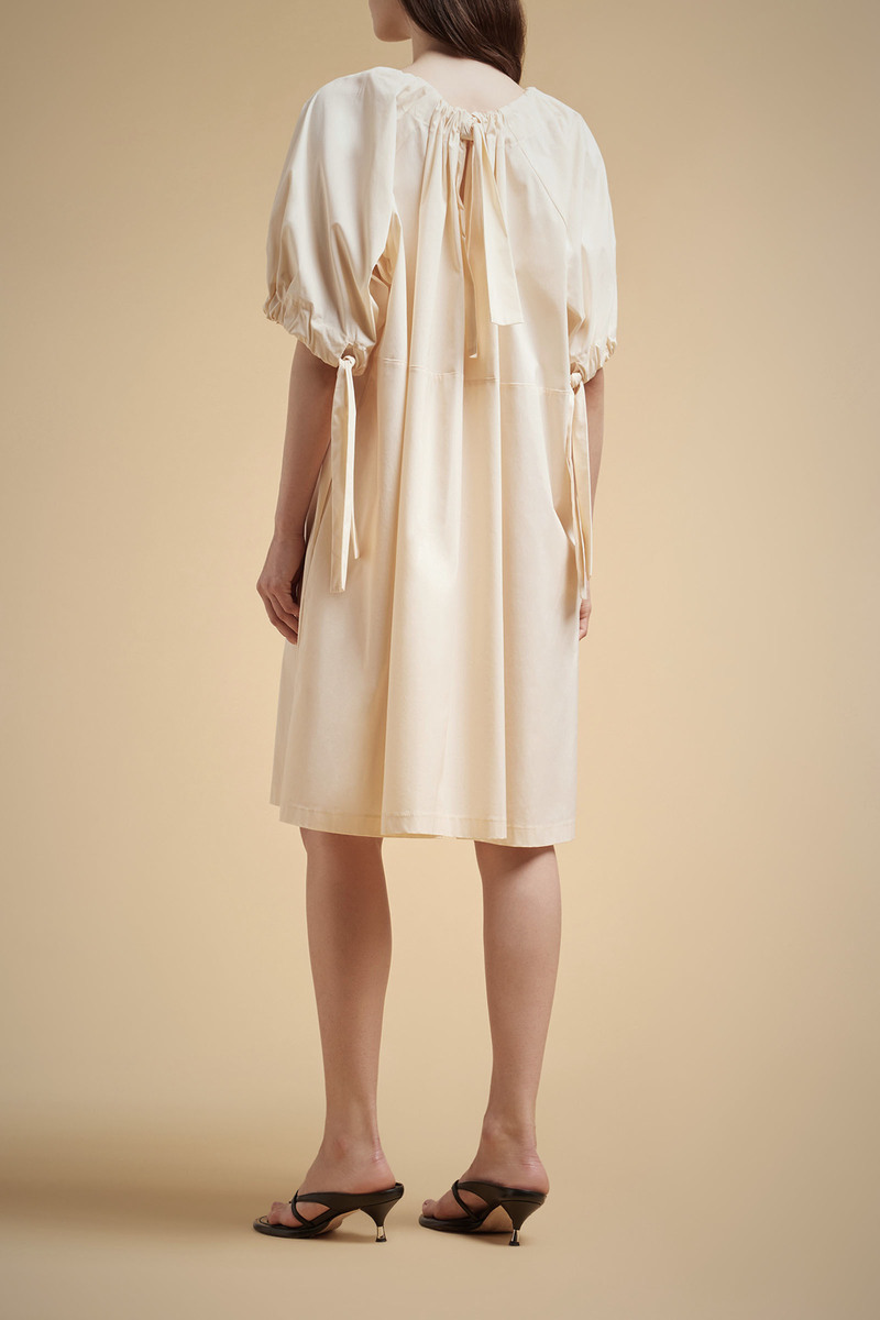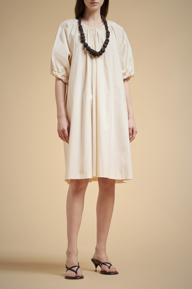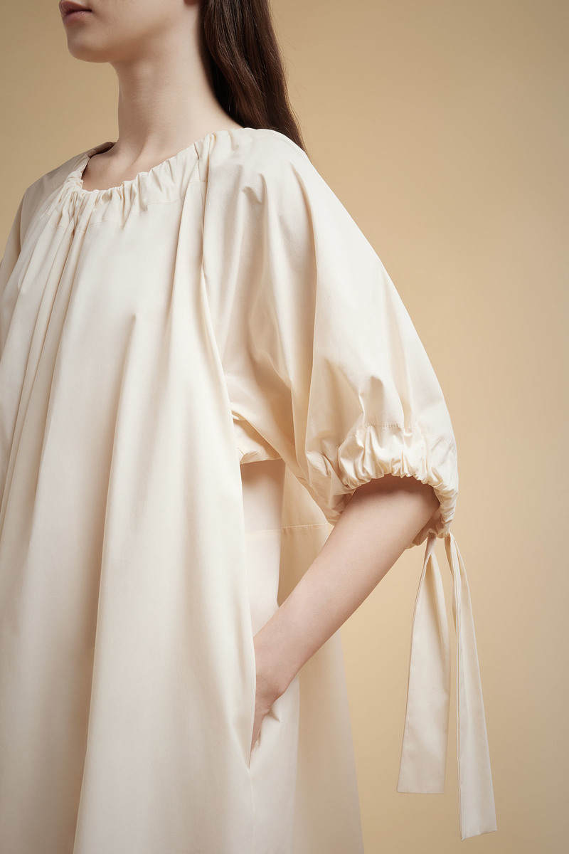 L’ Abito coulisse LIVIANA CONTI, รจ un abito in tela di cotone con scollo a barca e coulisse al girocollo che crea arriccio, taglio raglan con maniche voluminose con polsini arricciati da coulisse.