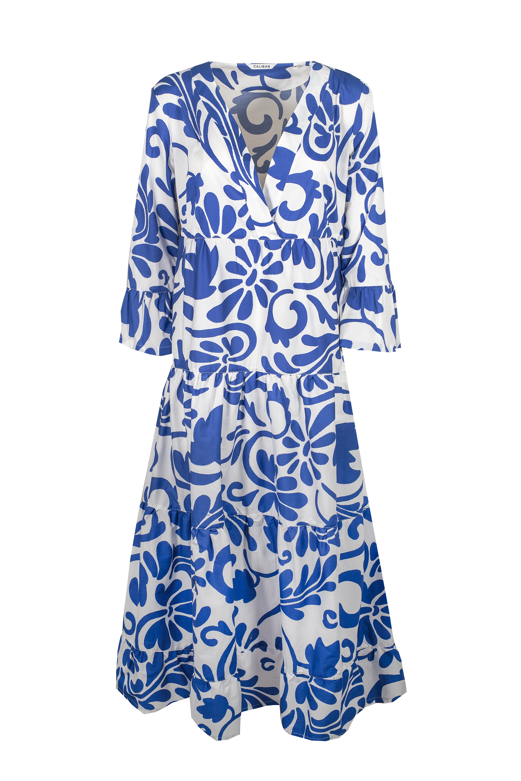 L’ Abito fantasia CALIBAN, รจ un abito lungo in cotone elasticizzato, a fantasia floreale, manica 3/4, scollatura a V con balza sul fondo.