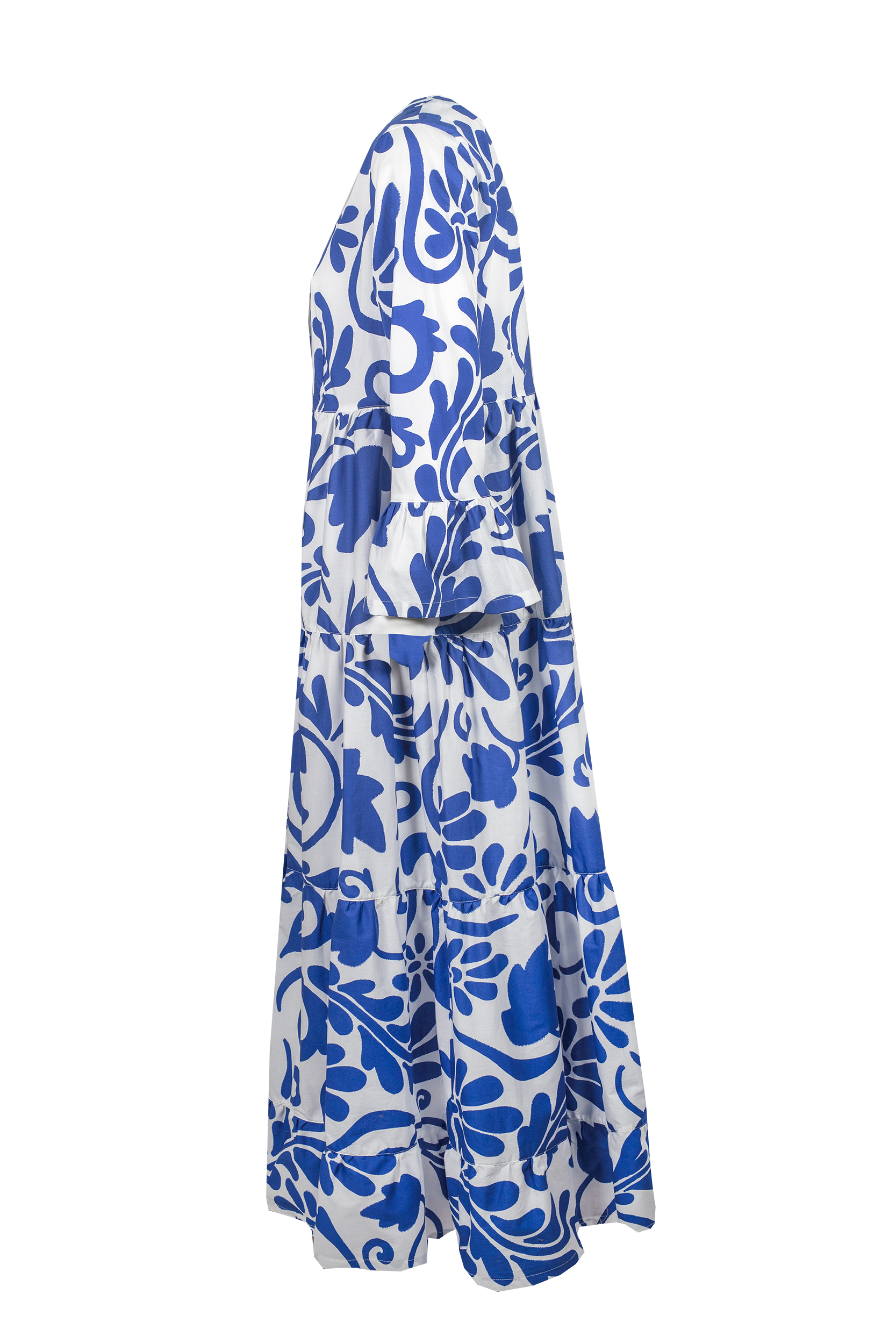 Abito lungo in cotone elasticizzato Fantasia floreale Manica 3/4 Scollatura a V Balza sul fondo Composizione: 97% Cotone 3% Elastan