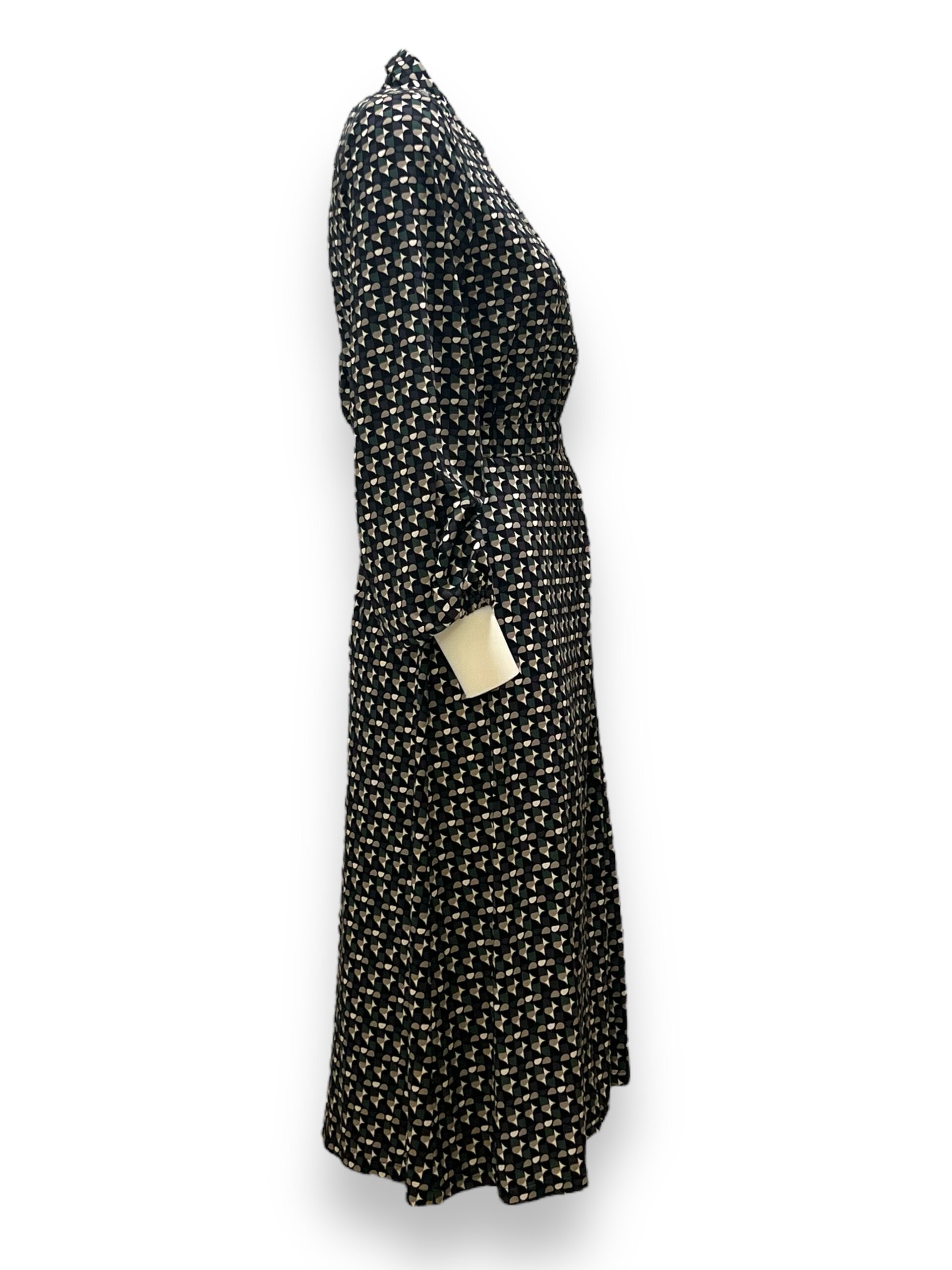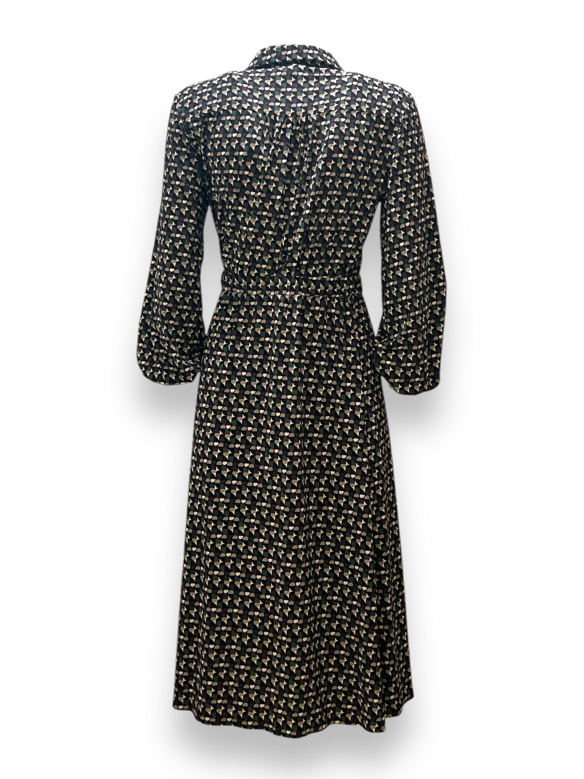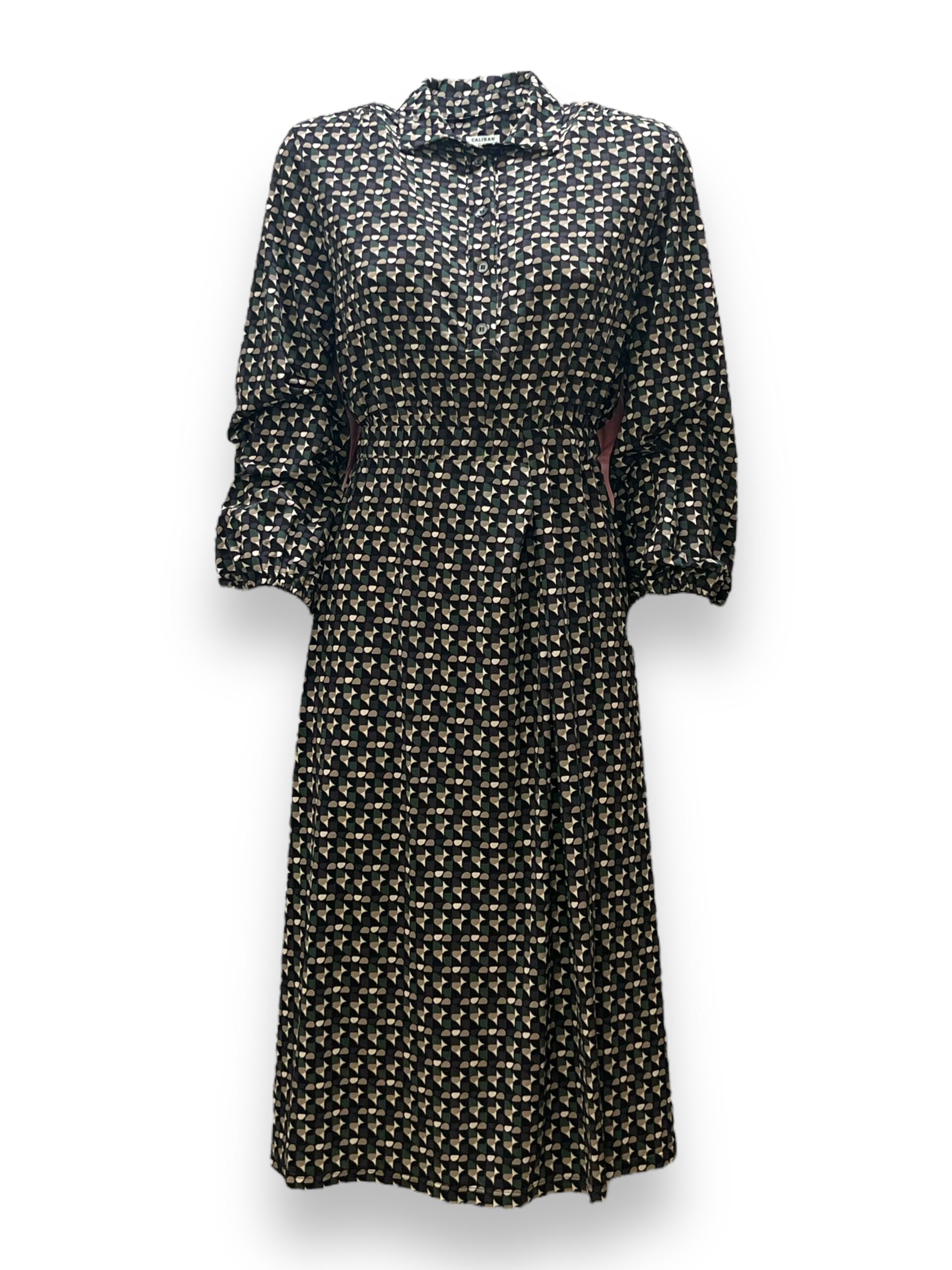 Abito lungo a fantasia geometrica Tessuto Skin Like Elasticizzato in vita per una migliore vestibilitร Scollo a polo a cinque bottoni Manica a sbuffo Polsino elasticizzato Composizione: 85% Poliammide 15% Elastan
