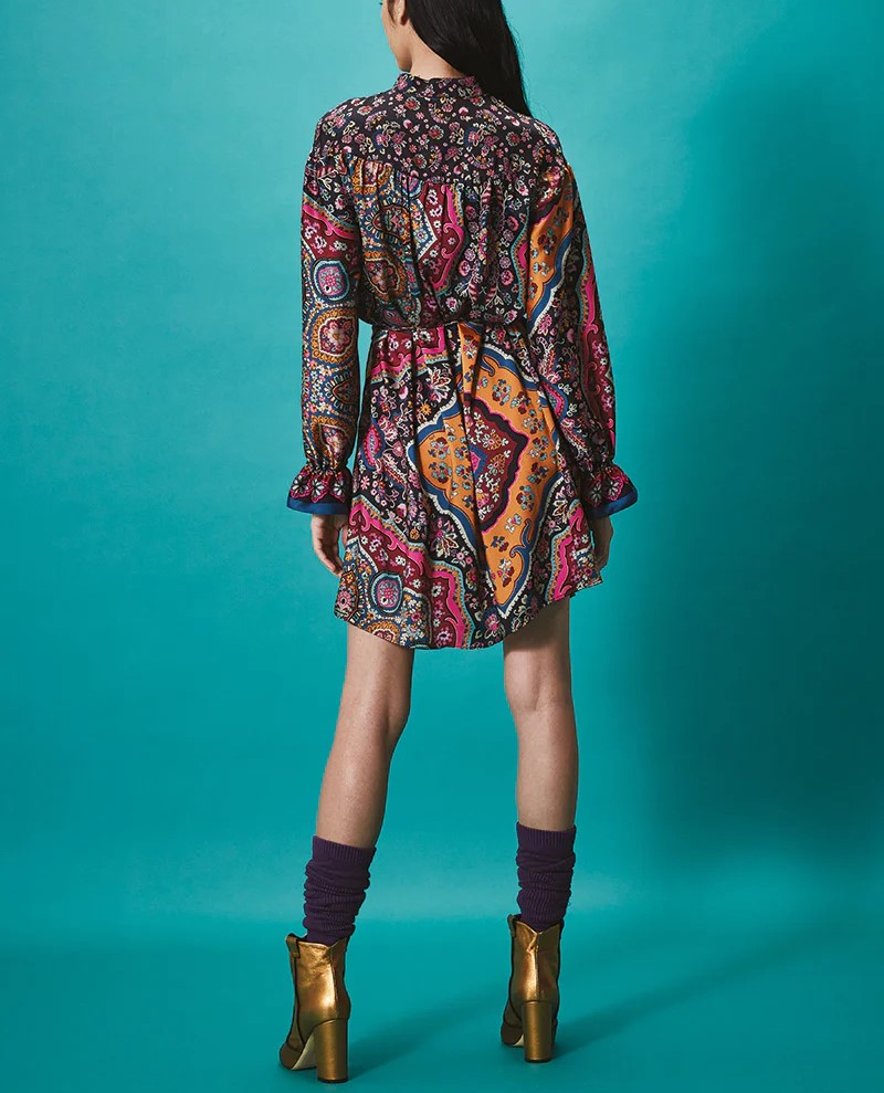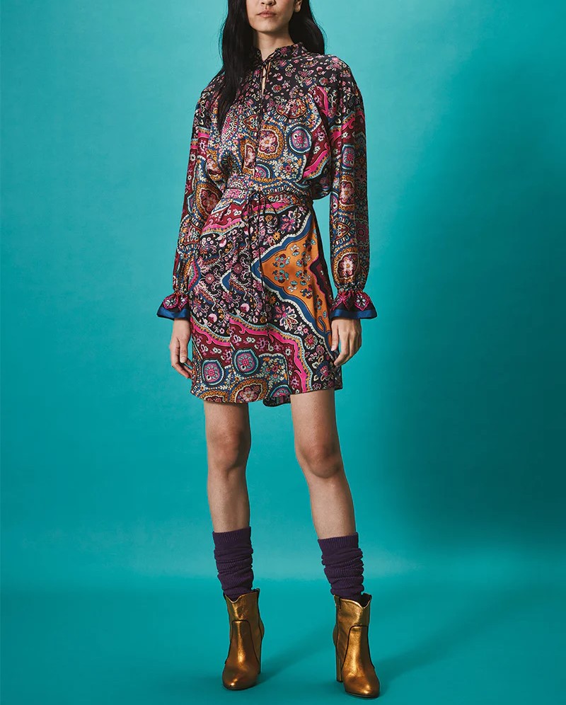 L’ Abito folk Auok NENETTE, รจ un abito svasato in twill con stampa folk, manica lunga con polsino arricciato, stretto in vita da cintura per evidenziare il punto vita, collo alla coreana con coulisse.