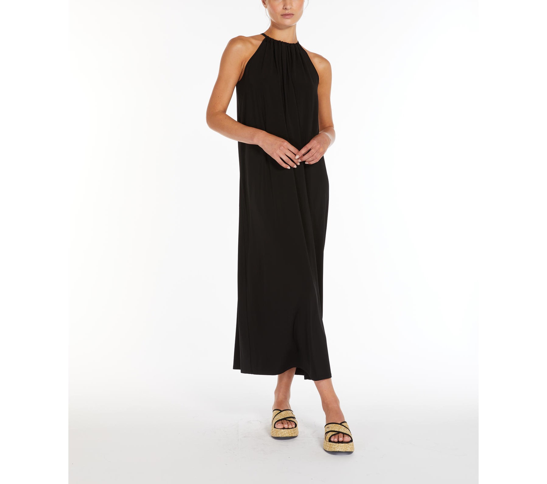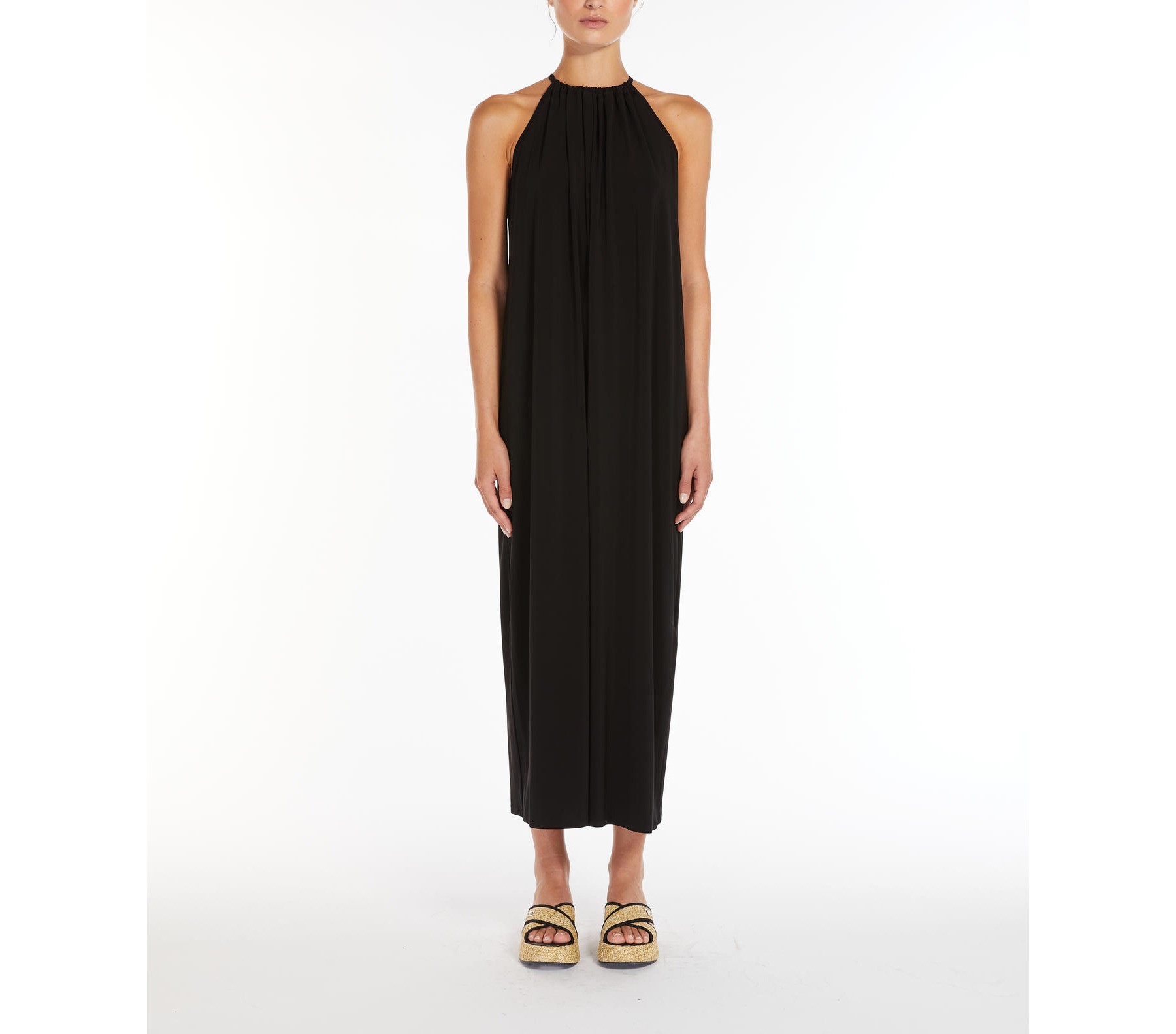 Abito lungo smanicato in morbido jersey crรชpe di viscosa stretch Caratterizzato da una silhouette fluida Scollo all’americana e dettaglio arricciato sul dรฉcolletรฉ Chiusura a goccia con laccetto sul retro Composizione: 95% Viscosa, 5% Elastan