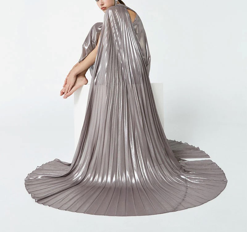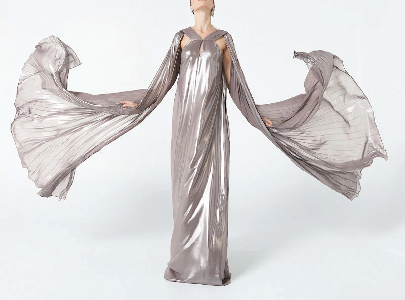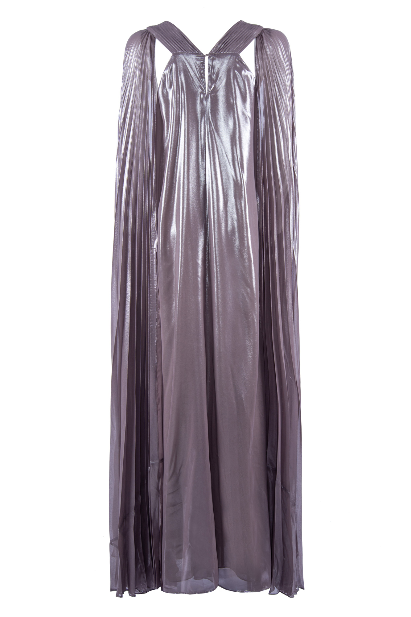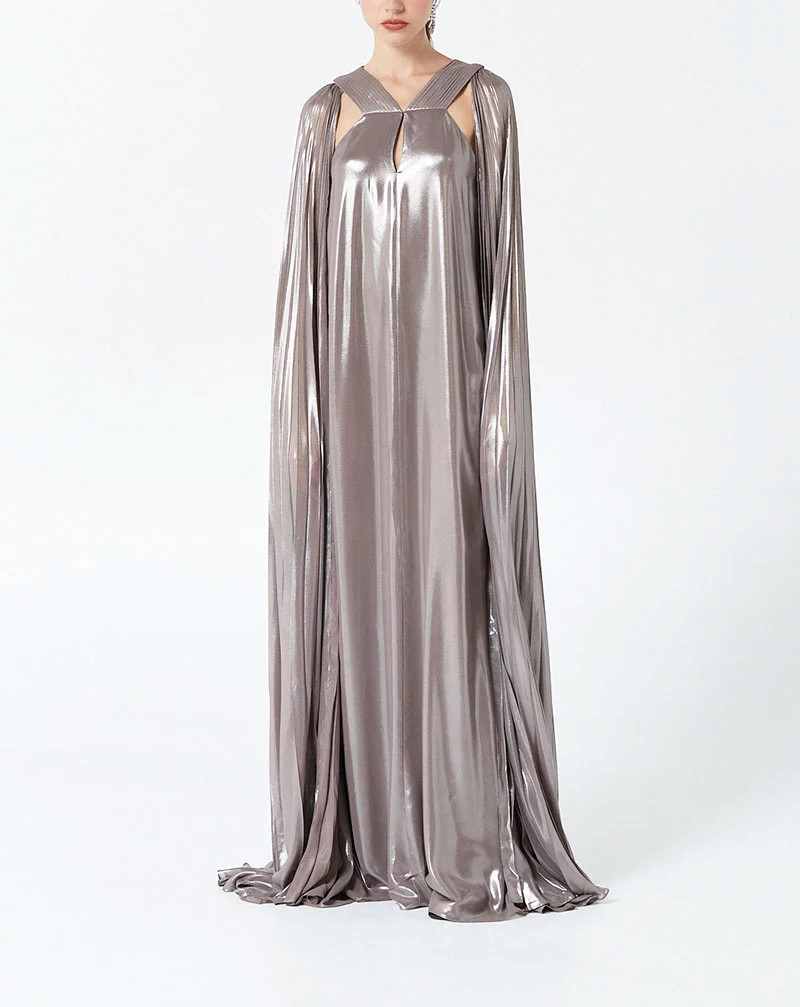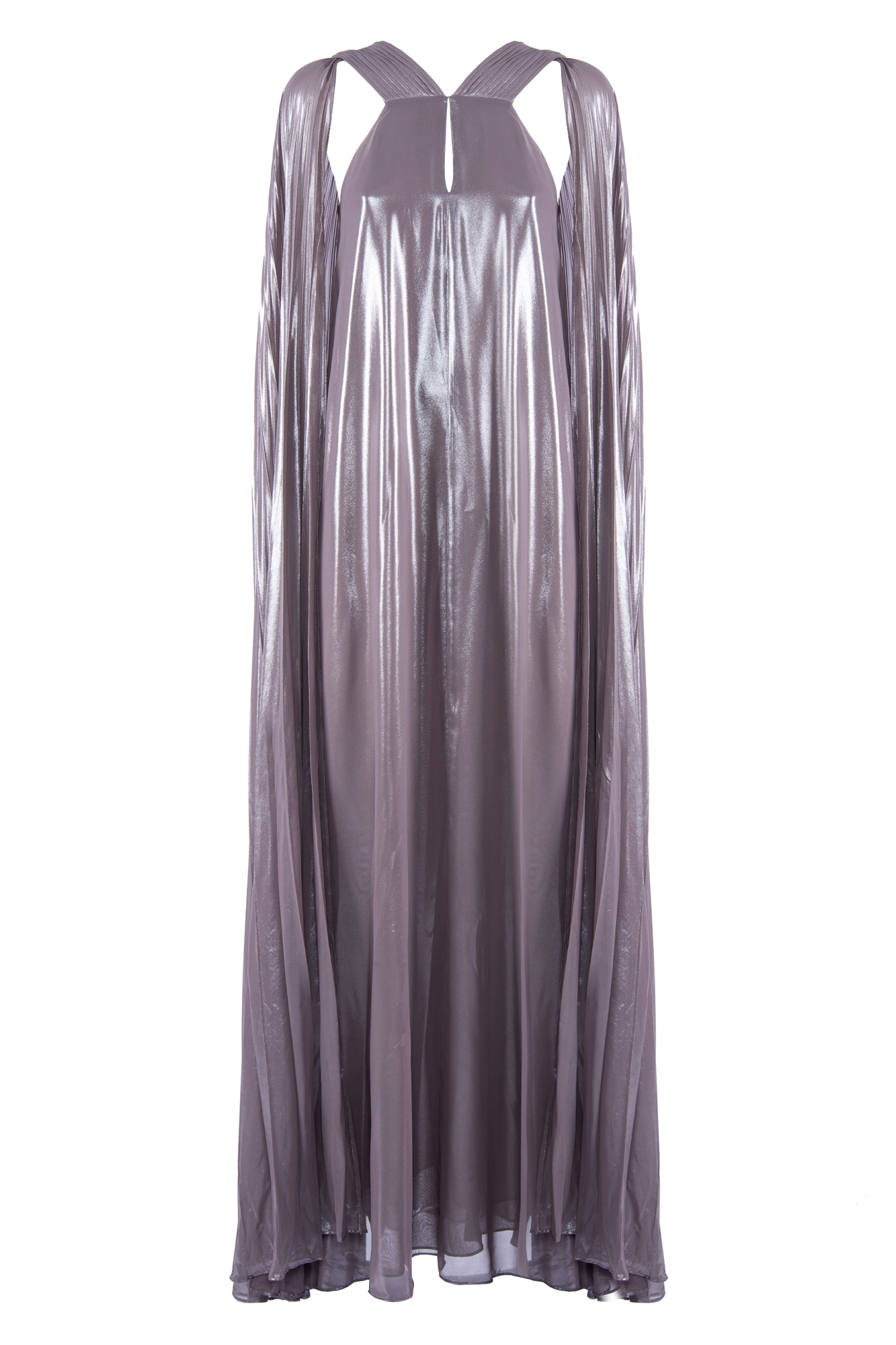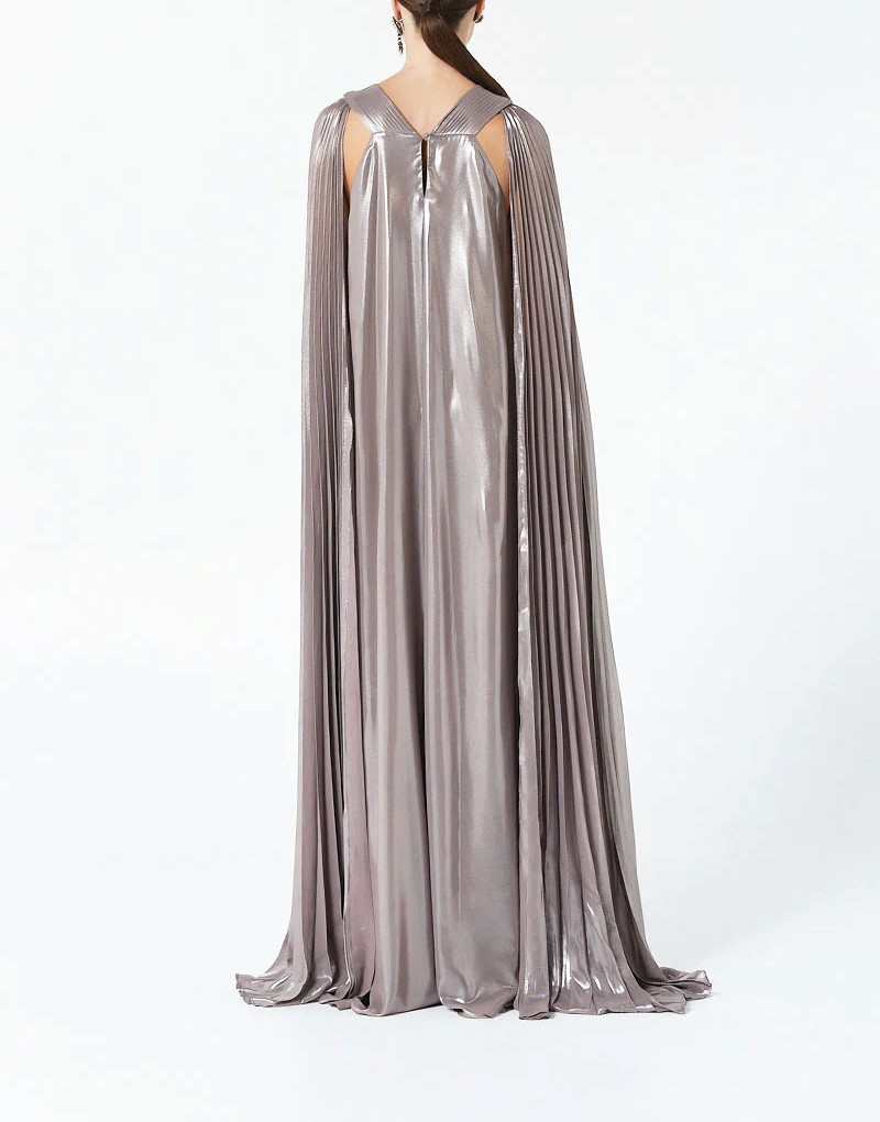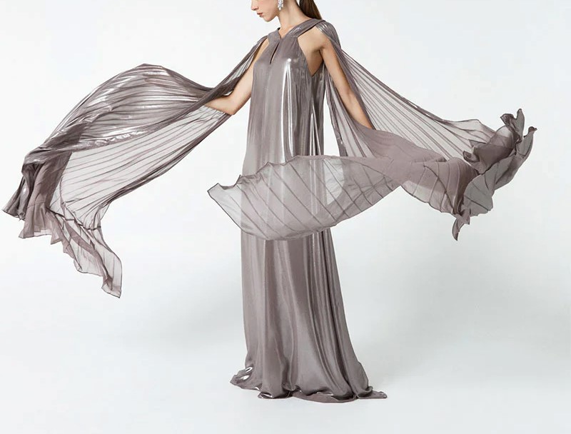 L’ Abito lungo Artemis NENETTE, รจ un abito lungo con maniche plissettate in chiffon laminato con chiusura posteriore.
