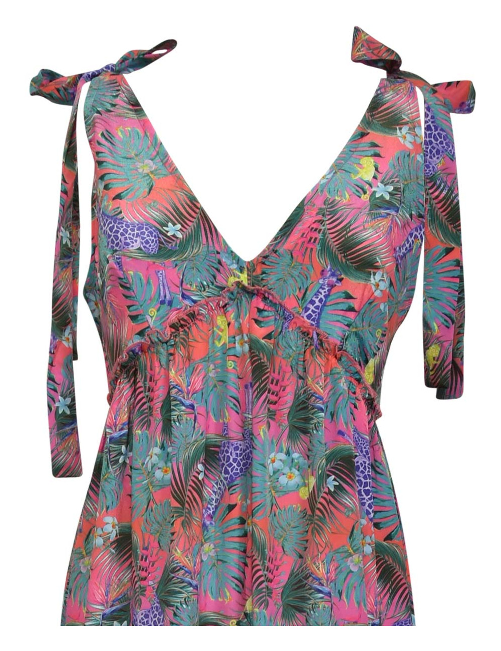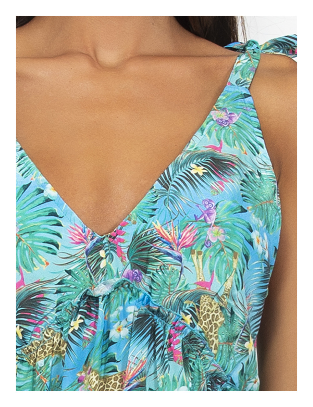 Abito lungo smanicato Stampa new jungle Balze sul fondo Ideale come fuori acqua in coordinato con i costumi della stessa serie COMPOSIZIONE TESSILE: Tessuto: 100% Poliestere