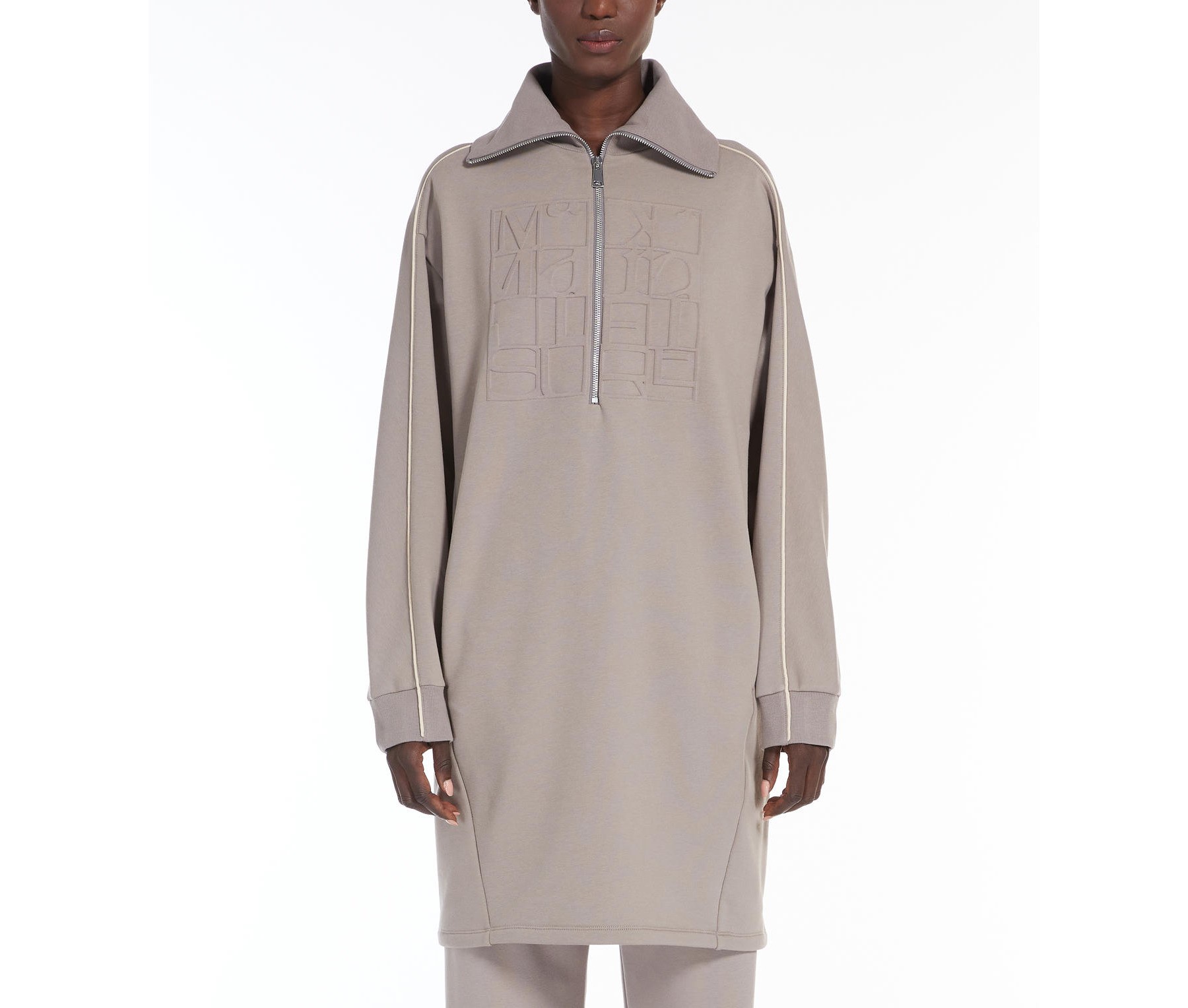 L’ Abito Vello MaxMara Leisure, รจ una felpa in cotone stretch di ispirazione abito. Collo alto con zip e maniche lunghe con polsini rifiniti a costine, tasche inserite nei fianchi, sprone sul retro. I dettagli come il piping a contrasto e il maxi logo sul davanti personalizzano il capo. Volume over.