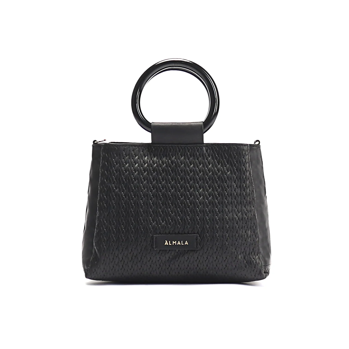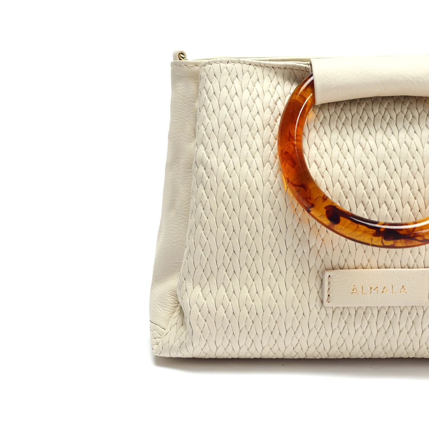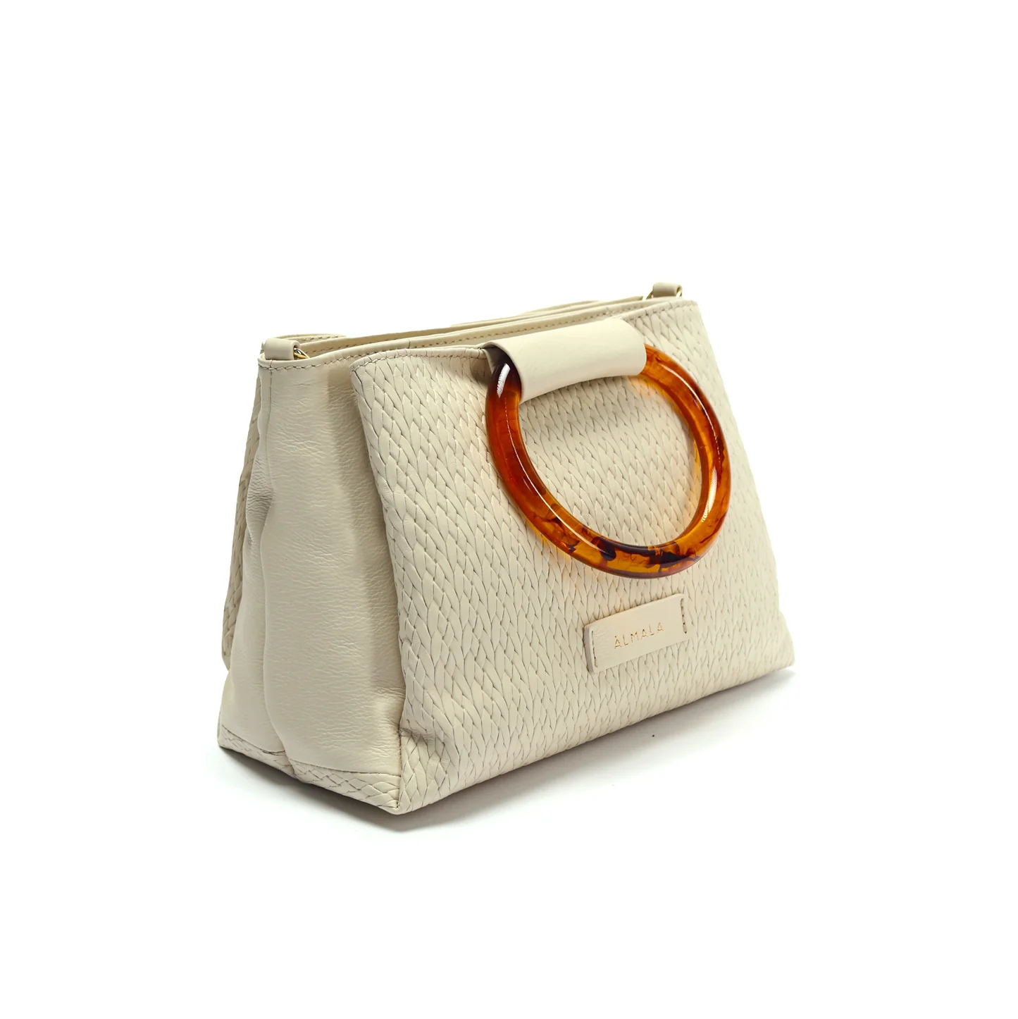 Acetate Bag ALMALA, รจ un borsa in pelle di vitello stampa treccia. L’interno รจ diviso in due scomparti a soffietto. Chiusura con cerniere in metallo. Manico a cerchio in resina acetato. Tracolla in pelle regolabile e removibile. Finiture oro. Progettata e realizzata in Italia.