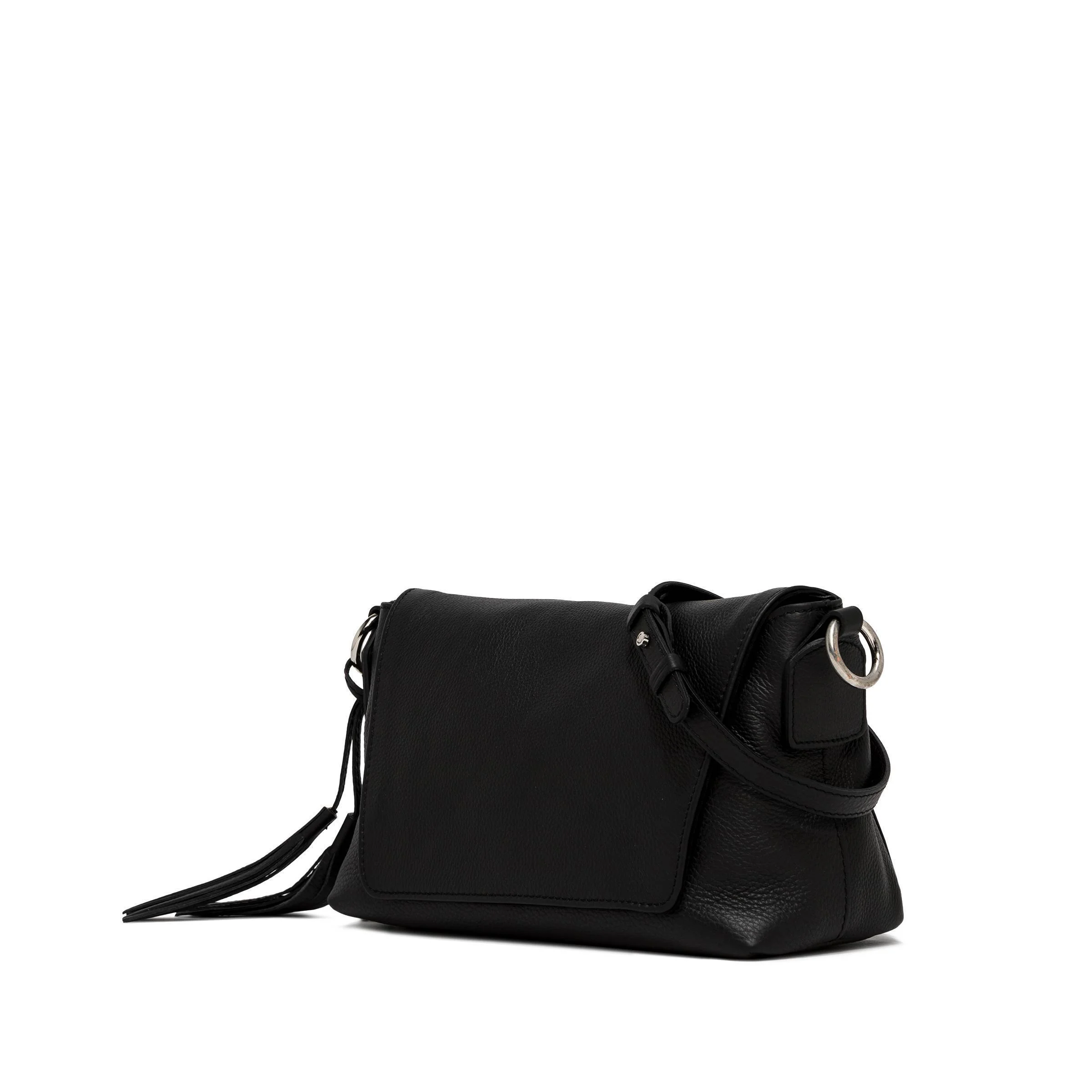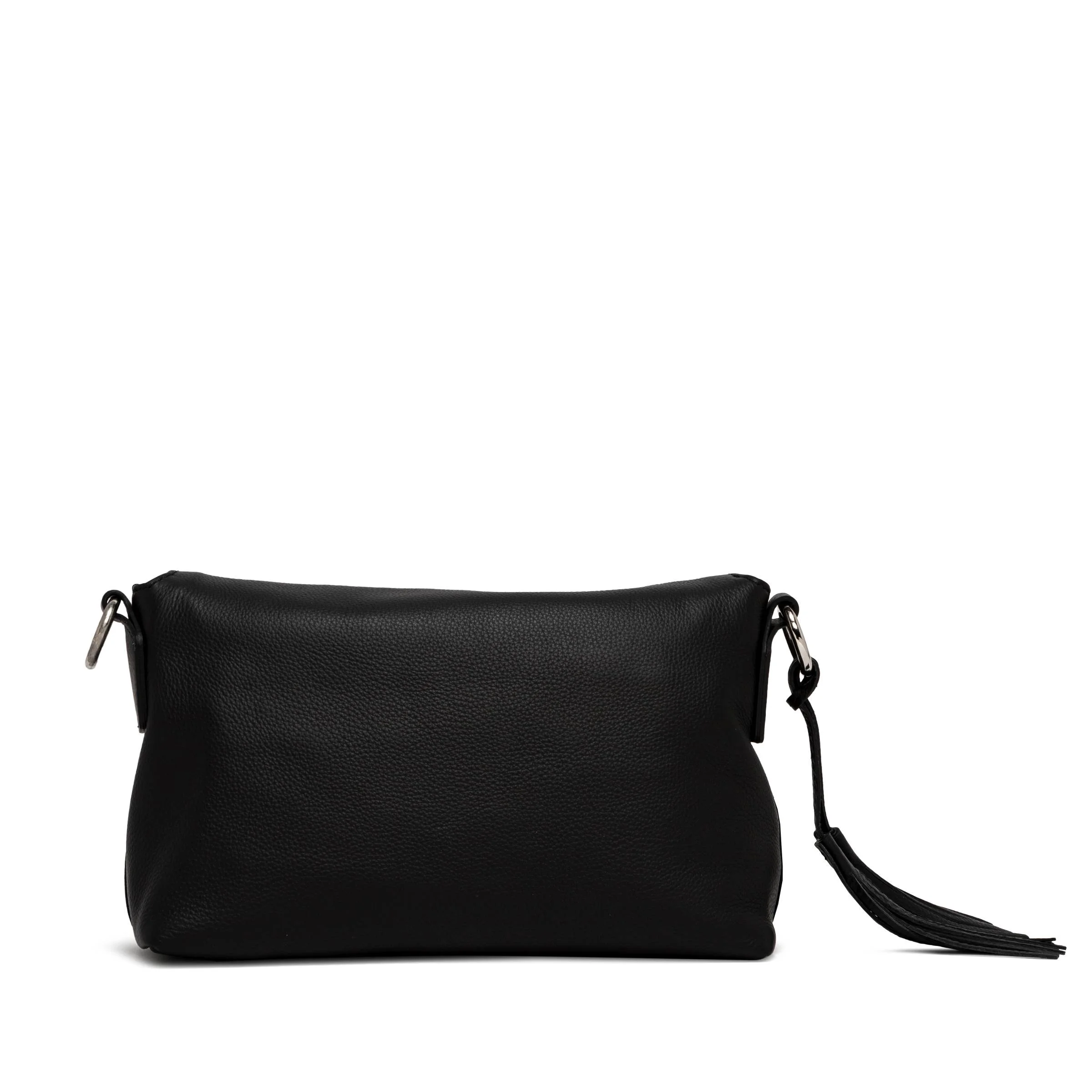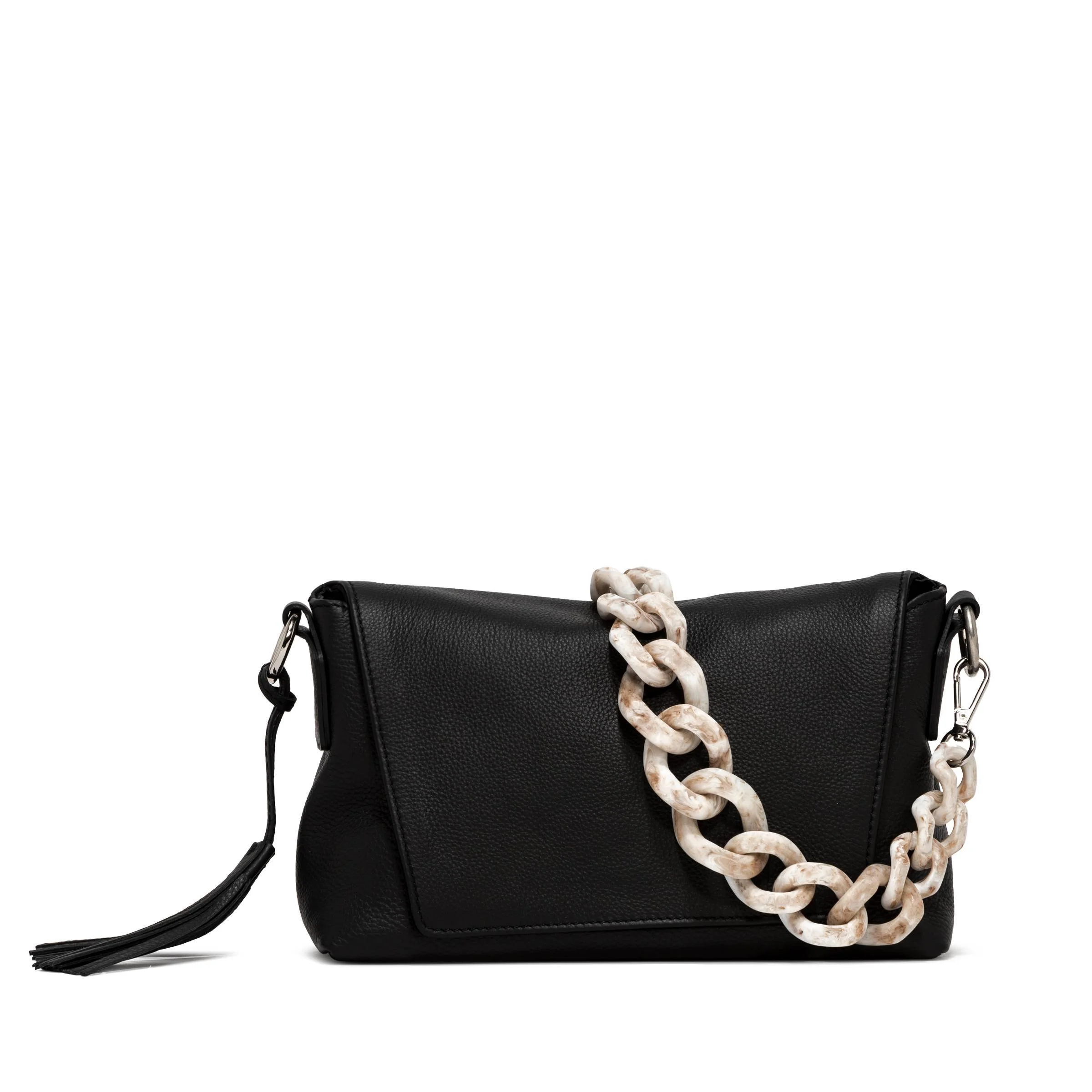 Scegli la borsa a spalla Africa, molto morbida nello stile e realizzata interamente in vera pelle effetto martellato. Con nappine laterali, tracolla regolabile e removibile, e manico in catena in resina.