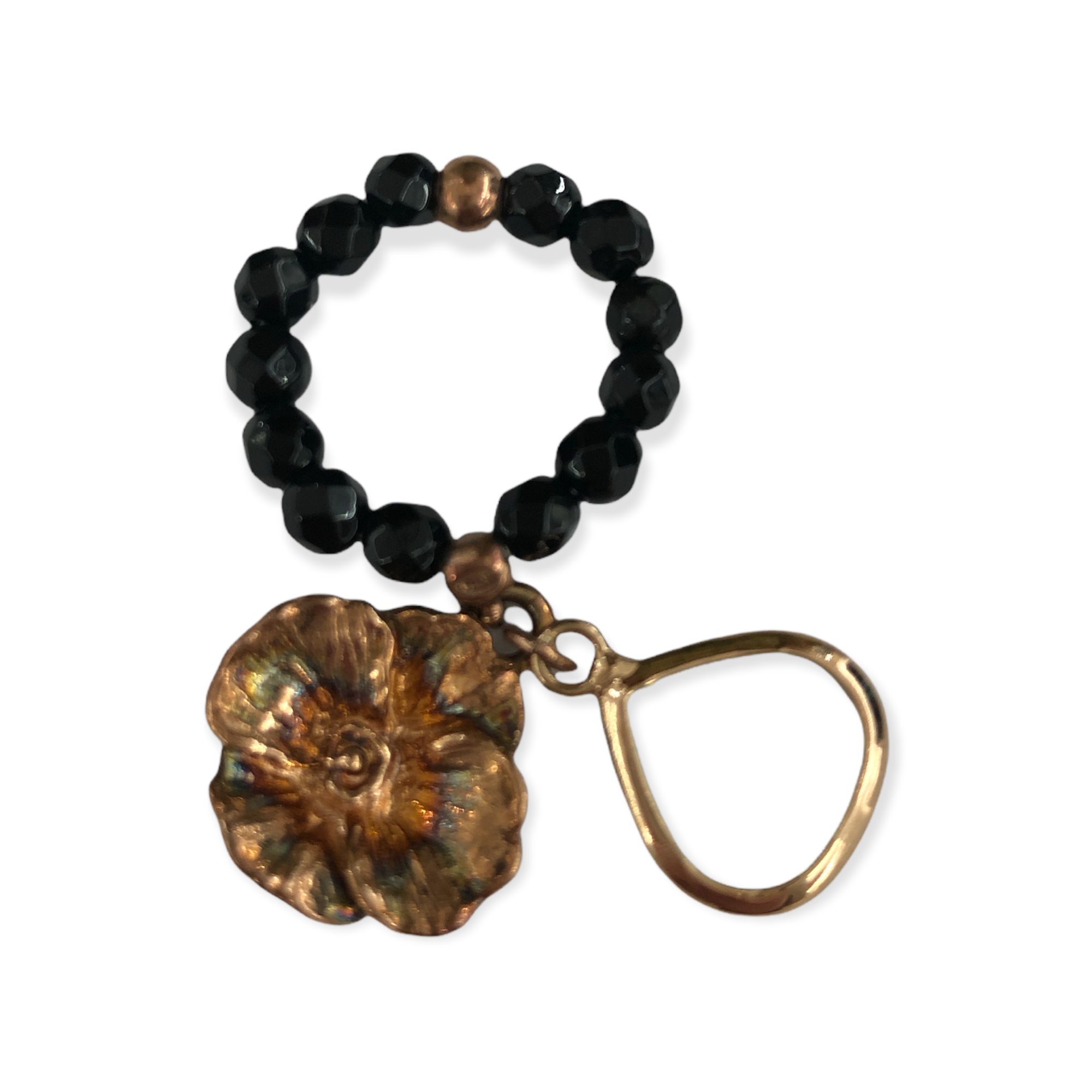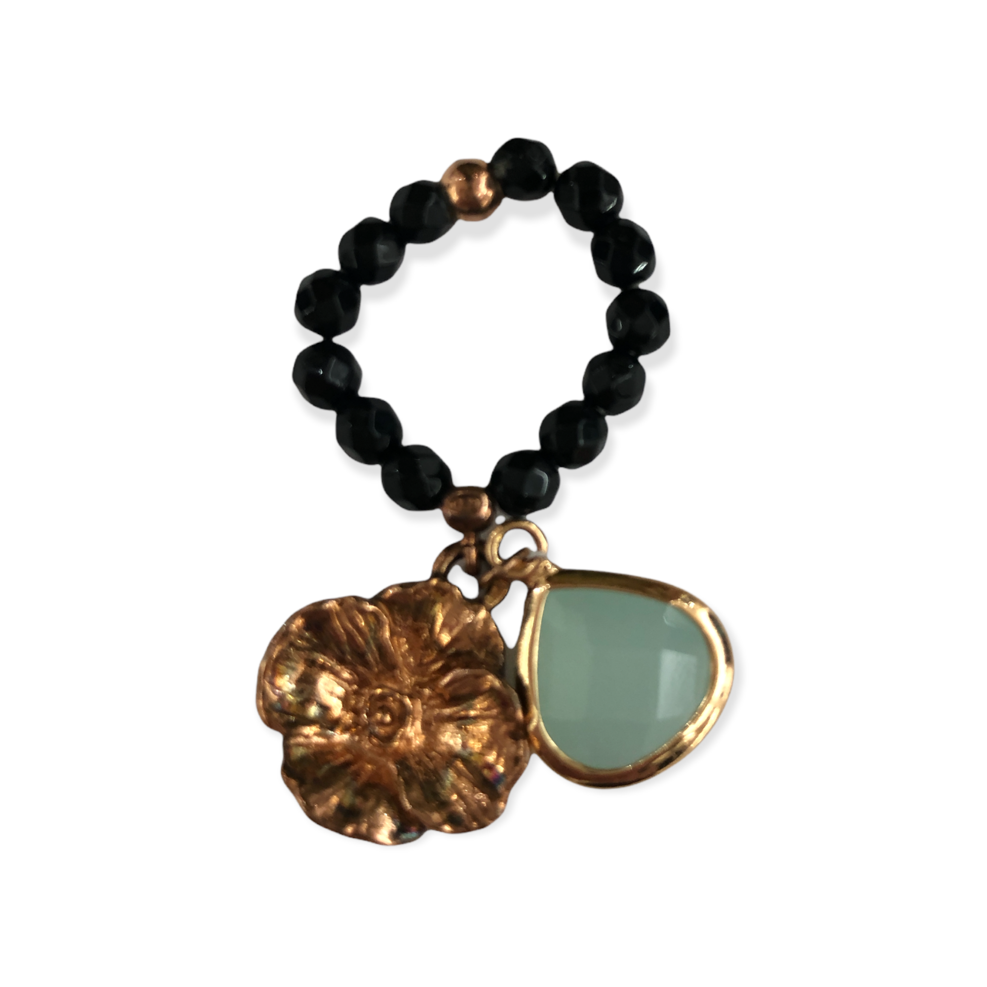 L’anello flor ALMALA, รจ un anello elasticizzato con cristalli, pendente a goccia in quarzo e fiore in argento colore oro rosa.