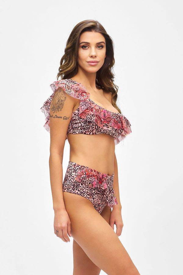 Scopri su Charme Roma il bikini monospalla a fascia, fantasia maculata di F**K. Costume 2 pezzi con reggiseno a fascia monospalla e mutandina slip mutandina alta retro’ . Fantasia animalier in lycra con volant di chiffon a taglio vivo. Coppe imbottite ma sfoderabili.