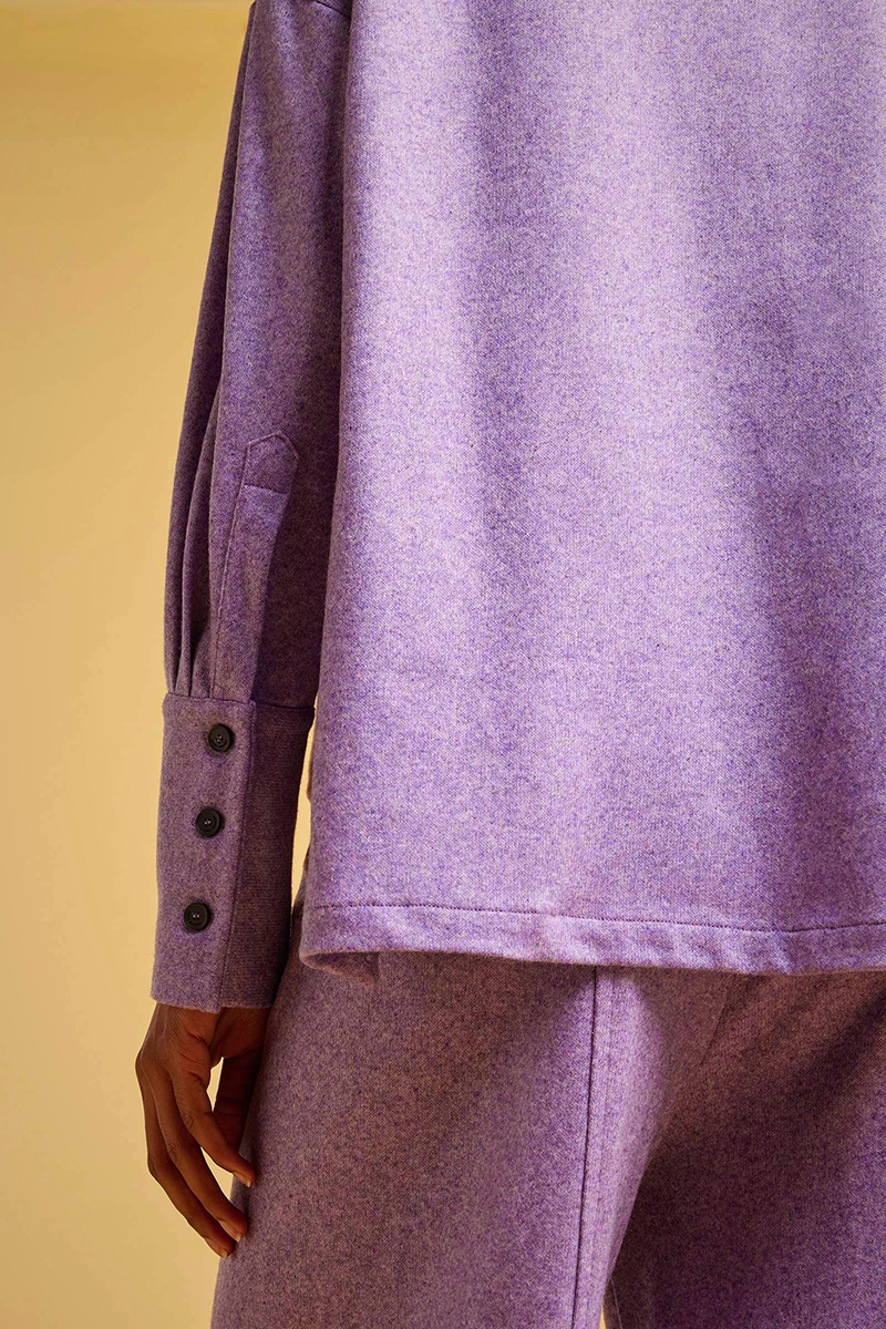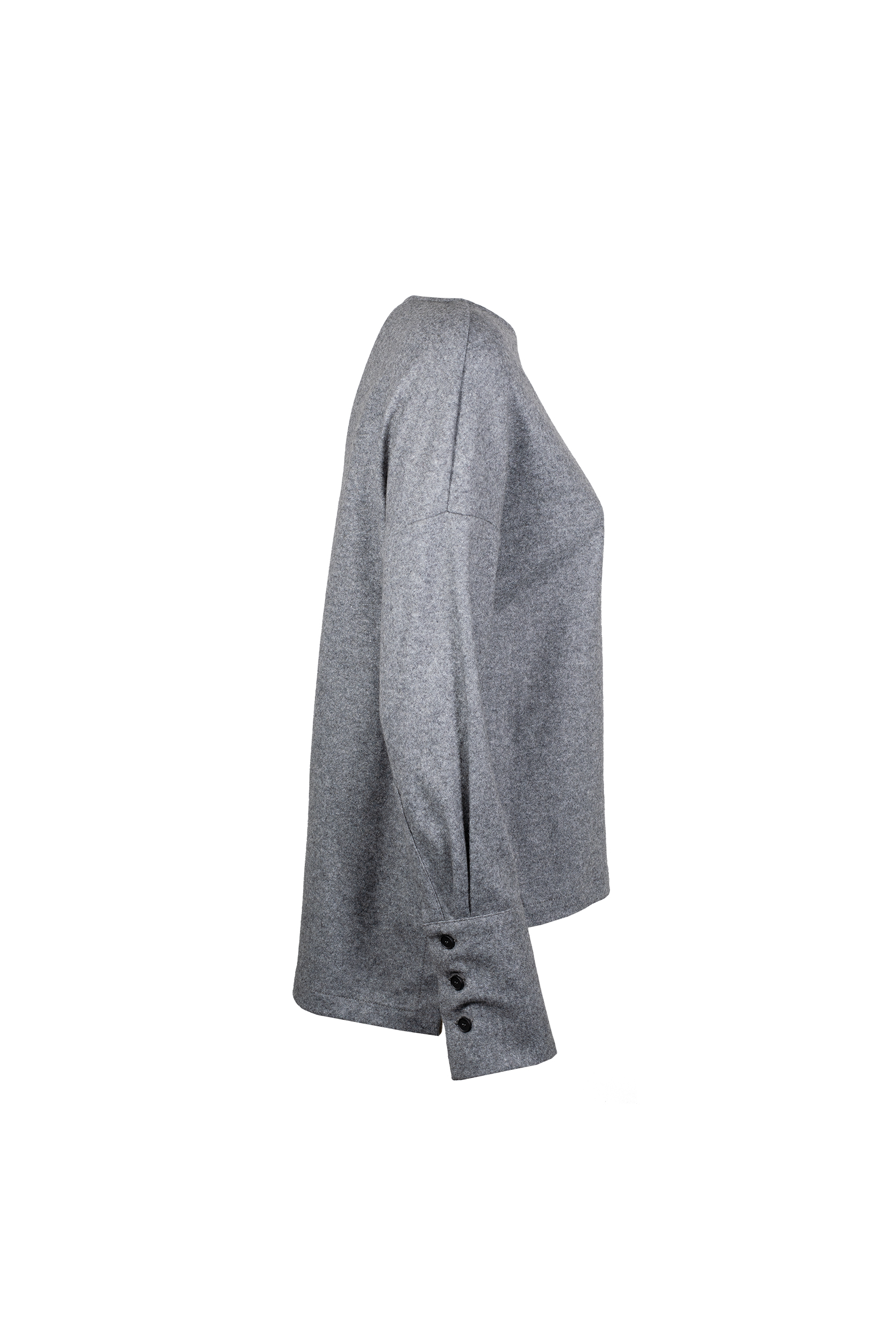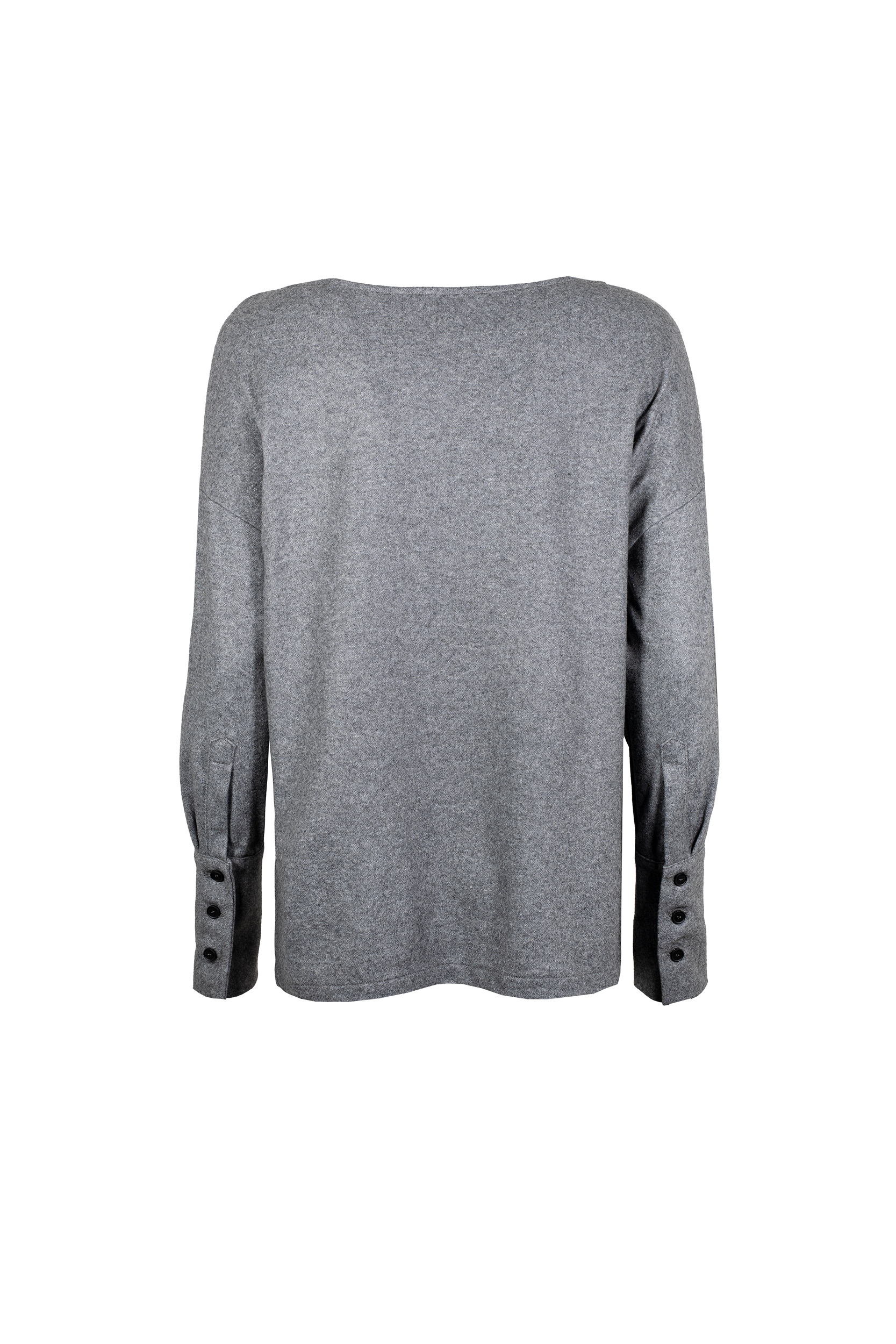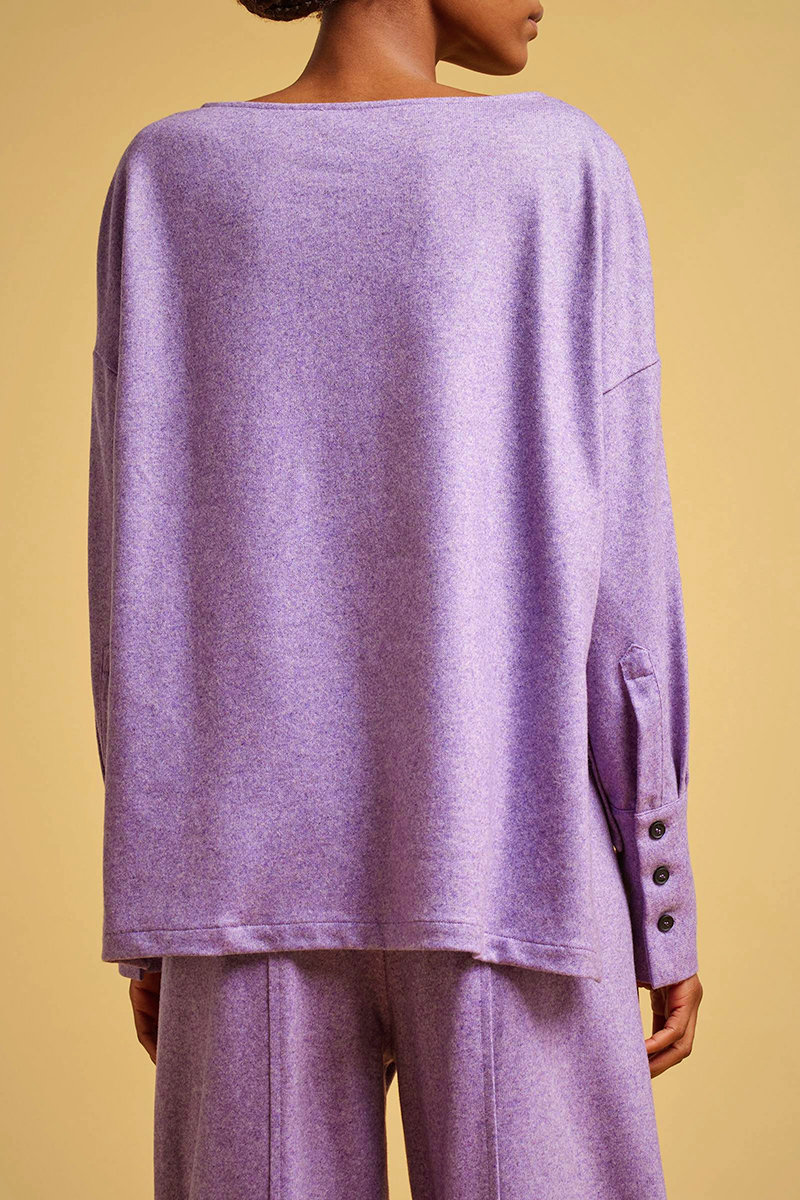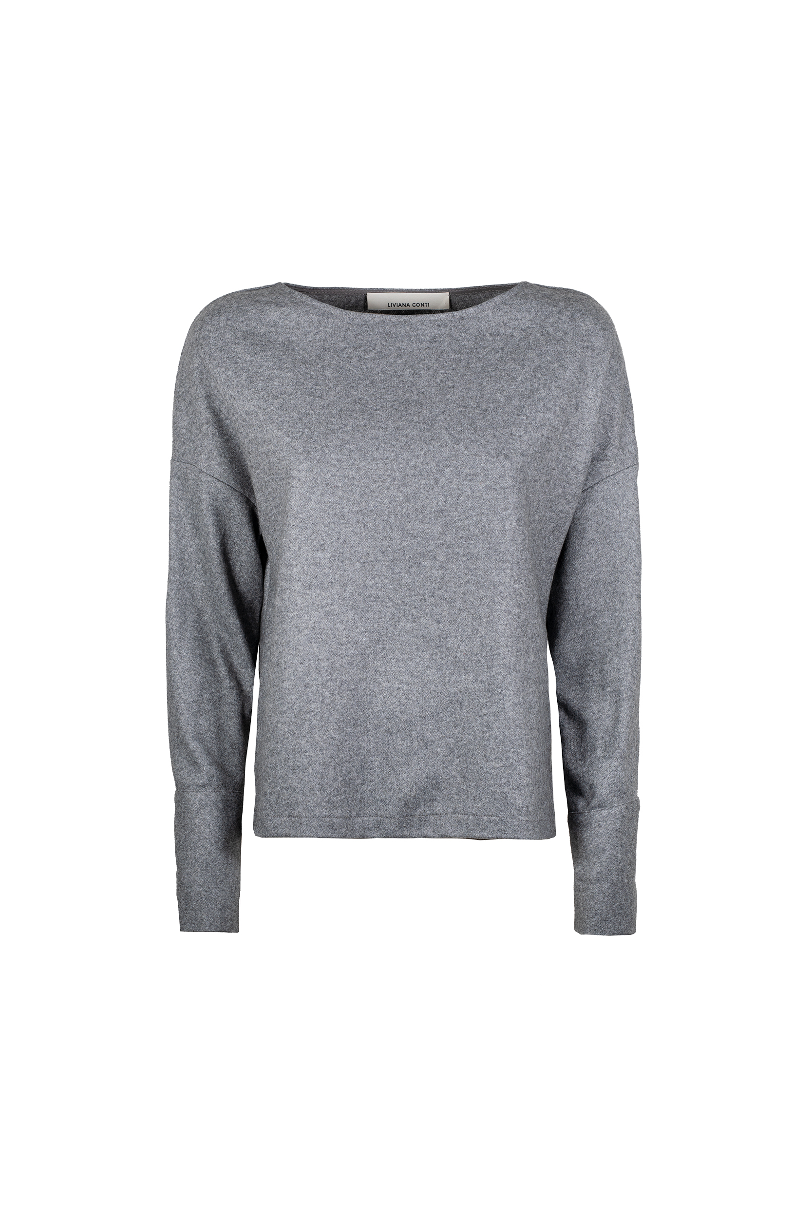 La Blusa cashmere LIVIANA CONTI, รจ una blusa in panno leggero cashmere, girocollo ampio, spalla bassa, manica lunga con polsino alto al fondo, fondo asimmetrico con spacchetti laterali al fondo. Vestibilitร regular.