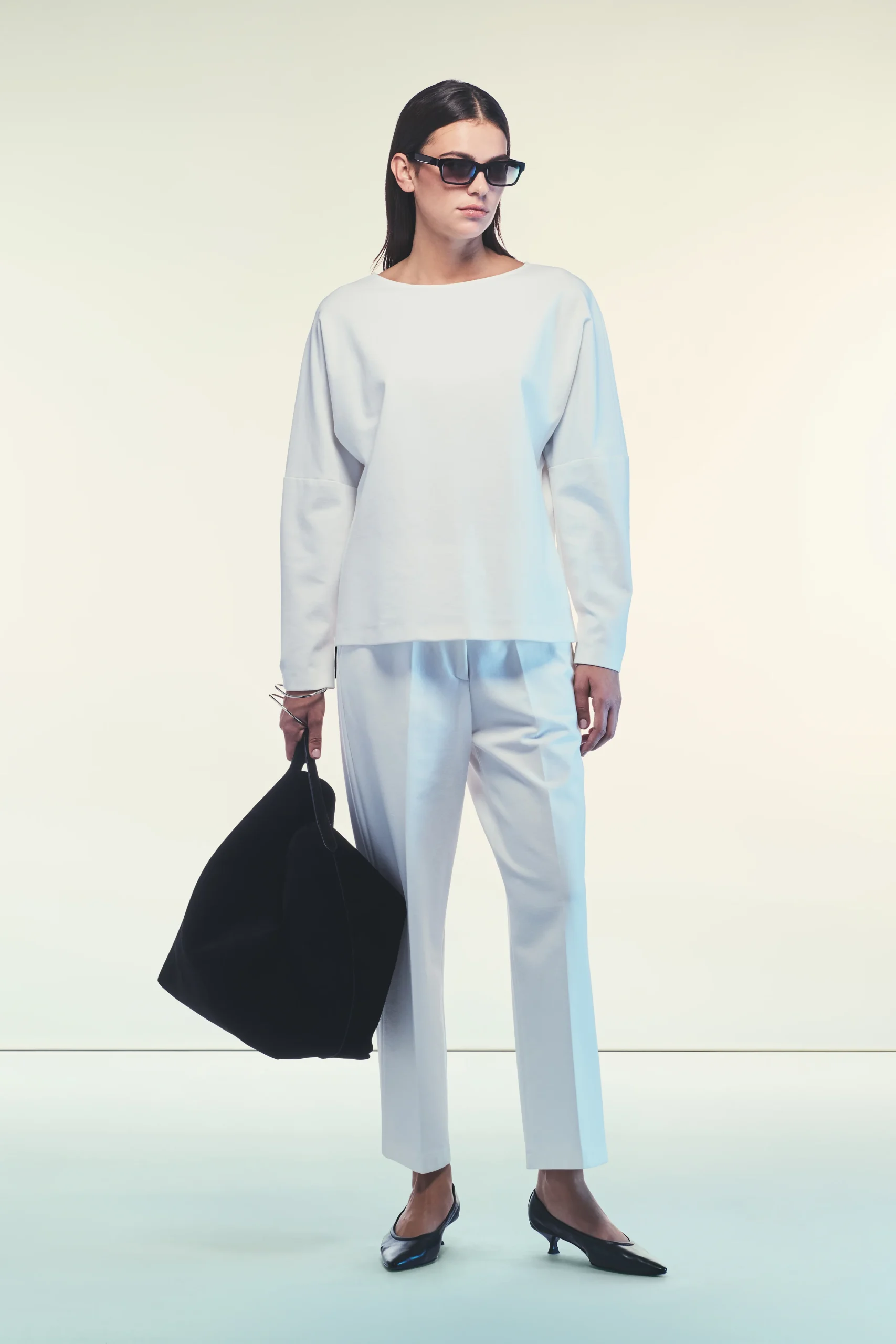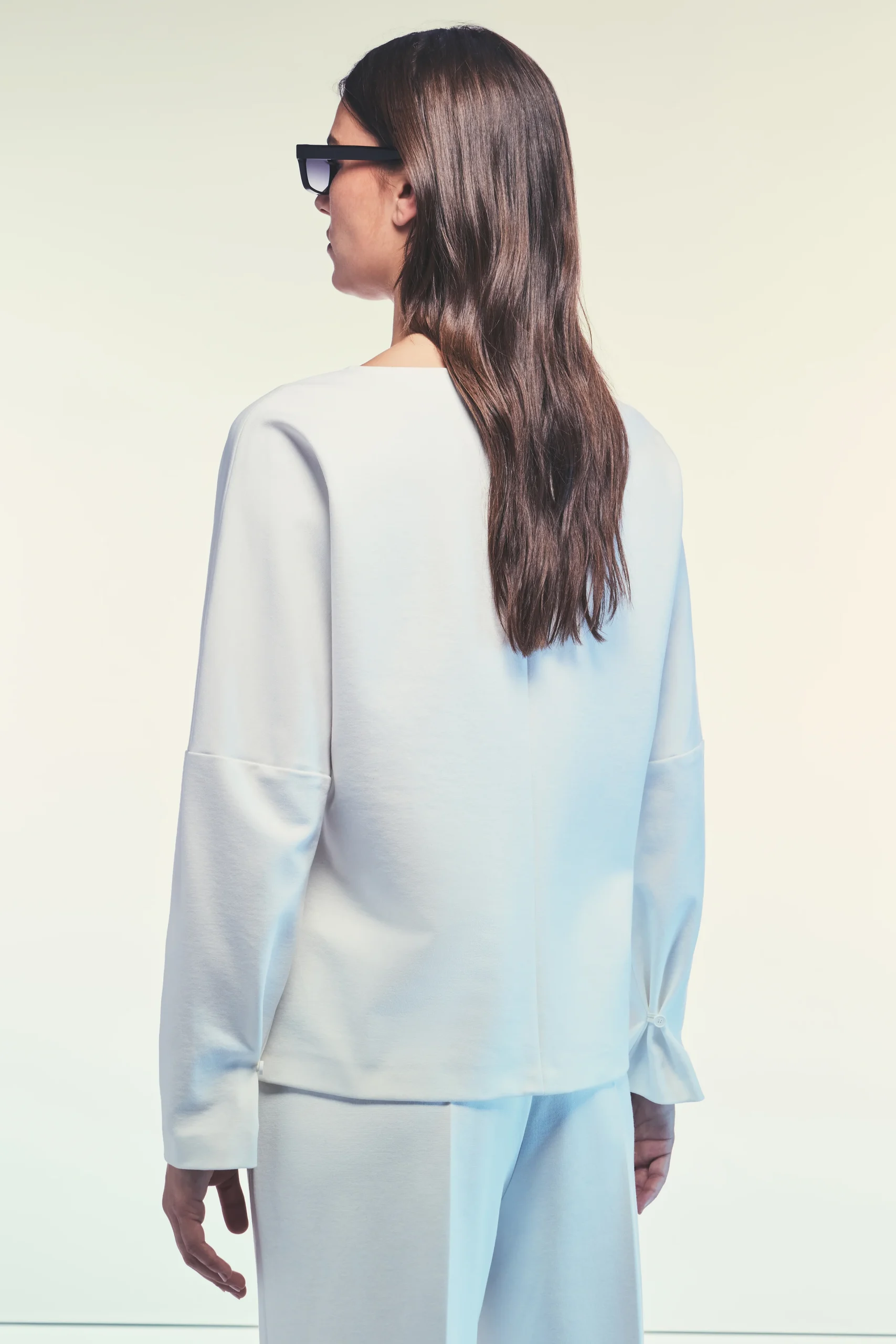 Blusa Clizia in punto Milano Linea morbida Scollo a barchetta Maniche lunghe con polsini risvoltati e nodo decorativo Lunghezza regolare ai fianchi Completo con il pantalone Danny Composizione: 68% Viscosa 27% Poliammide 5% Elastan Made in Italy Vestibilitร regular