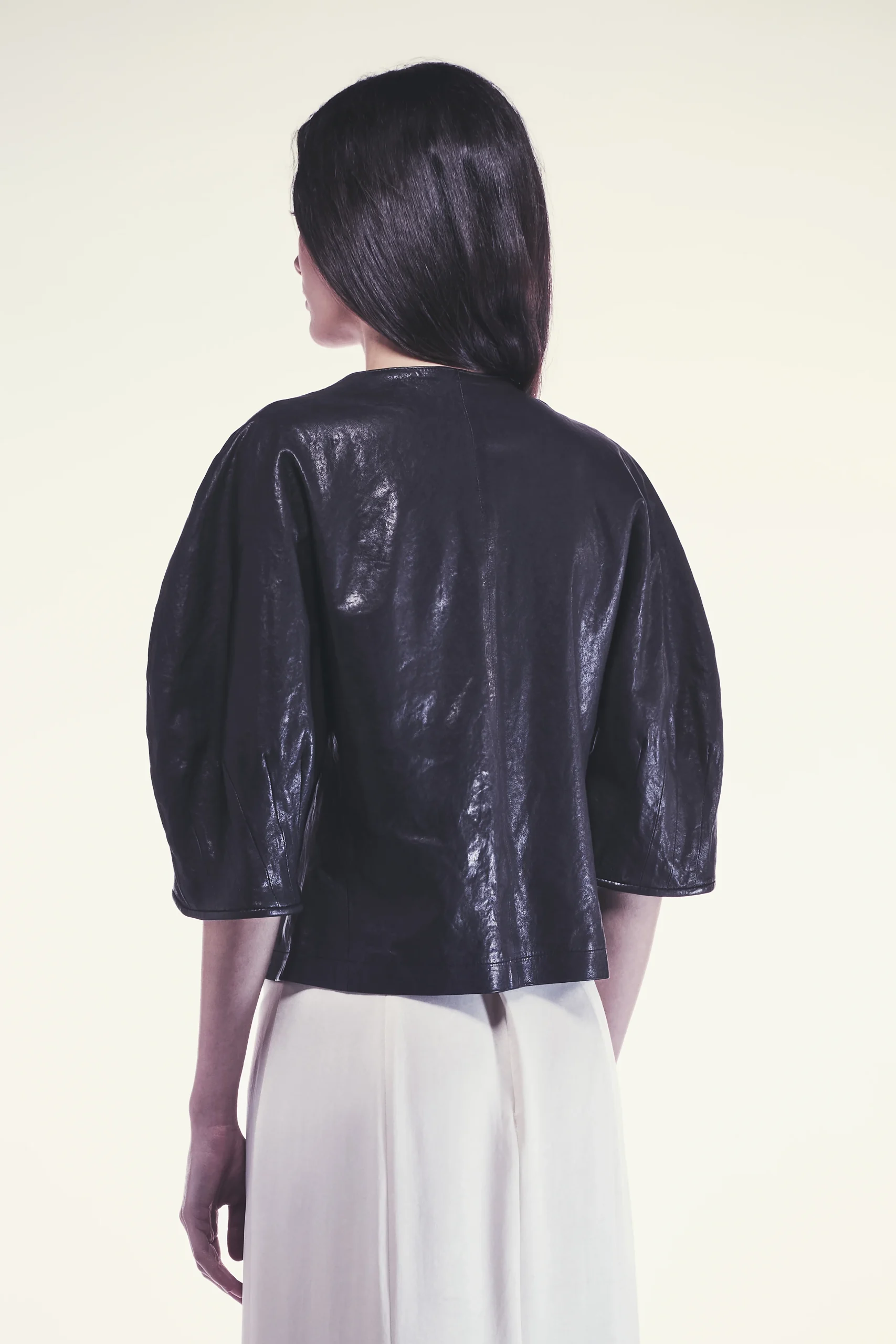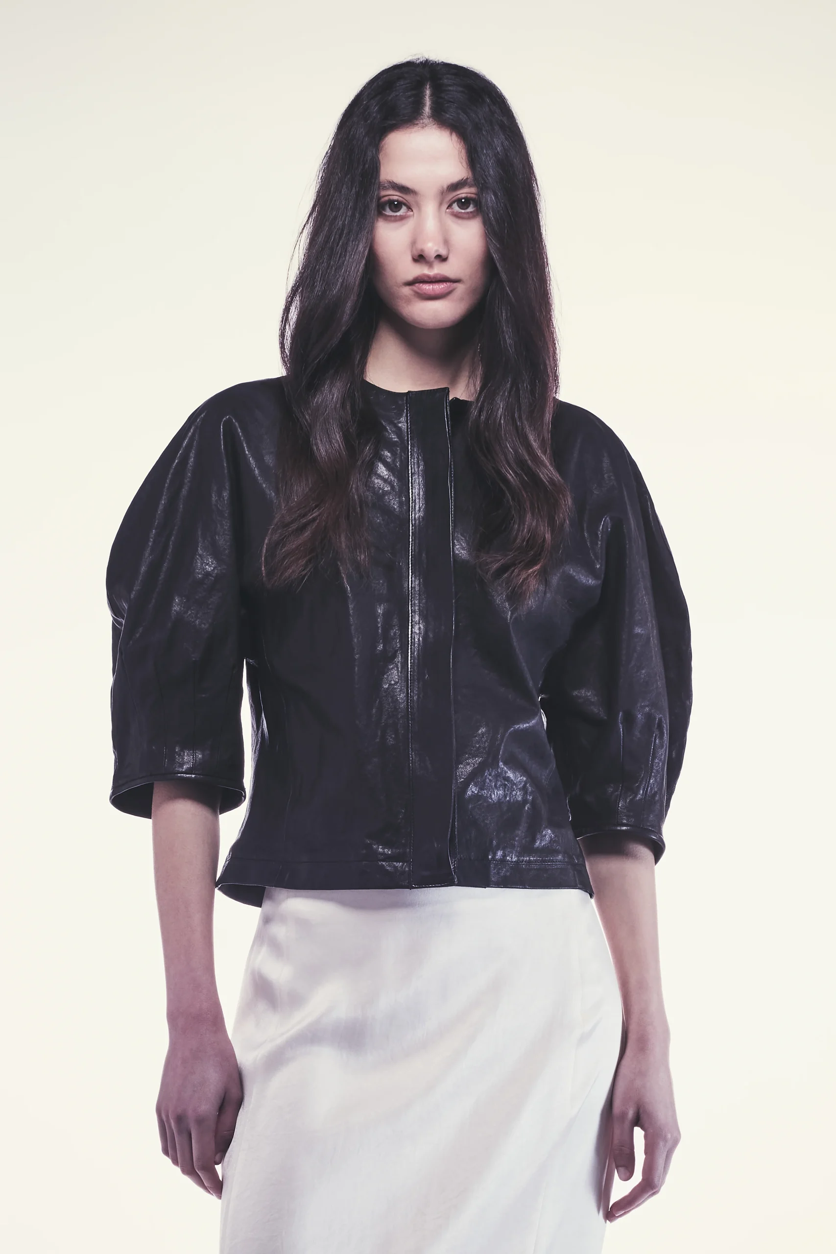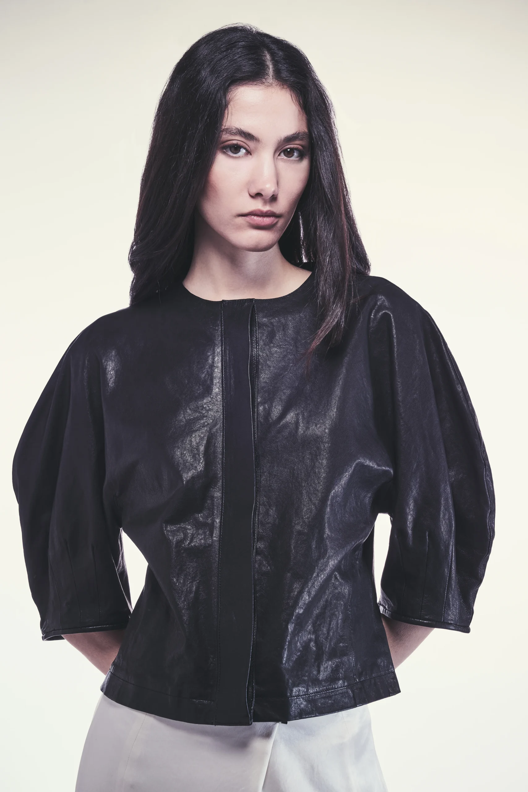 Blusa Delphine Blusa in vera pelle stretch Vestibilitร aderente Maniche volumizzate per un tocco di originalitร Composizione: 100% Pelle Made in Italy Vestibilitร regular