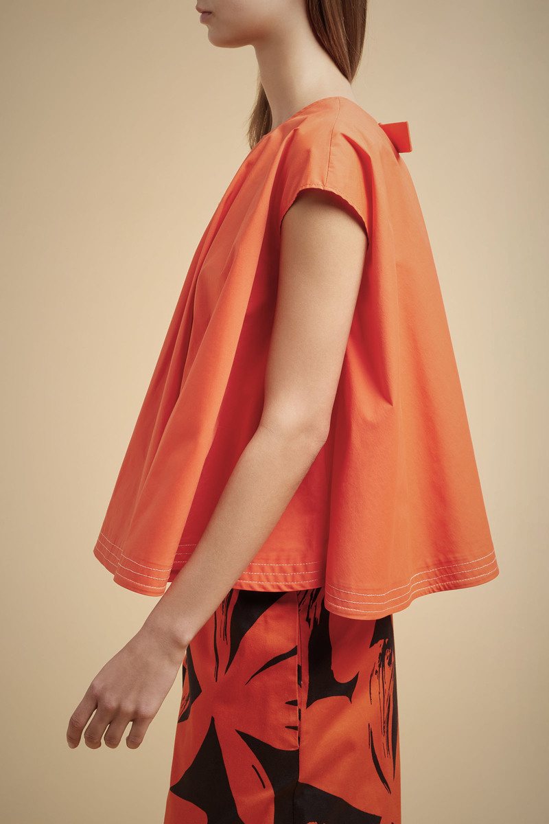 Blusa in tela di cotone Modello ampio svasato al fondo Orlo al fondo con impunture a contrasto Manica corta Girocollo sul davanti Scollo a V sul dietro con fibbia Indossabile front/back Composizione: 64% Cotone 31% Poliammide Made in Italy