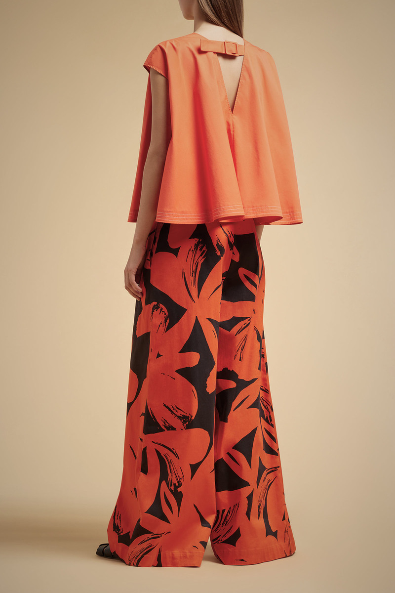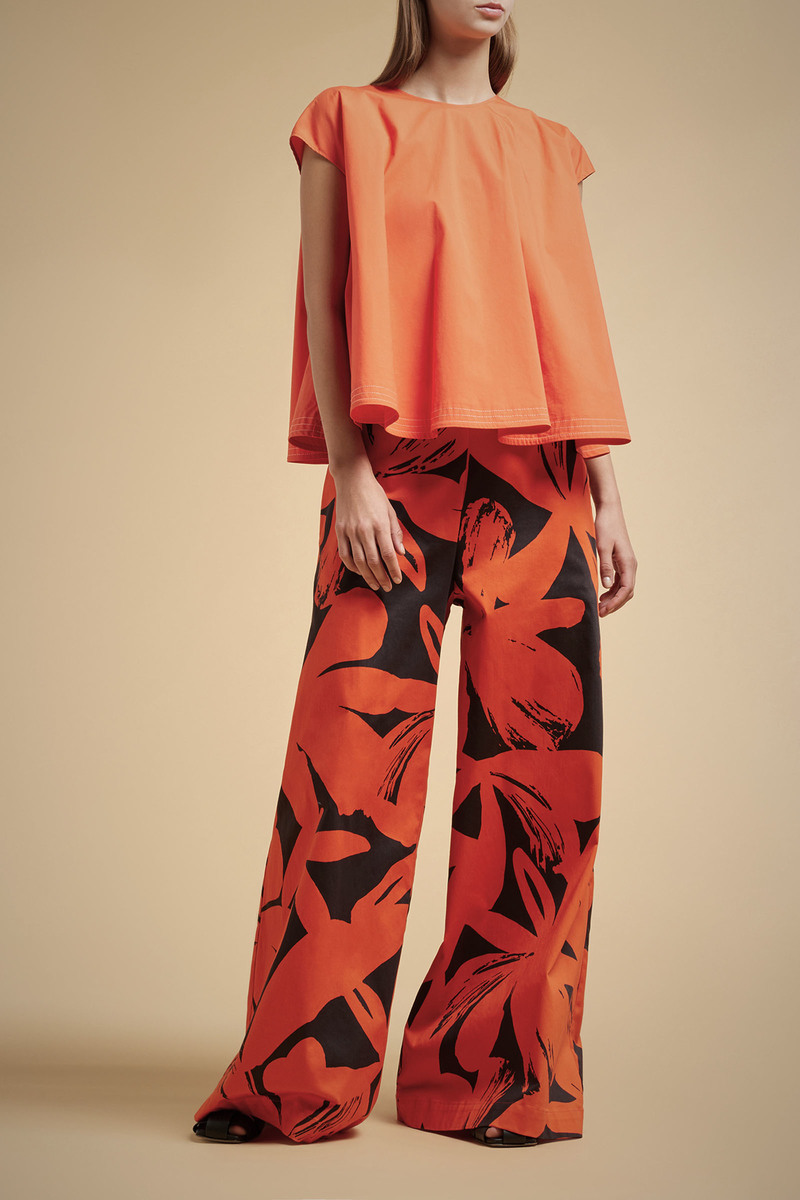 La Blusa fibbia LIVIANA CONTI, รจ una blusa in tela di cotone, modello ampio svasato al fondo. Orlo al fondo con impunture a contrasto. Manica corta, girocollo sul davanti e scollo a V sul dietro con fibbia. Indossabile front/back.