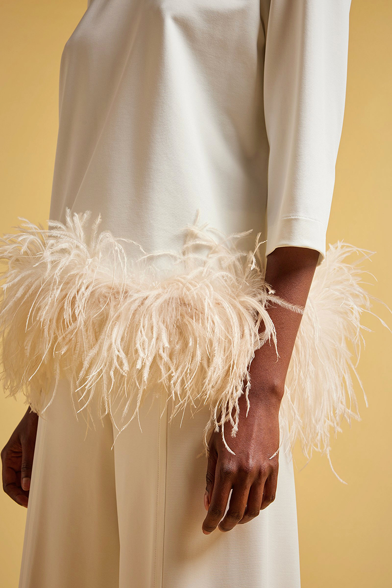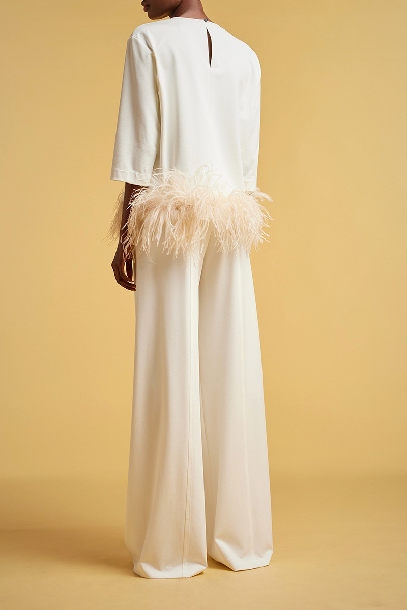 Blusa in punto milano lucido Applicazione piume all’orlo fondo Girocollo Giromanica Apertura a goccia al centro dietro con asole e bottoni Vestibilitร regular Composizione: 61% Viscosa 34% poliammide 5% Elastan Made in Italy
