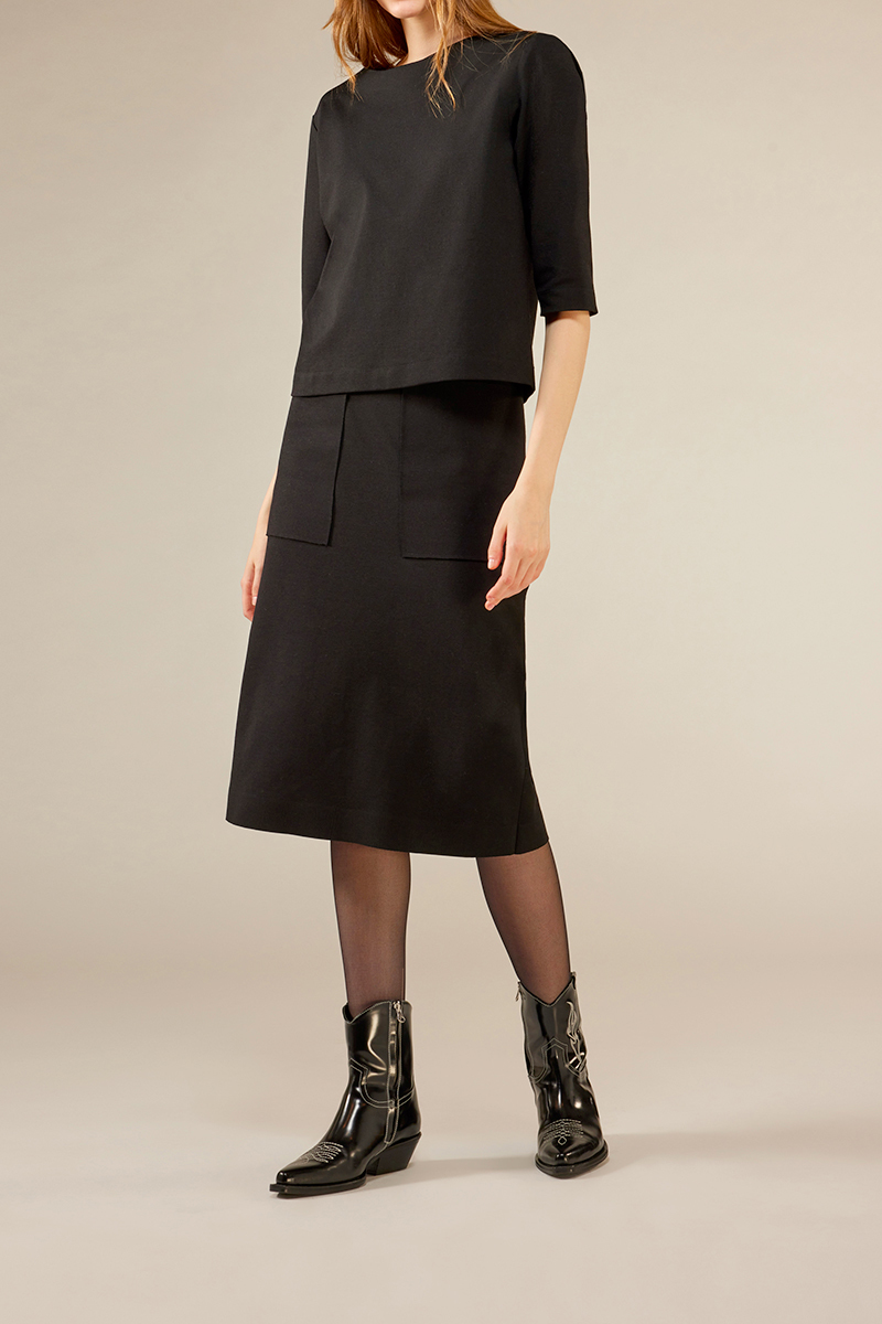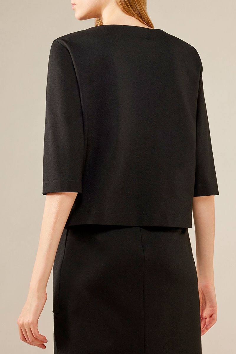 La Blusa Punto Milano LIVIANA CONTI, รจ una blusa girocollo in punto milano, spalla bassa, manica corta, orlo dritto al fondo. Vestibilitร regular.