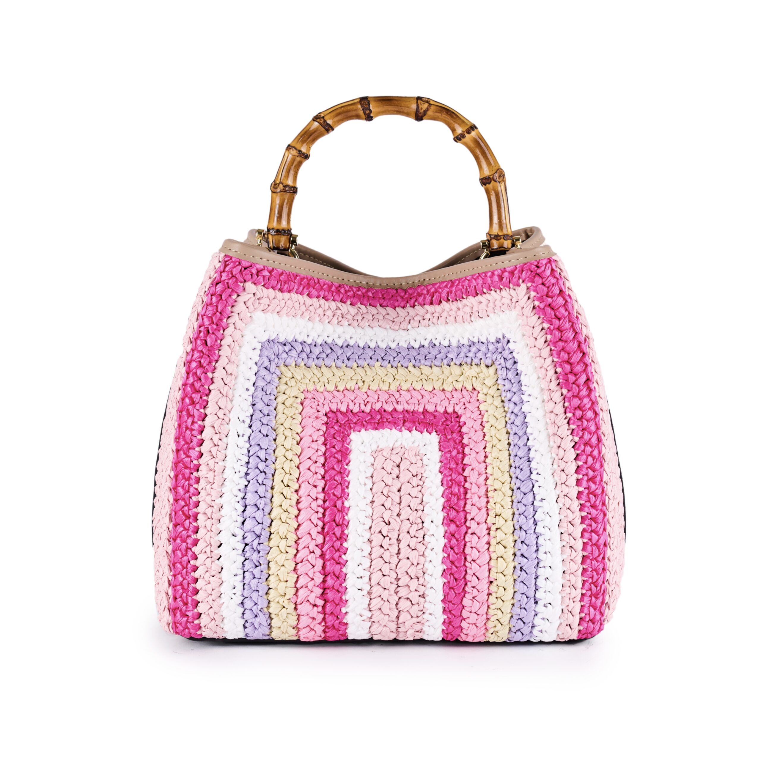 Secchiello in rafia crochet realizzato a mano Dettagli in pelle Richiudibile con calamita Manico in bamboo Tasca internaรน Tracolla rimovibile in rafia con dettagli in pelle Dimensioni: Larghezza 28cm x Altezza 27cm x Profonditร 16cm Designer colour: Rosa/Bianco/Cipria Fatto in Italia con Tessuti Italiani