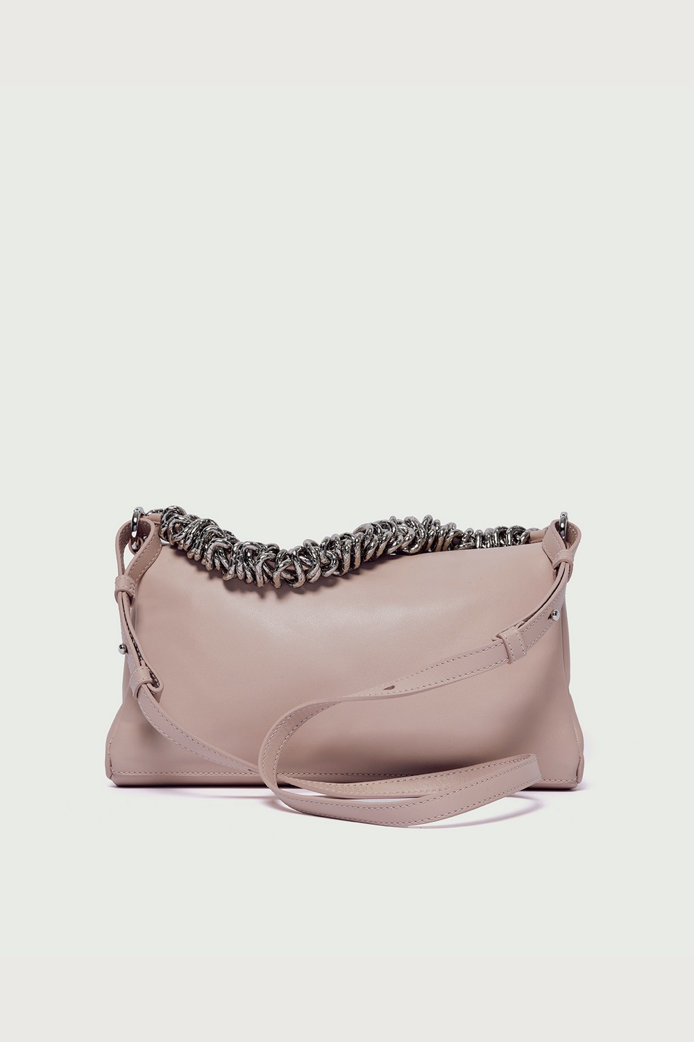 - Funzionalitร : apertura a scomparsa sulla parte alta della patta, manico in pelle e catena, tracolla regolabile