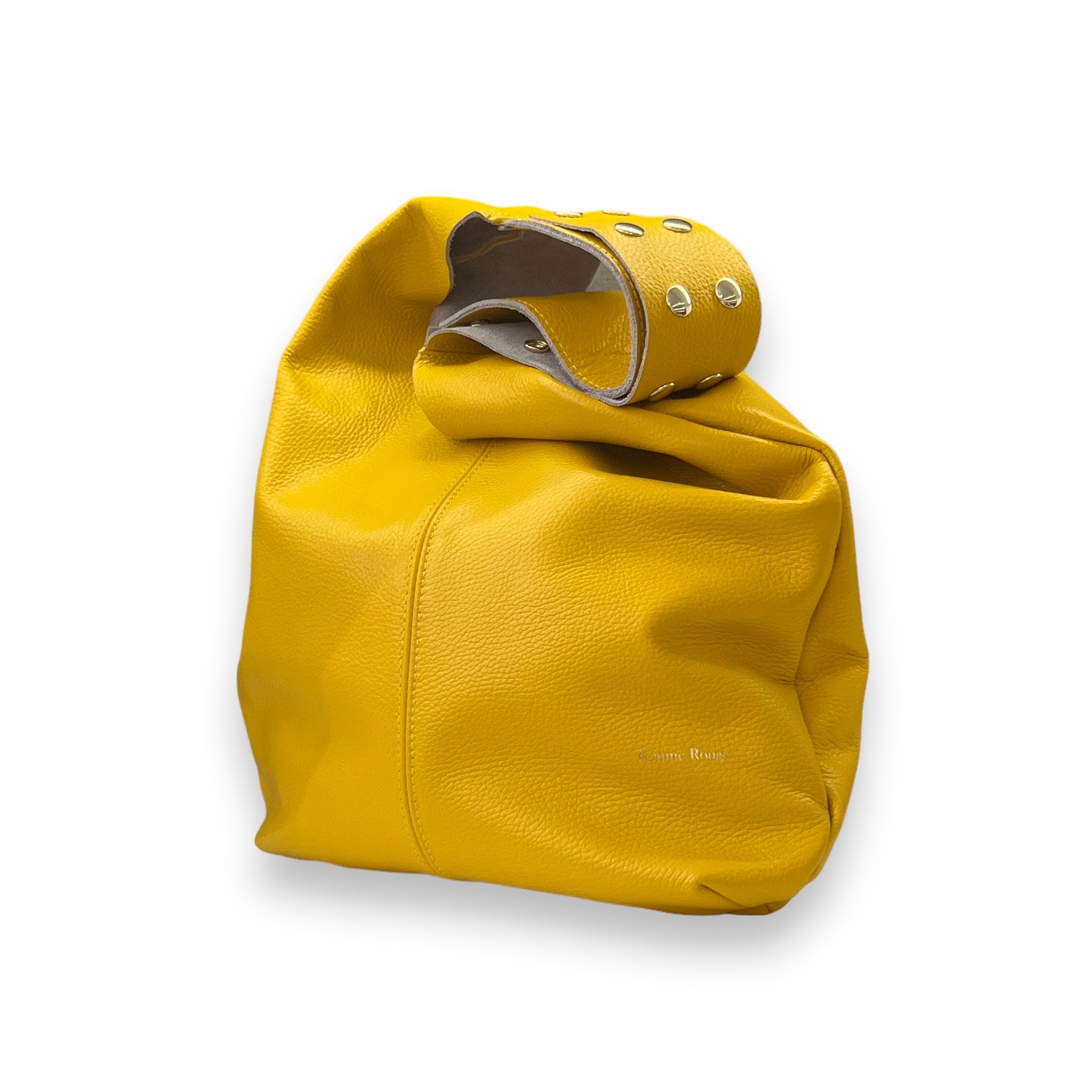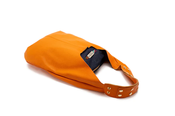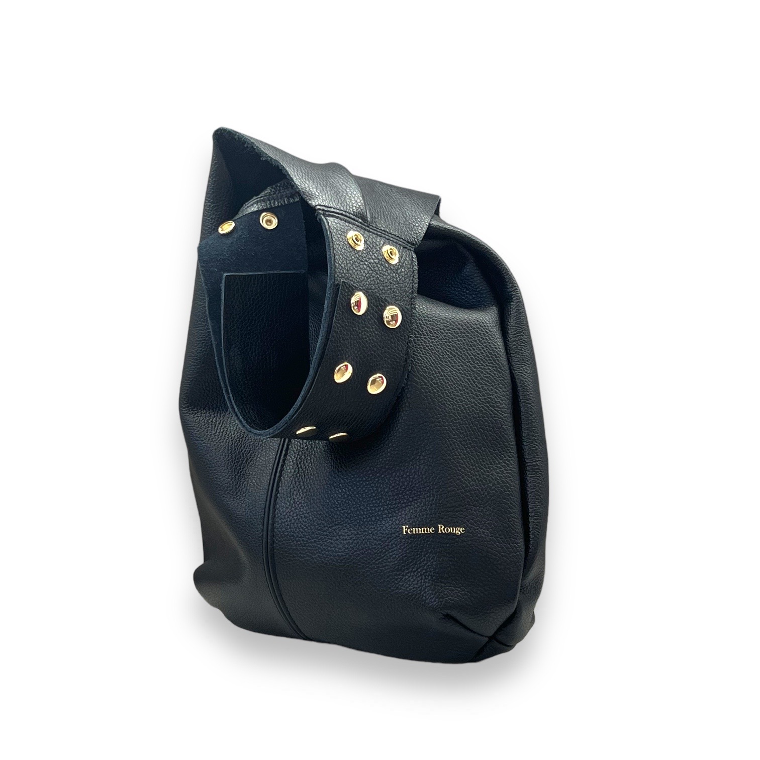 La Borsa Coachella FEMME ROUGE, รจ una borsa in pelle di vitello martellata con manico regolabile in pelle con borchie. Chiusura con bottone in metallo. Bustone interni in jeans. Finiture oro.