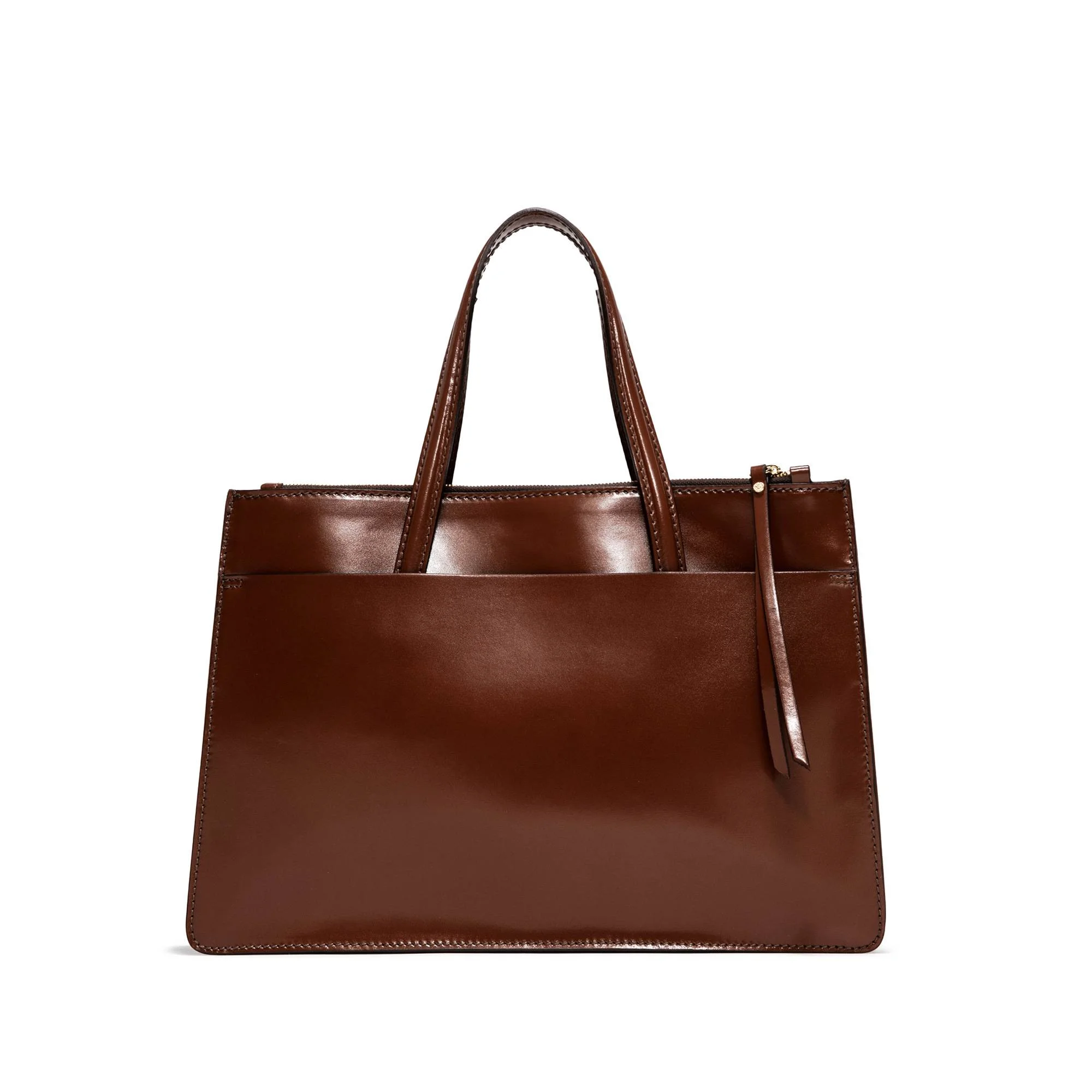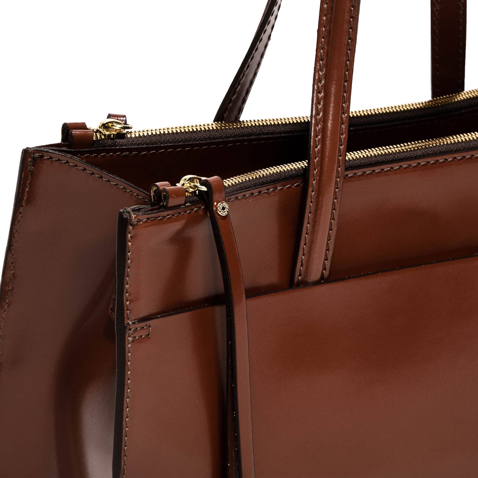 Realizzata in pelle liscia da portare a mano con i suoi manici fissi in tono o con la tracolla in tessuto. Al suo interno due taschine. Chiusura con zip. Per rendere ancora piรน esclusiva la Empire ha altre due tasche con chiusura a zip e due tasche piatte sul fronte e sul retro.