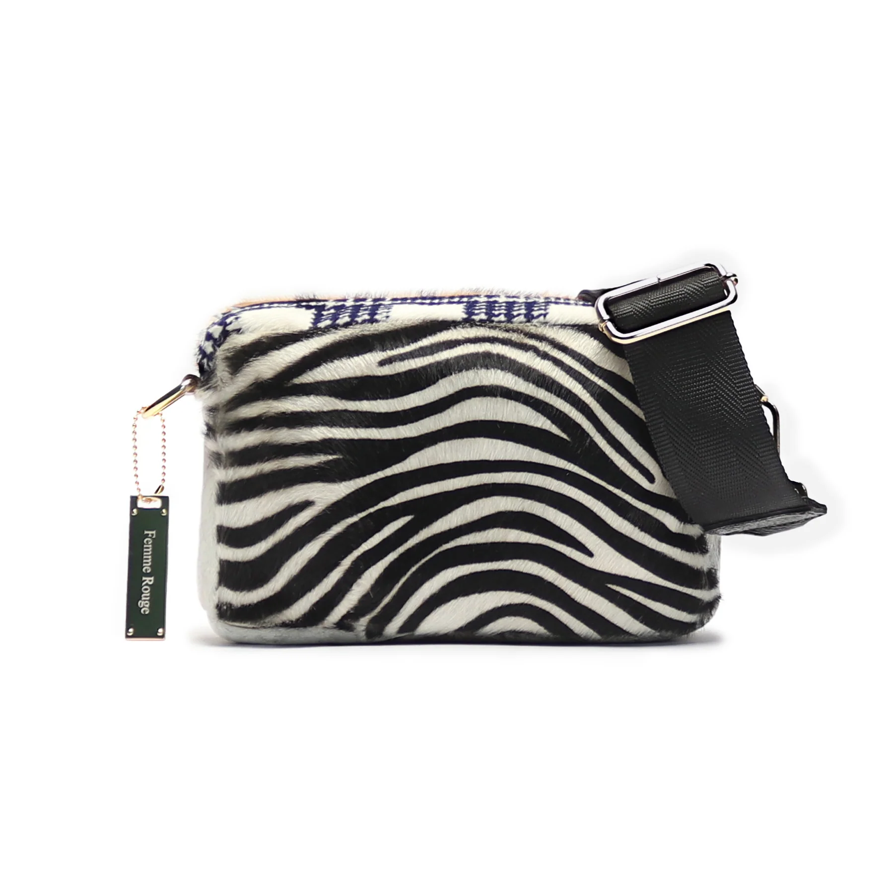 La Borsa Fur Lux FEMME ROUGE by ALMALA, รจ una borsa a tracolla patch di fantasie diverse in pelo di bovino con tracolla in tessuto regolabile e removibile. Finiture oro.