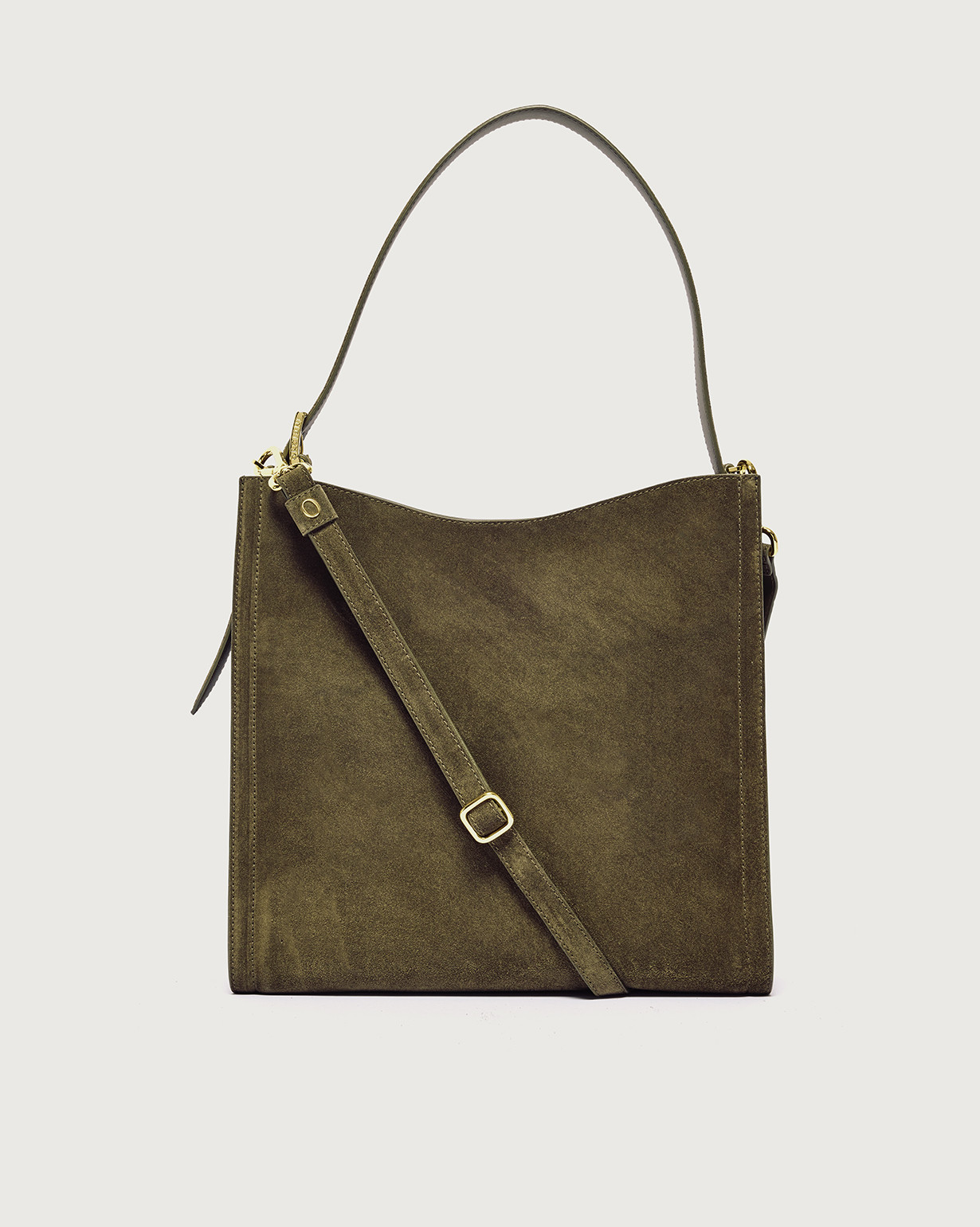 Borsa HEr-O Peach midi suede Dimensioni: Larghezza: 33 cm / Altezza: 33 cm / Profonditร : 11 cm Tasche: 3 interne, di cui una con zip Chiusura: con bottone magnetico Funzionalitร : manico a spalla regolabile con fibbia, tracolla aggiuntiva regolabile Materiale: suede Dettagli: metallerie finitura oro lucido Made in Italy