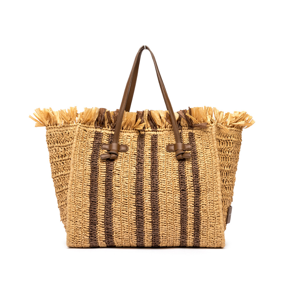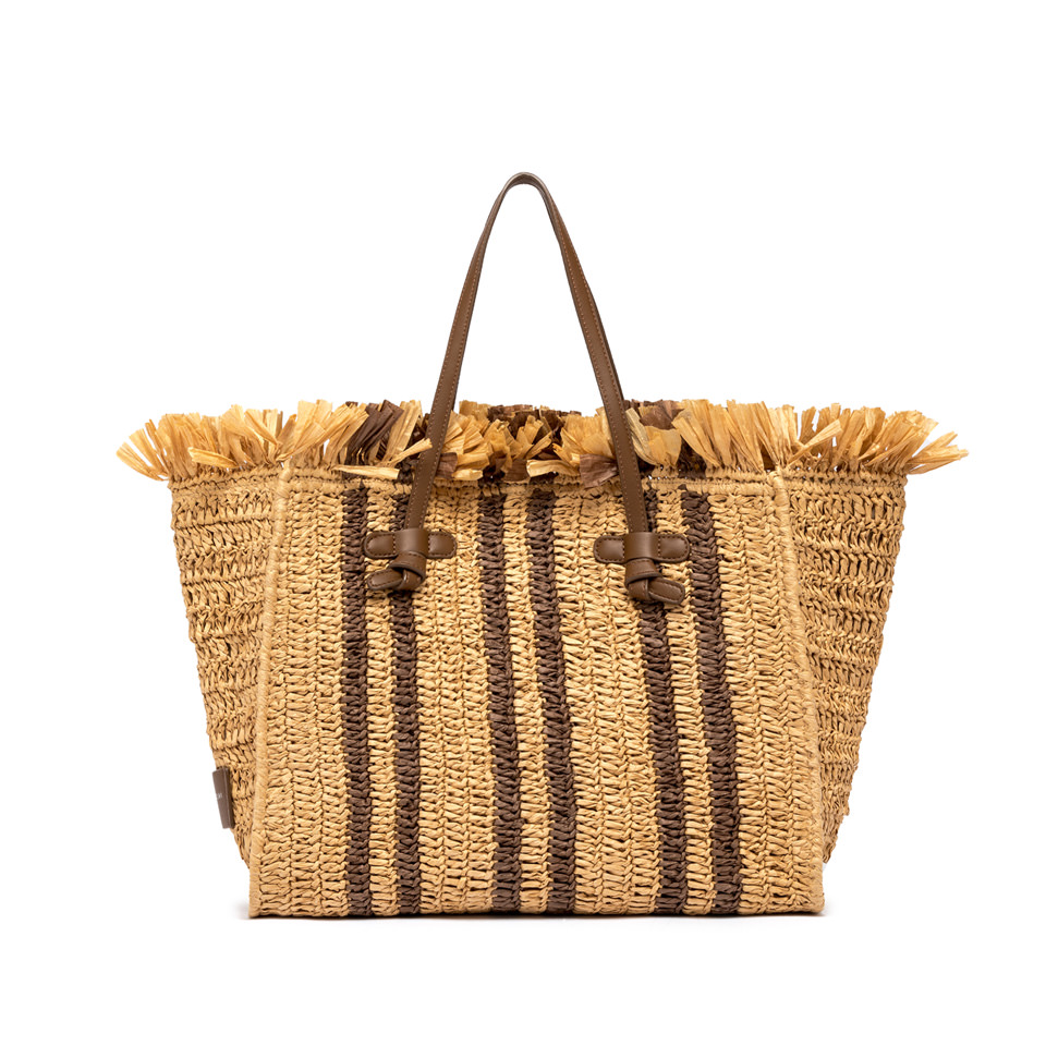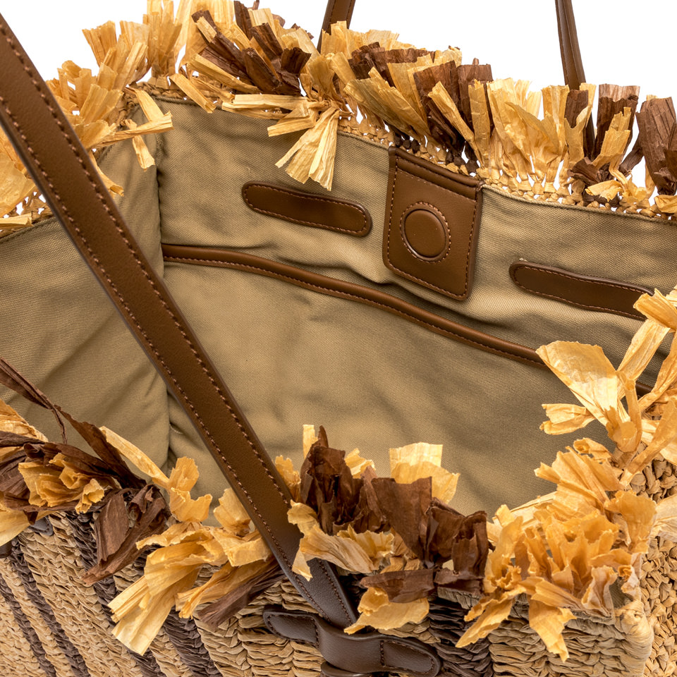 Realizzata in materiale effetto paglia Lavorazione ad uncinetto effetto handmade Formato extra con bande jacquard e frange di diverse lunghezze Dotata di iconici manici con il nodo Comoda chiusura tramite magnete Composizione: Esterno 95% Rafia 5%Poliuretano Interno 95 Cotone 5% Poliuretano Dimensioni: 38x31x16 cm.