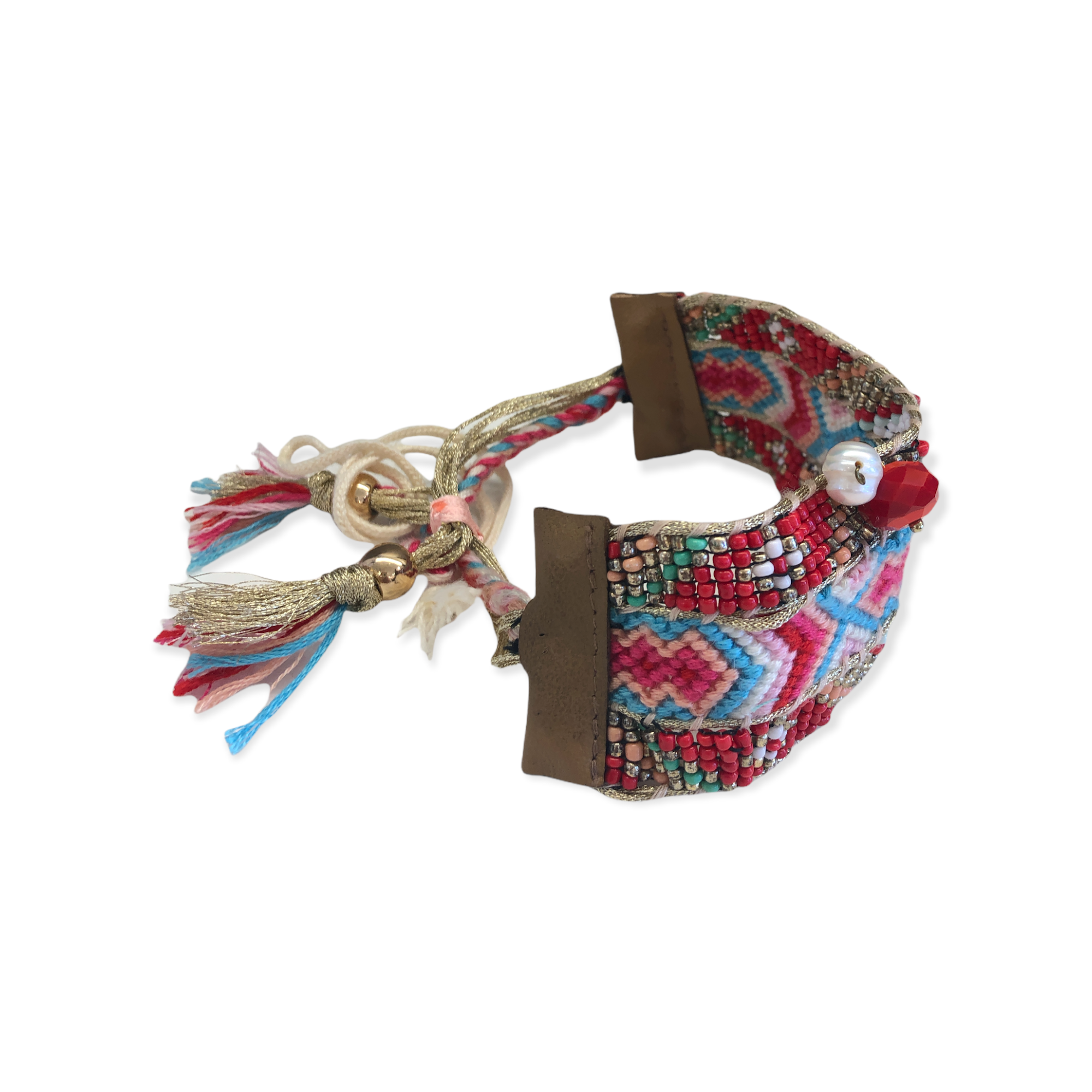 Il bracciale Kos ALMALA, รจ un bracciale in tessuto ricamato a mano con pietre dure, rifiniture in pelle.