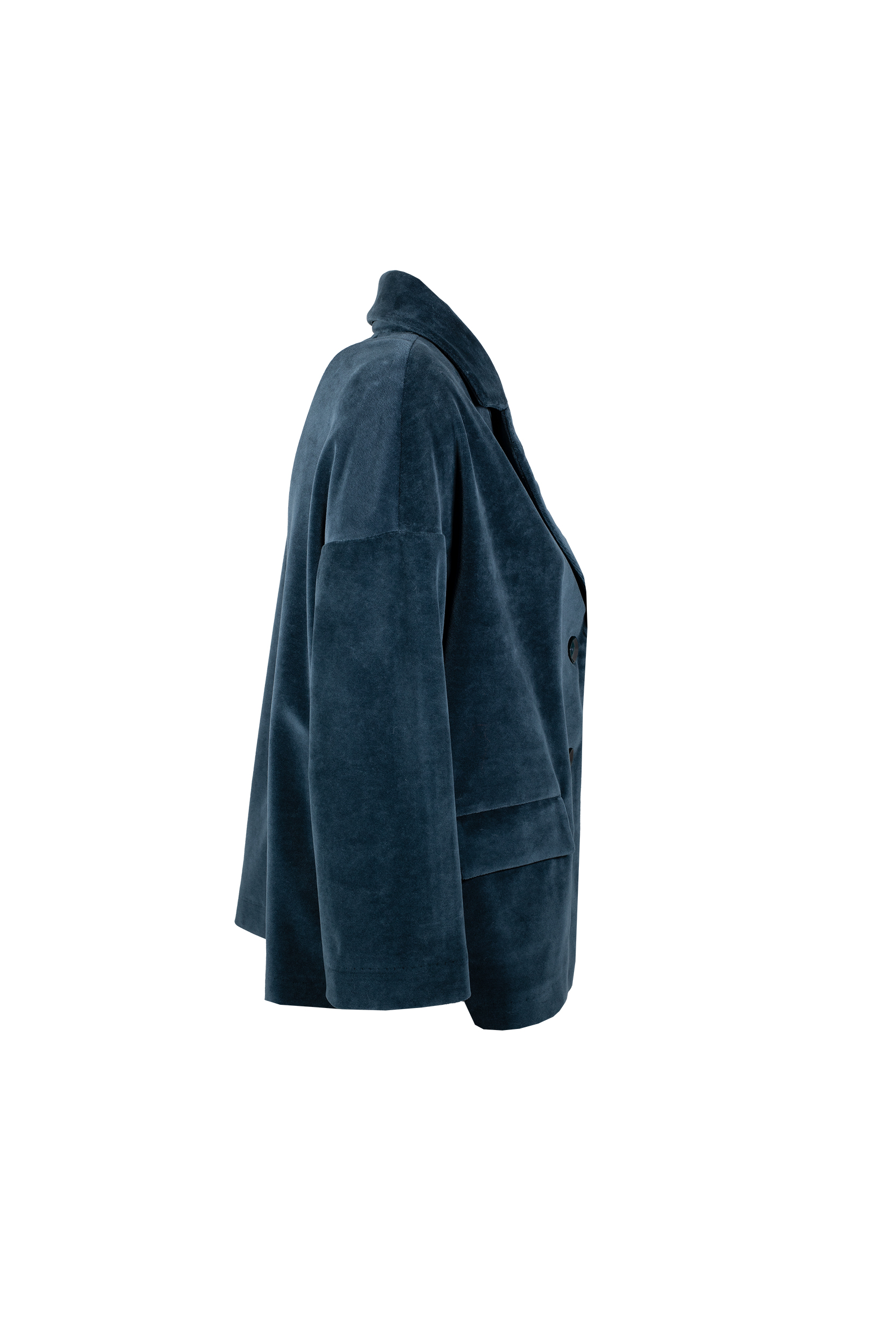 Caban in velluto liscio Chiusura a due bottoni Rever Due tasche a patta Materiale: Velluto Composizione: 80% Cotone 20% Poliestere