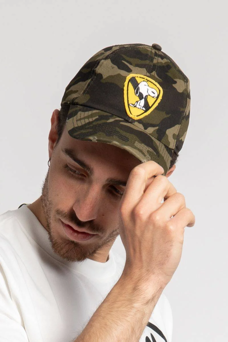 Scopri su Charme Roma il cappello fantasia militare con Snoopy. Cappello camuflace con patches di Snoopy applicate, 100% cotone.