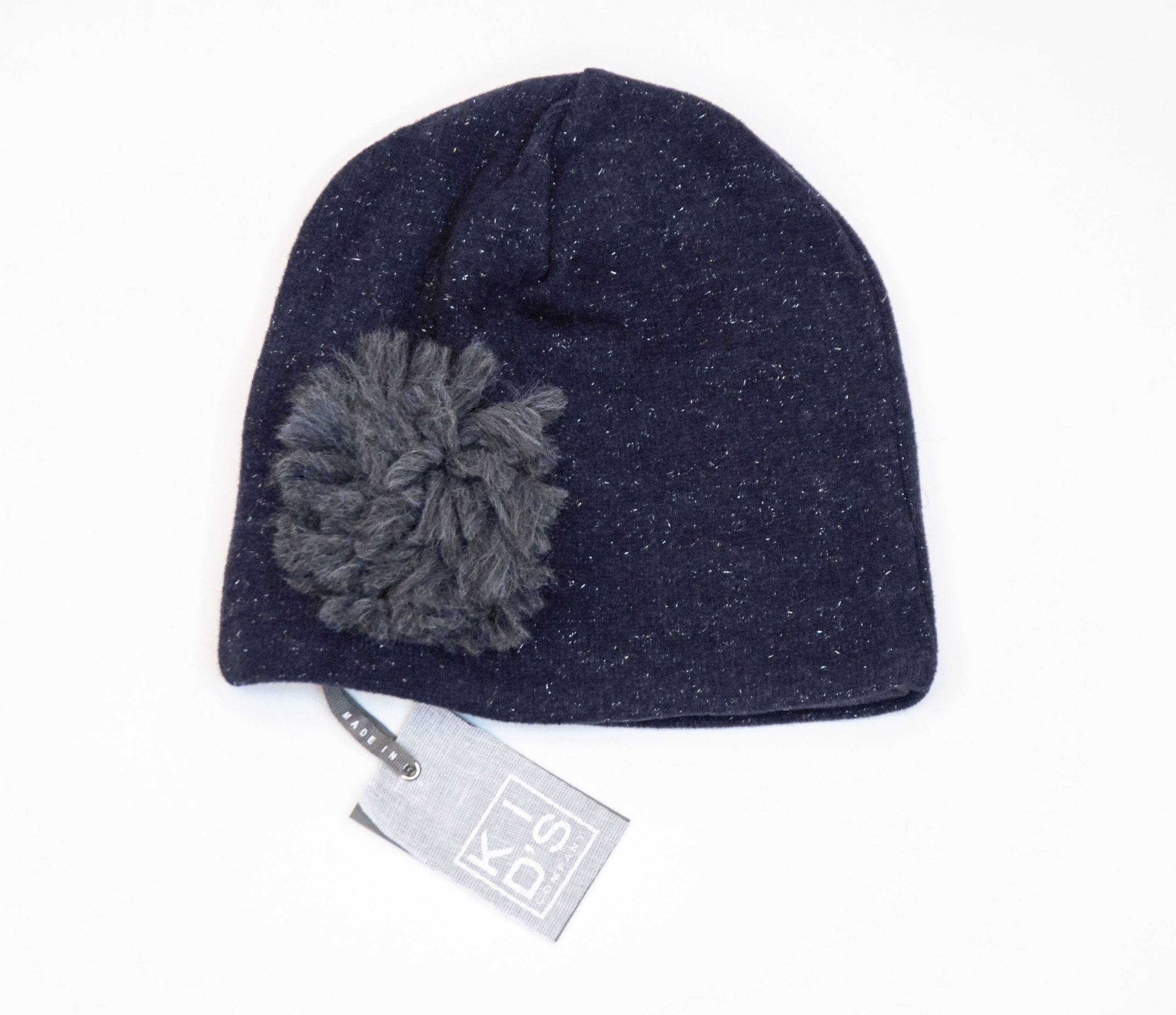 Cappello bimba Kid’s Company blu in caldo cotone con inserti in lurex e pon pon grigio laterale.