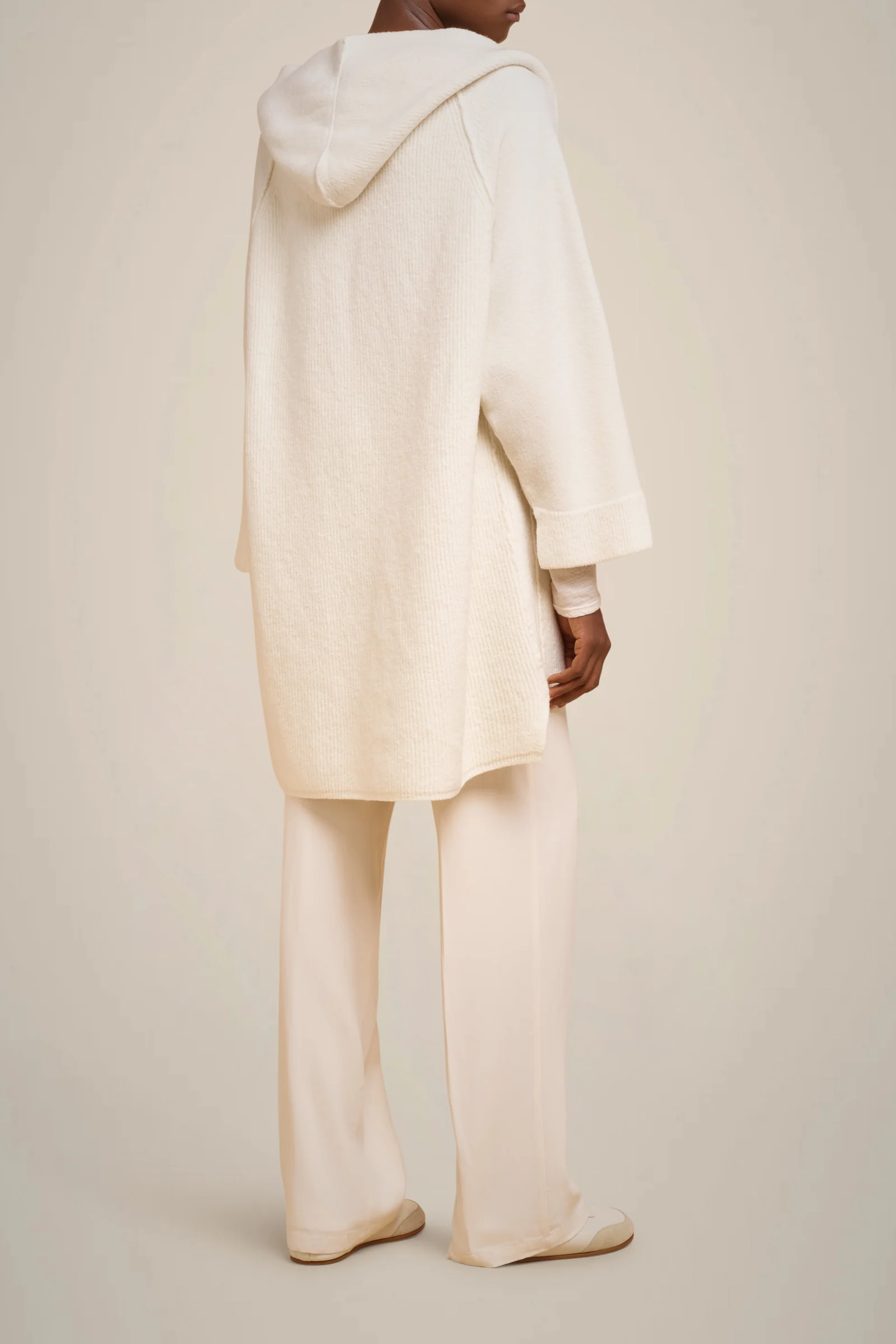 Cappotto in lana infeltrita Con cappuccio Apertura vis a vis Manica lunga taglio raglan con polsino asimmetrico Tasche a toppa frontale Fondo asimmetrico Composizione: 100% LANA VERGINE Made in ITALY Vestibilitร Relax