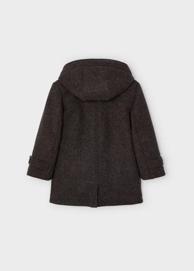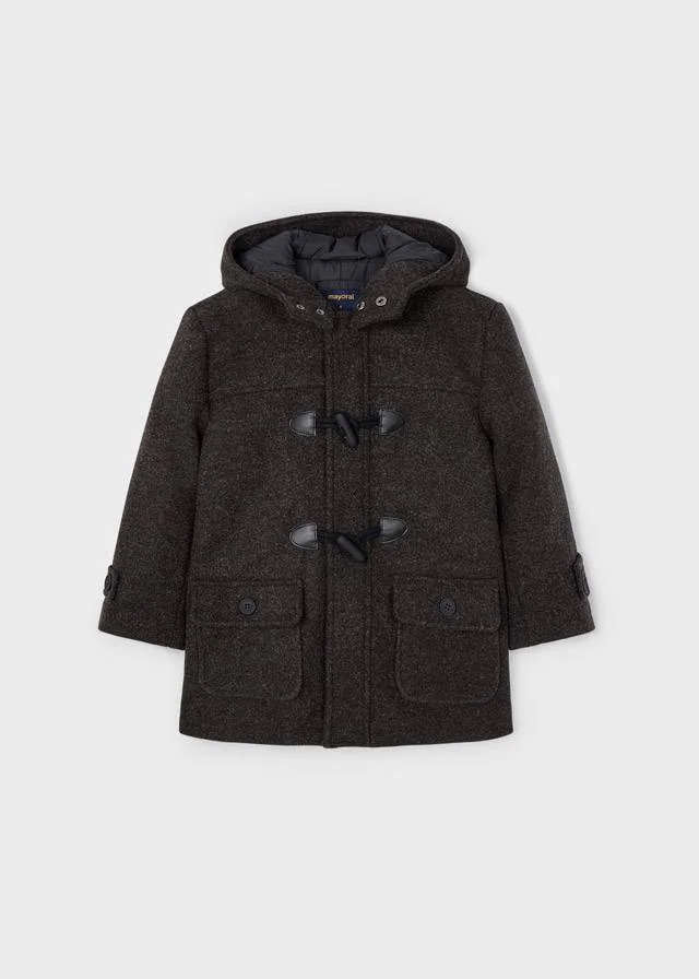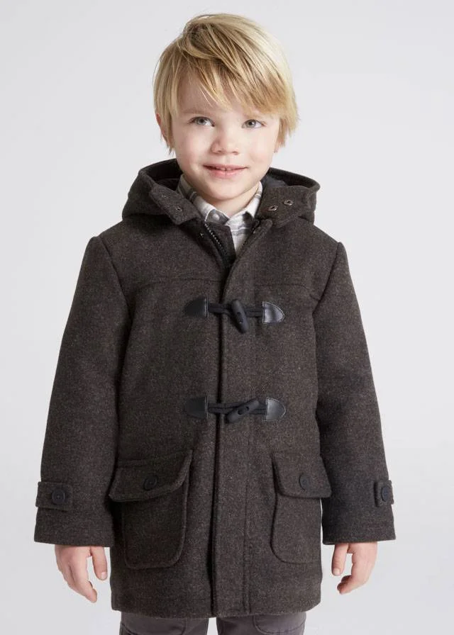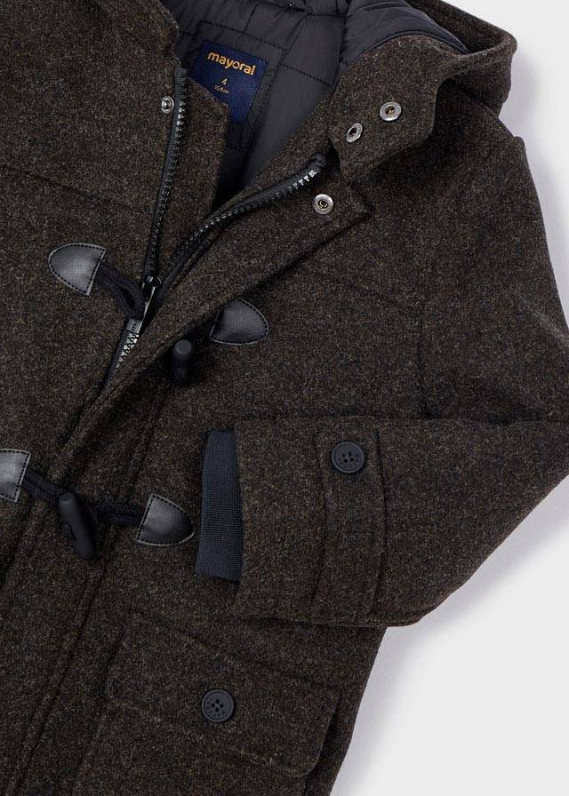 Cappotto Mayoral modello trench manica lunga per bambino. Modello con cappuccio. Chiusura con cerniera anteriore e alamari. Caldo tessuto di panno resistente e classico.Tasche funzionali nella parte anteriore.